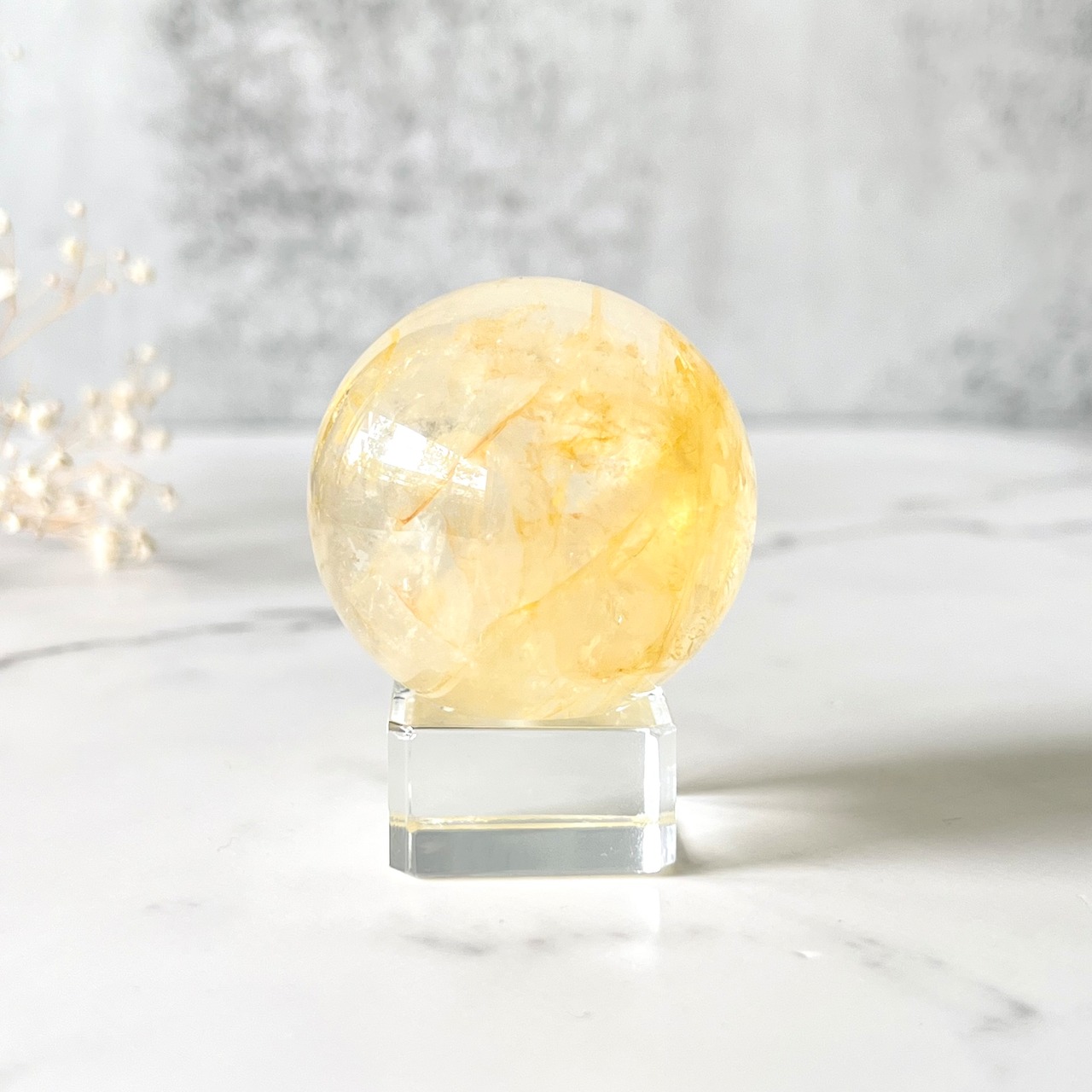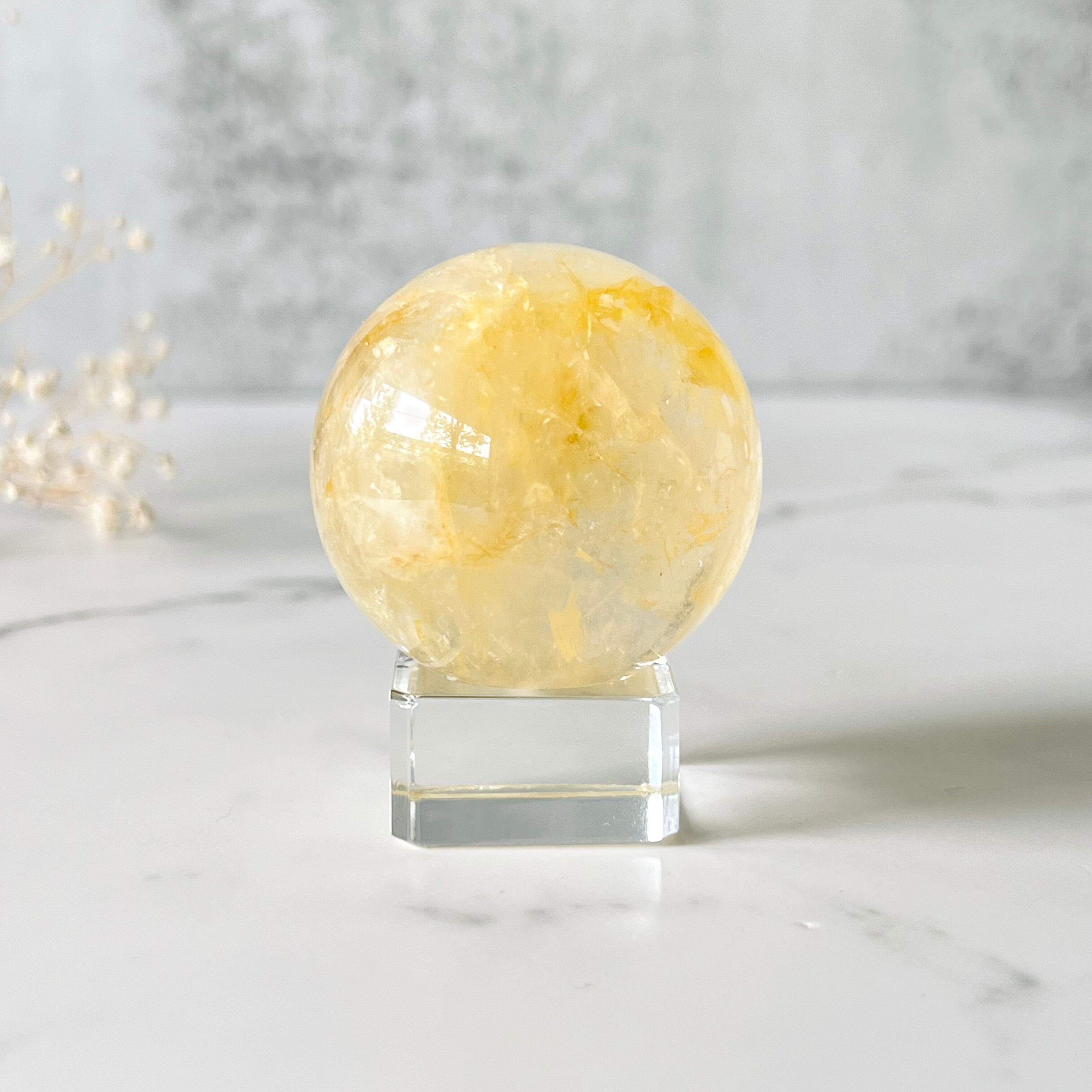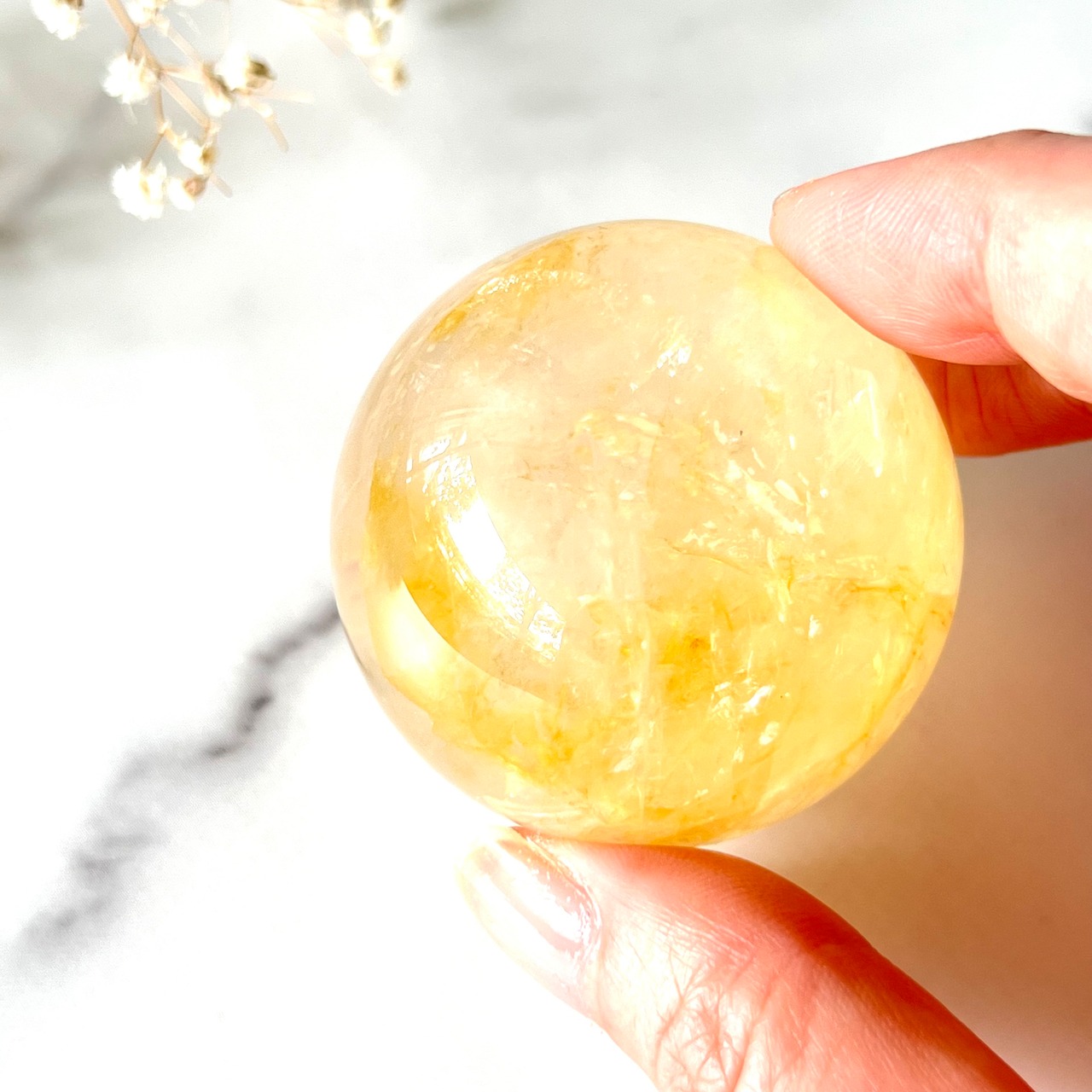 透明度が高く明るくクリアなゴールドイエローカラーがみずみずしい印象のスフィアです。虹もたっぷりと入ります。