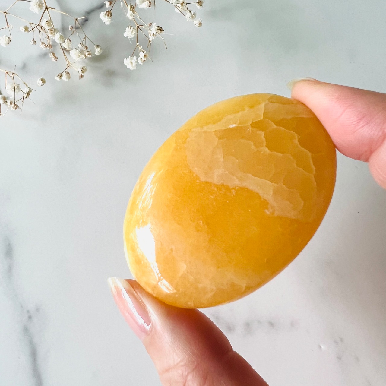 フレッシュなオレンジゼリーのようにぷるぷるで艶やかなオレンジ色のオレンジカルサイトのパームストーンです。カルサイトのほんのり透け感のある軽やかな質感と、美しい発色が魅力です。