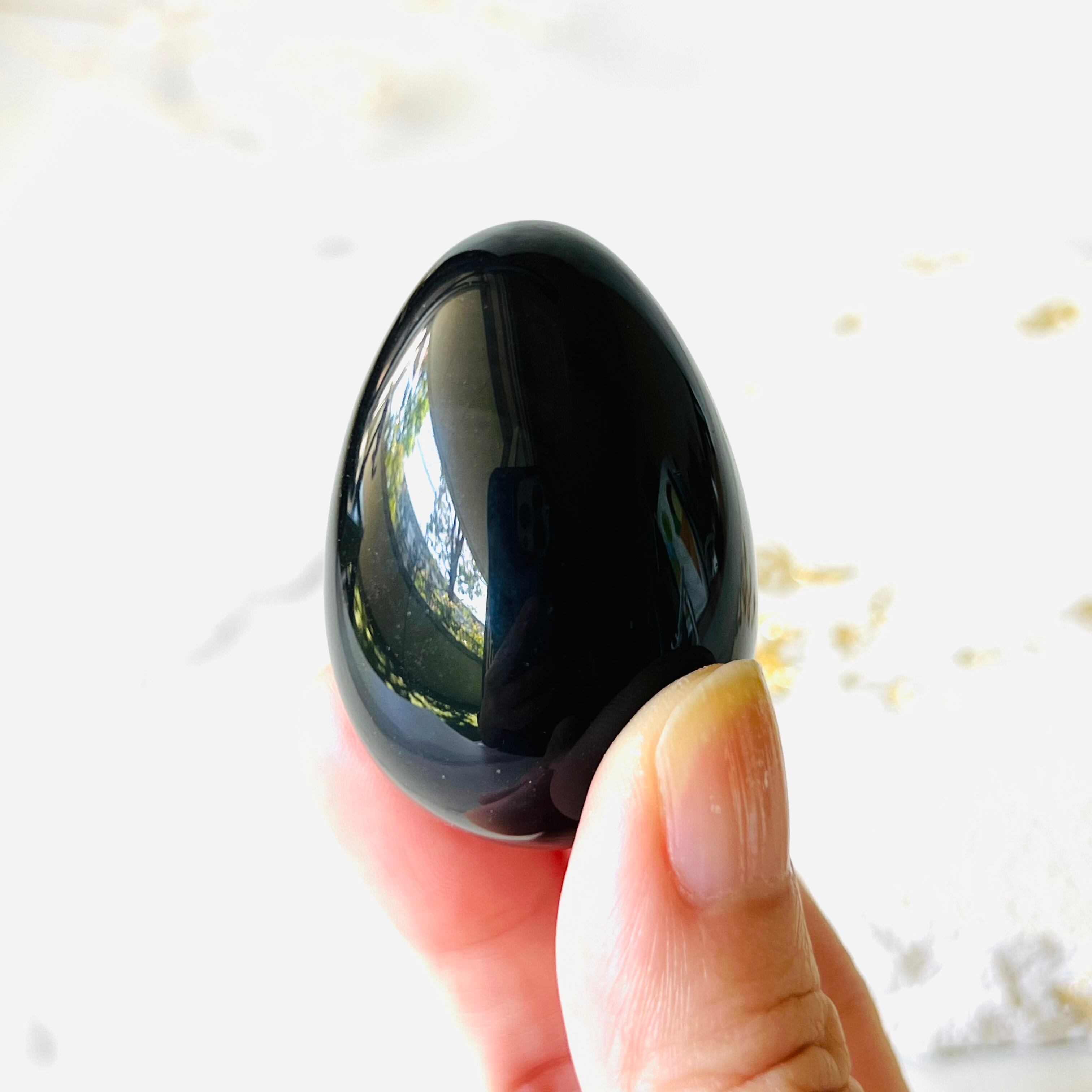 レインボーオブシディアンのエッグ型ストーンです。一見すると真っ黒な石に見えますが、内部にある微小な気泡群により、光の反射を受けてピンクやグリーン、イエローのシーン効果が見られます。