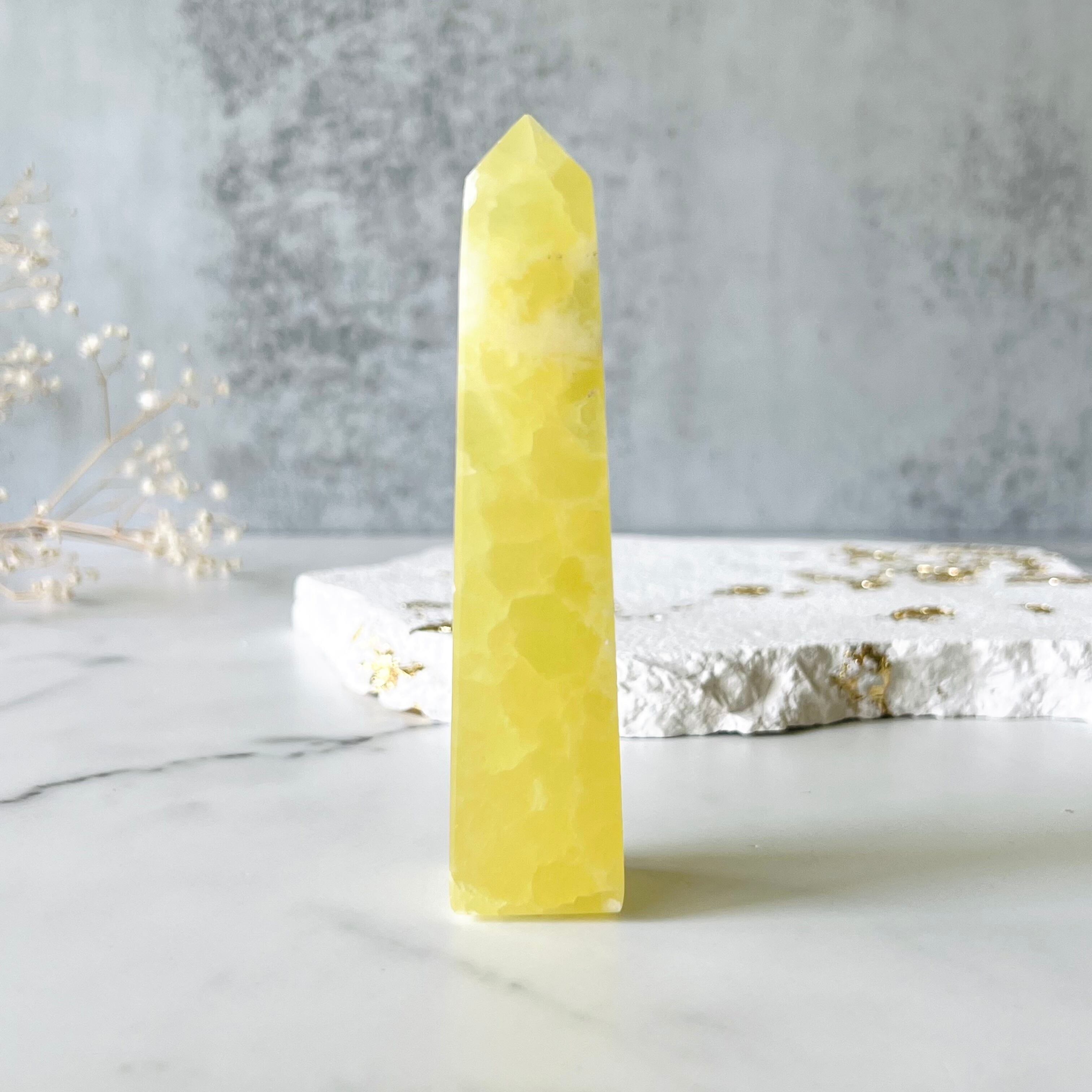綺麗なレモンイエローのレモンカルサイトタワーです。カルサイトのほんのり透け感のある軽やかな質感と、美しい発色が魅力です。
