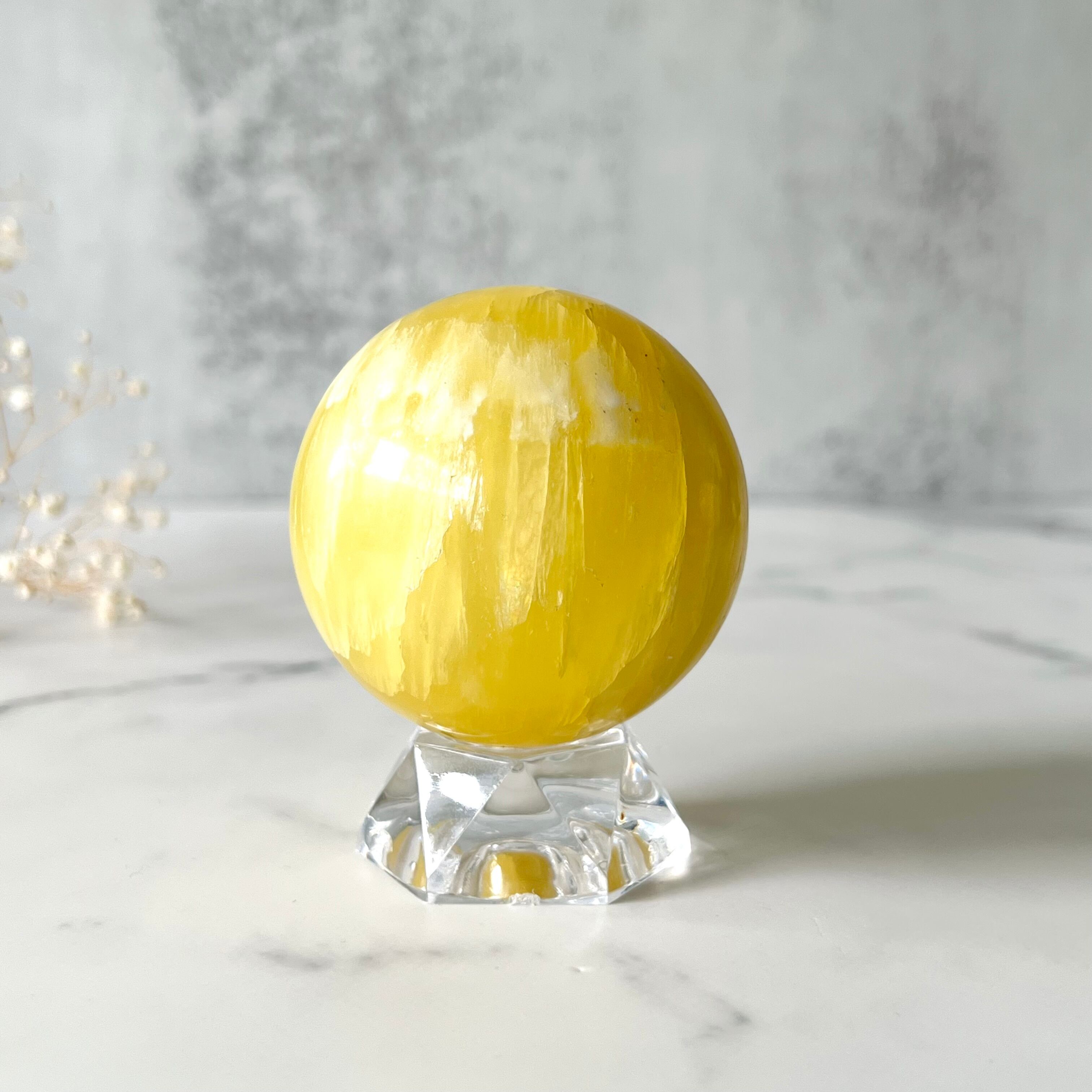 綺麗なレモンイエローのレモンカルサイトスフィアです。カルサイトのほんのり透け感のある軽やかな質感と、美しい発色が魅力です。