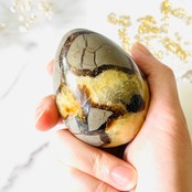 割れ目のような模様が印象的な石で、ハニーゴールドカルサイトと、茶色いアラゴナイトがあわさってできた天然石です。 見た目がドラゴンの卵や、恐竜の卵を連想させることからドラゴンストーンとも呼ばれます。