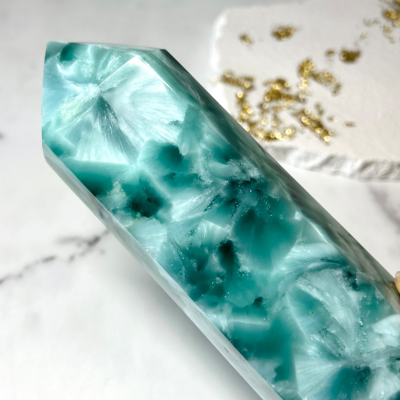 エメラルドグリーンと針が密集したような扇状の結晶の断面が美しいボルカニックグレーズドタワーです。光にあてるとフラッシュとラメがキラキラしてとても綺麗です。このエメラルドグリーンはおそらく染色で天然の色ではありません。