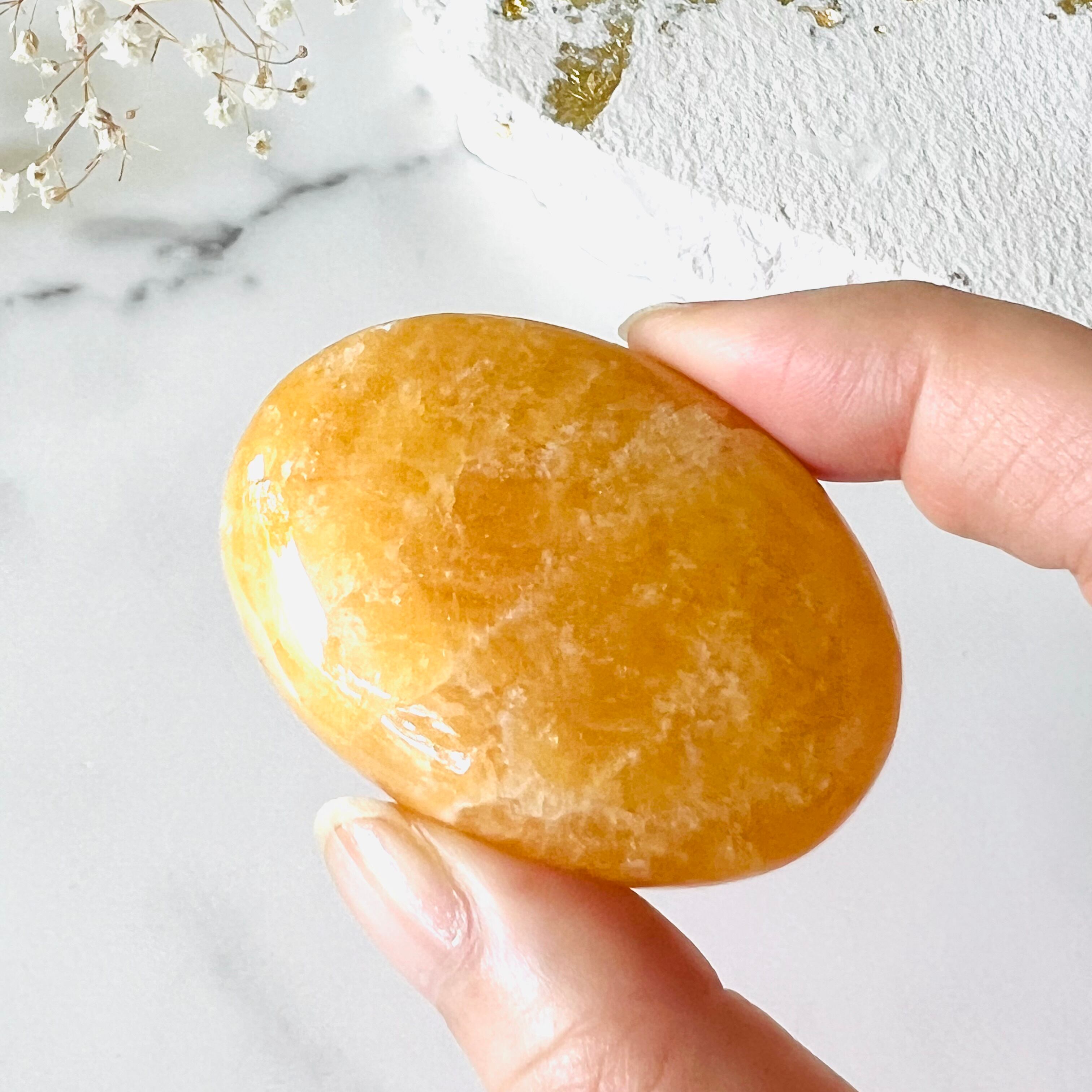 フレッシュなオレンジゼリーのようにぷるぷるで艶やかなオレンジ色のオレンジカルサイトのパームストーンです。カルサイトのほんのり透け感のある軽やかな質感と、美しい発色が魅力です。
