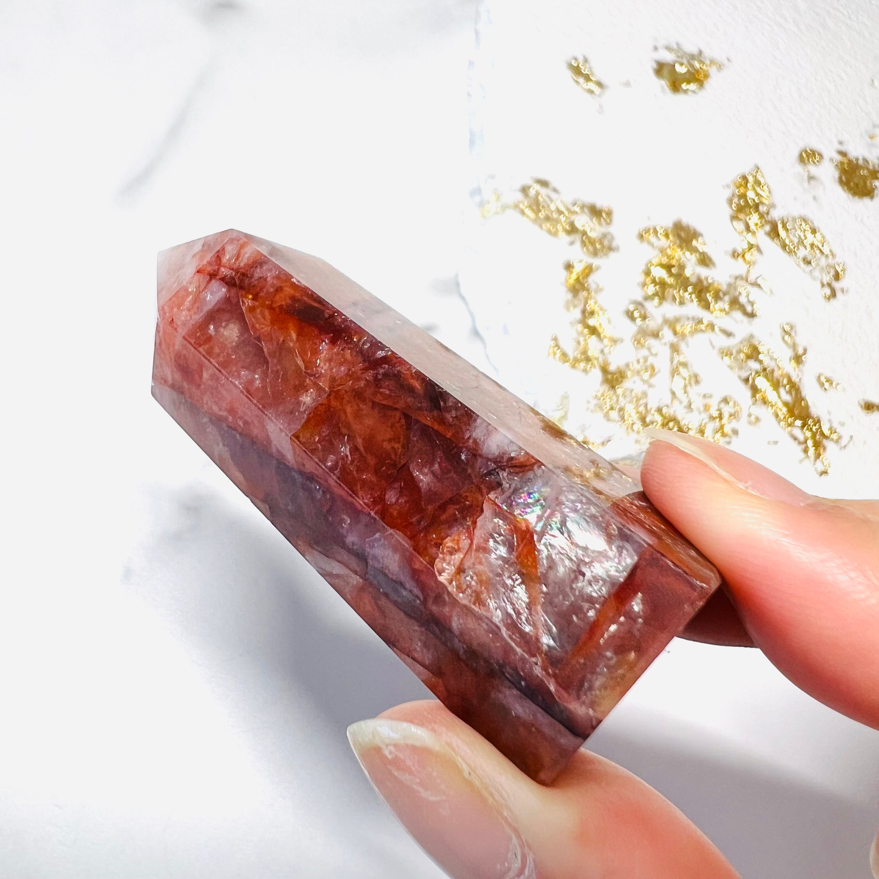 地球の心臓や血液を思わせるような、生命の鼓動を感じる情熱的な色合いのファイヤークォーツです。真紅の色合いが深く濃く美しく、その隙間から虹が輝き出します。