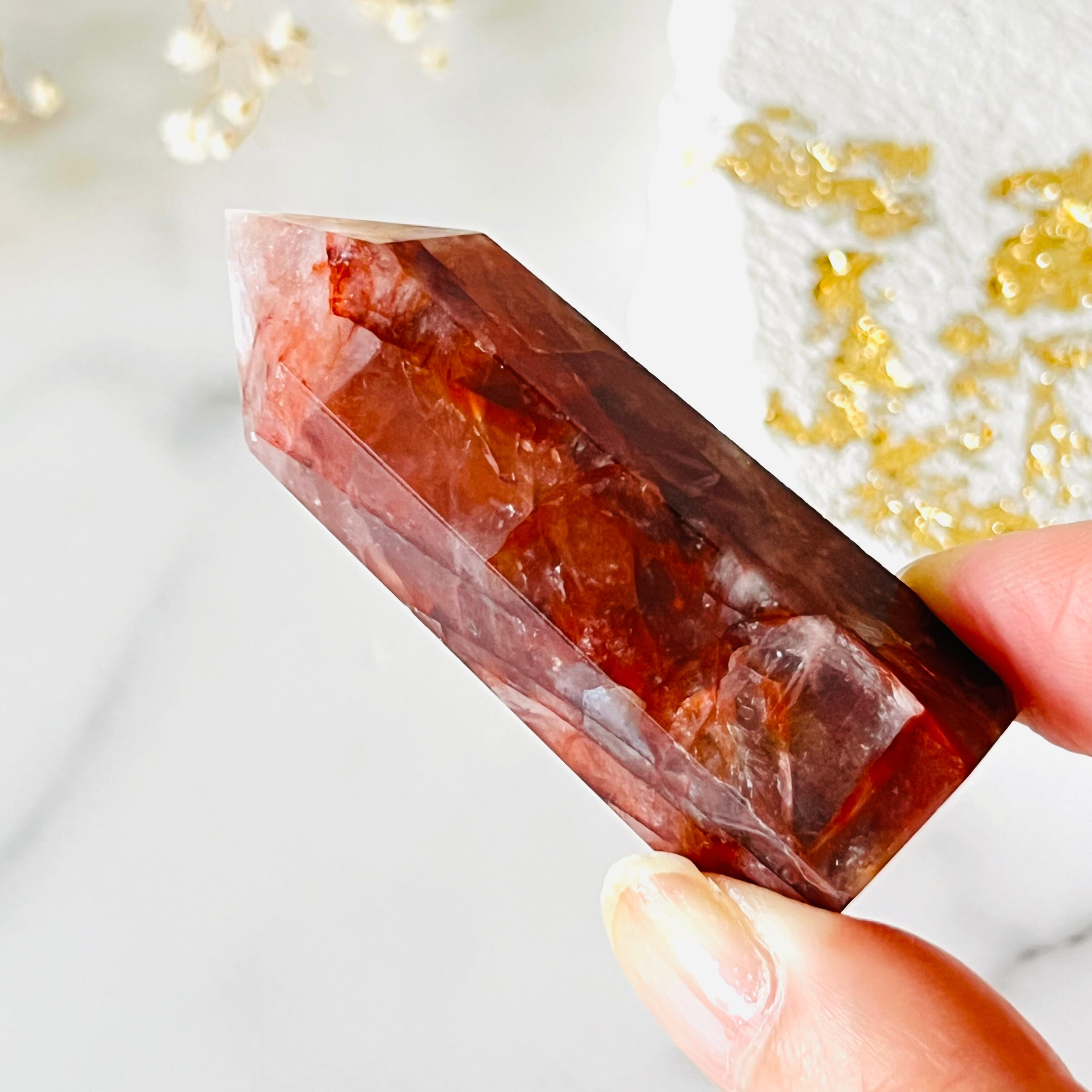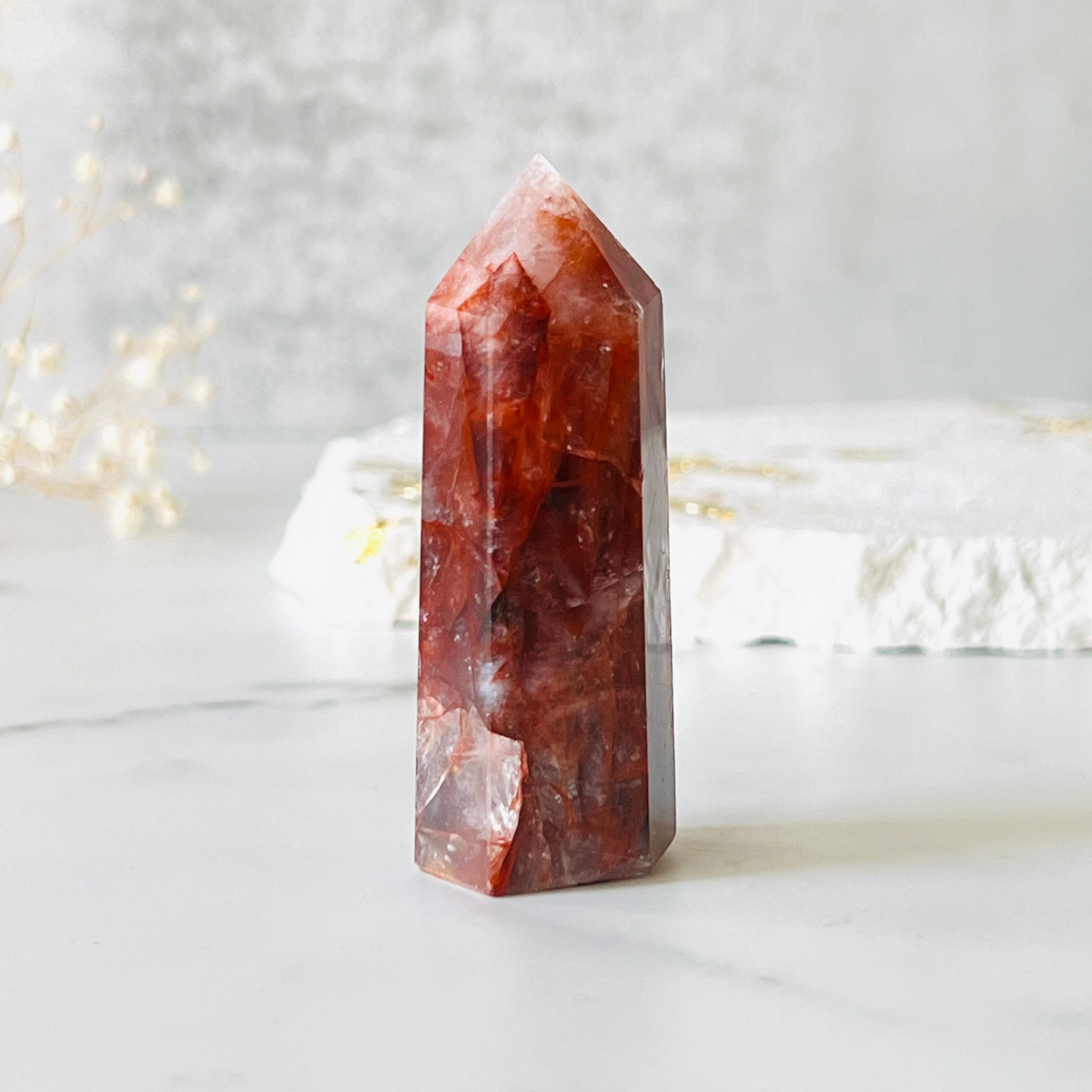 レピドクロサイトを内包した水晶で、別名「レピドクロサイト イン クォーツ」と言います。 スーパーセブンやストロベリークォーツと同じくクリスタルヒーラーに人気があるパワーストーンで、全体的に赤みを帯びていることから「情熱」「力強さ」を表し、持ち主に自信と決断力を与えると言われています。