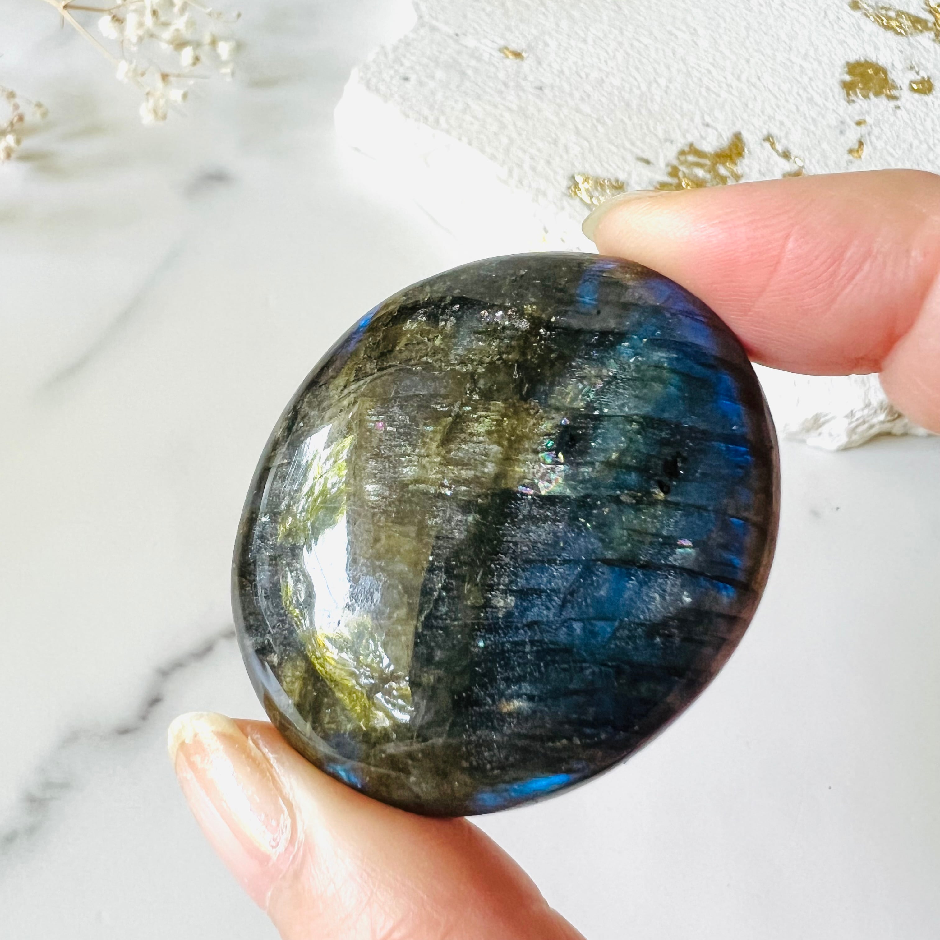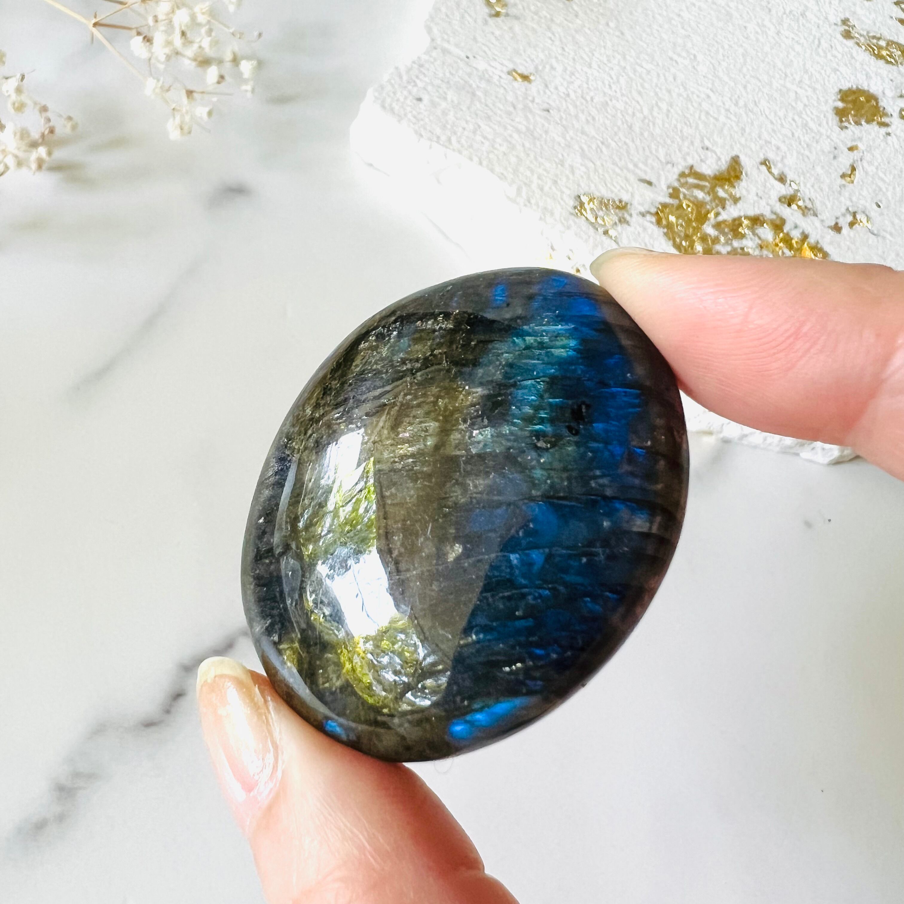 艶々の石肌がひんやりと心地よく手のひらに馴染みます。光にかざすと美しいブルーやライムグリーンのラブラドレッセンス、虹色の光を放つラメが浮かび上がります。