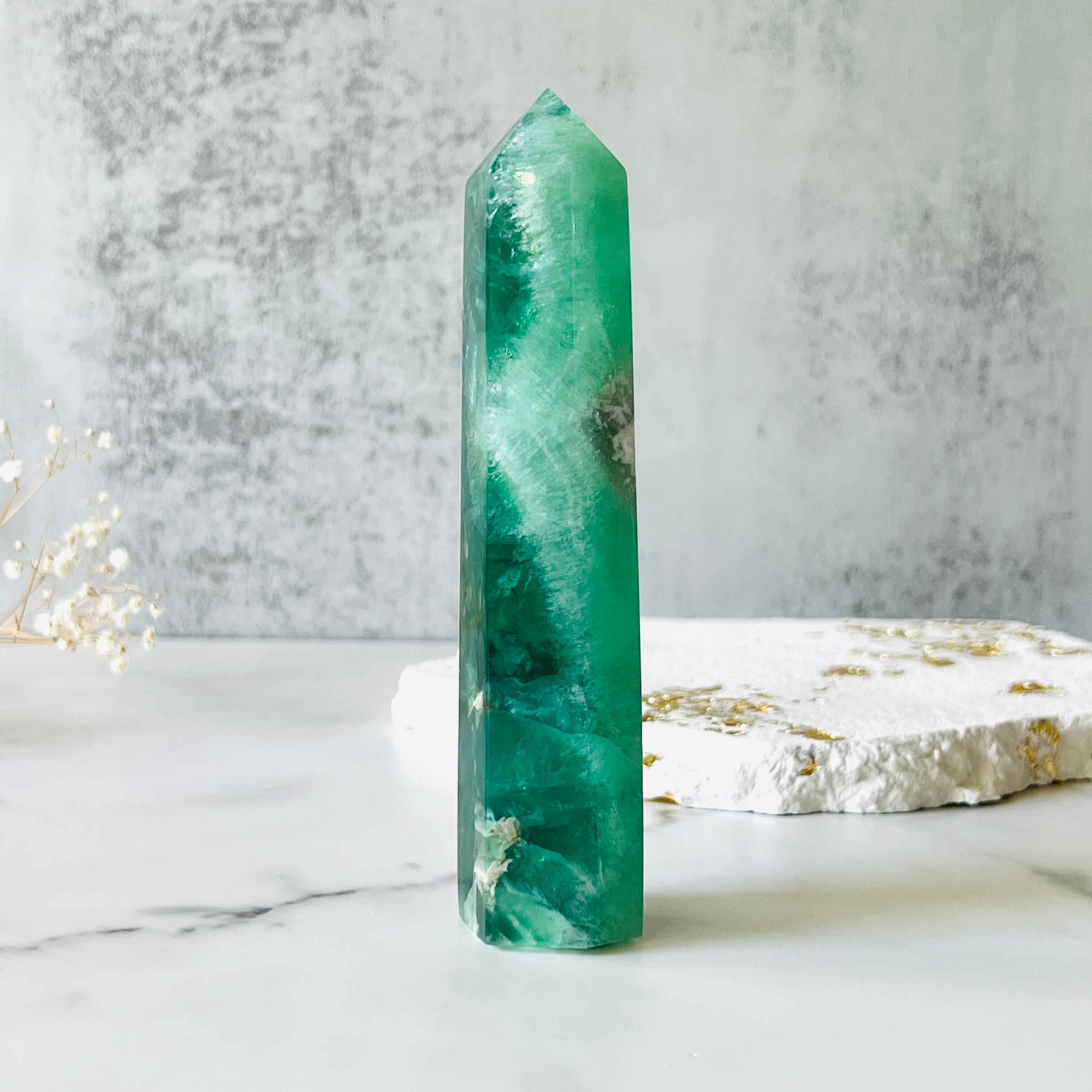 スキニーなフォルムにクリアなグリーンカラーのフローライト。半分はシャーベットのような、白い氷のような質感です。虹も入って、スッキリ爽やかなタワーです。