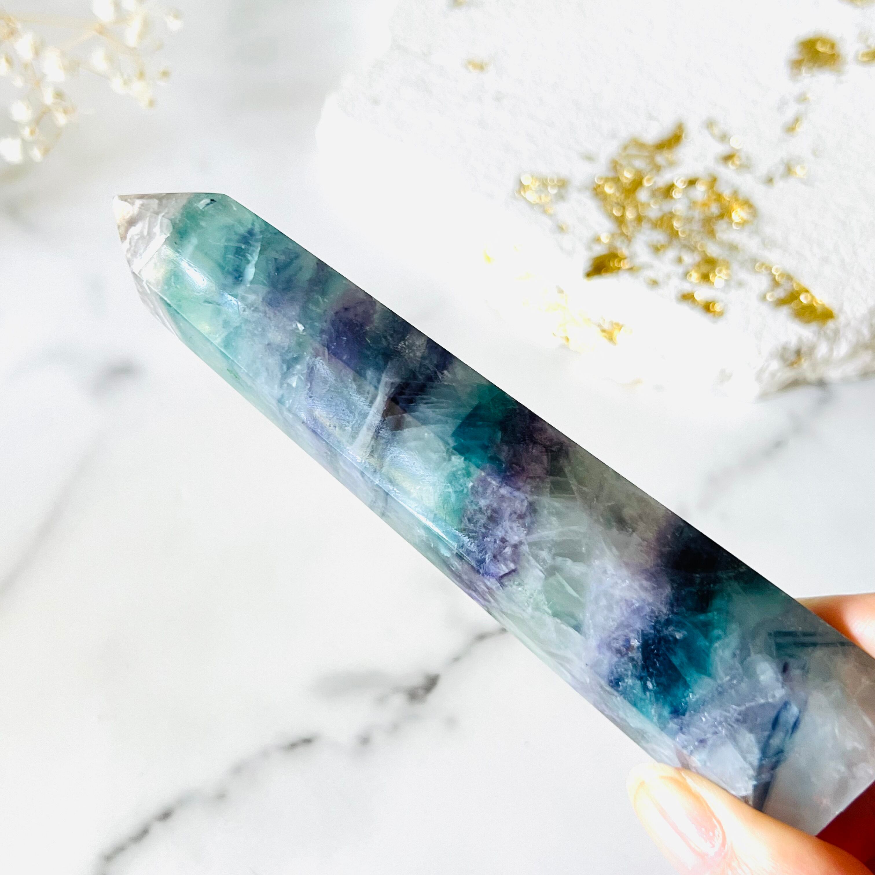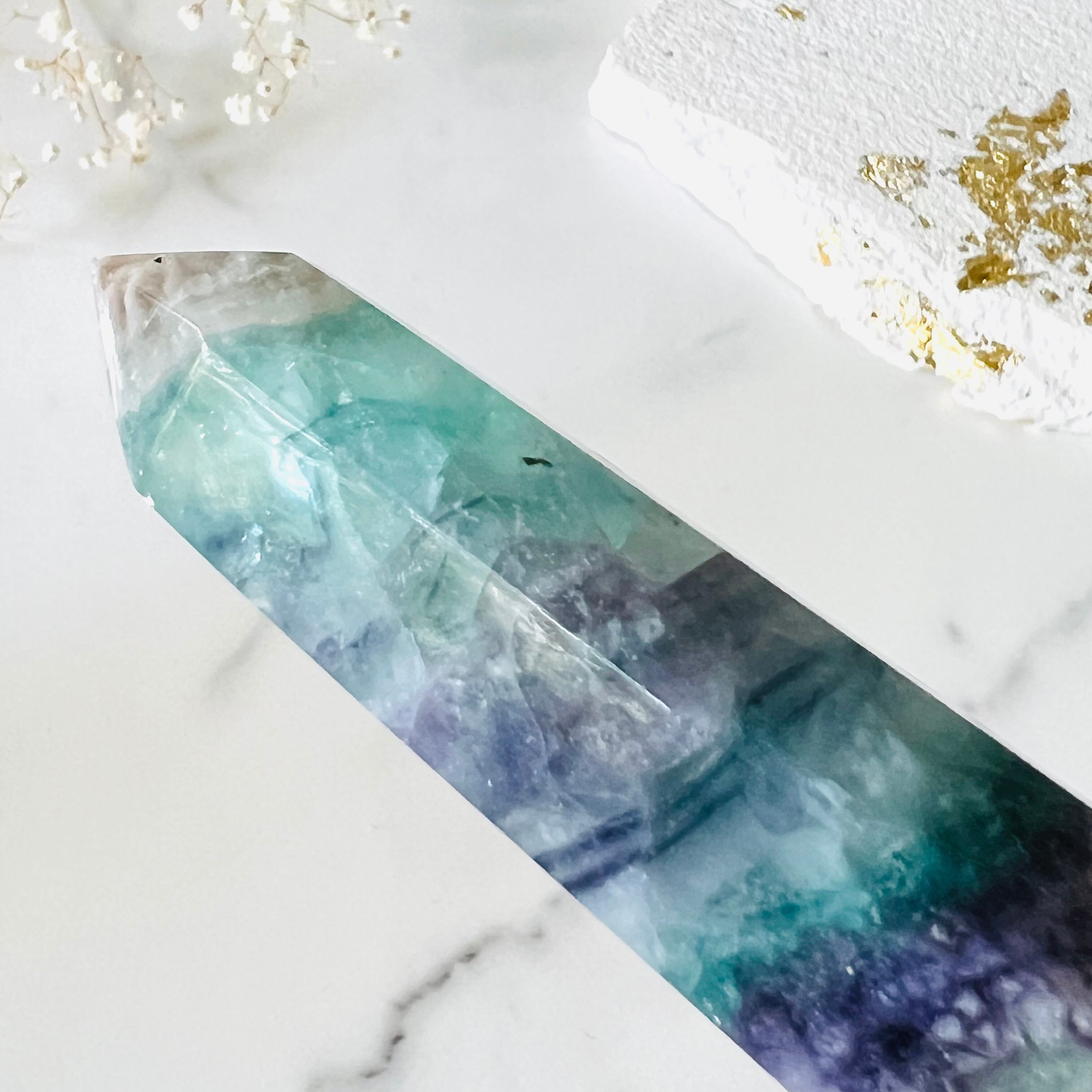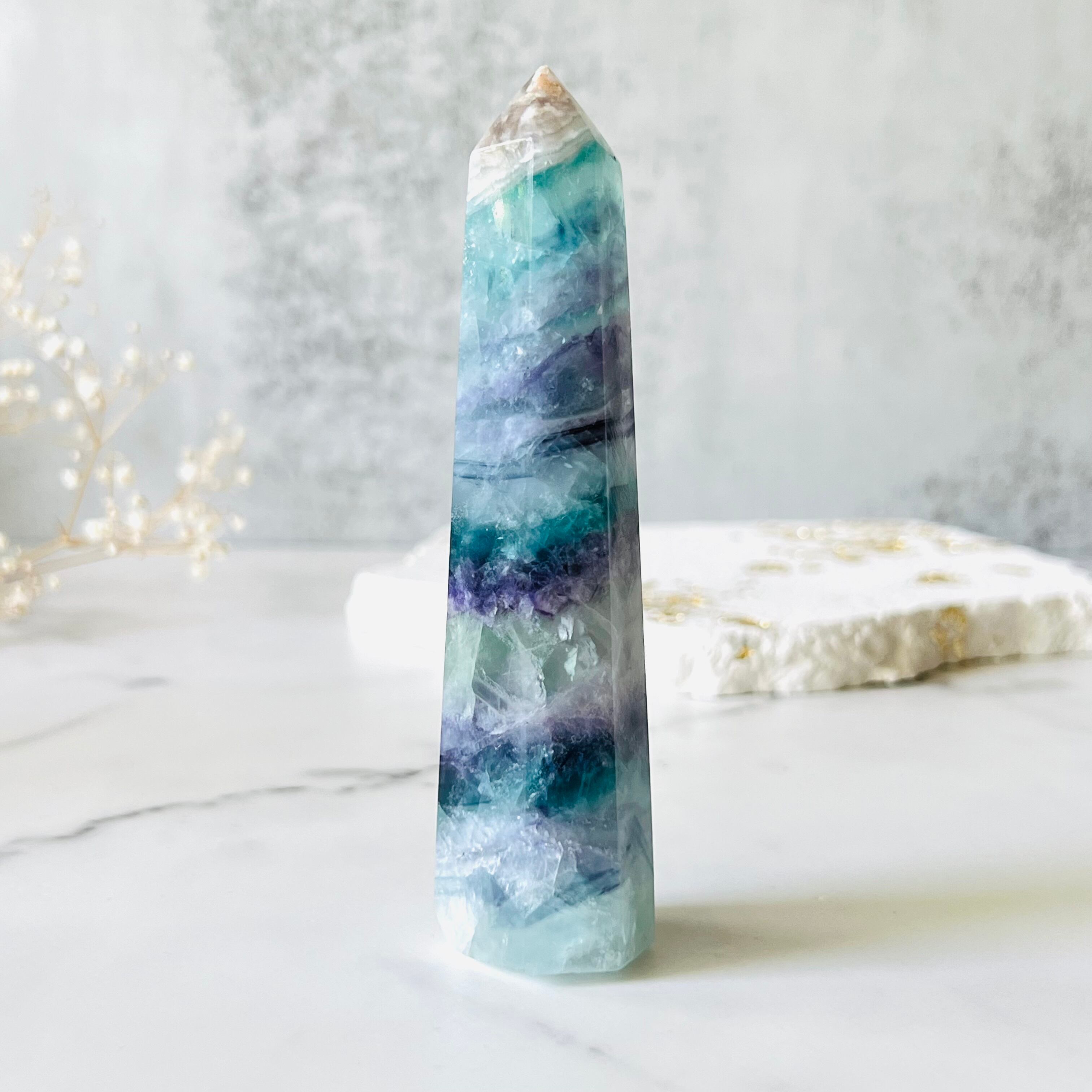 ホワイト、パープル、グリーンの3色が綺麗な縞模様を描いています。シャーベットのような質感でところどころ虹も入り、とても美しいタワーです。