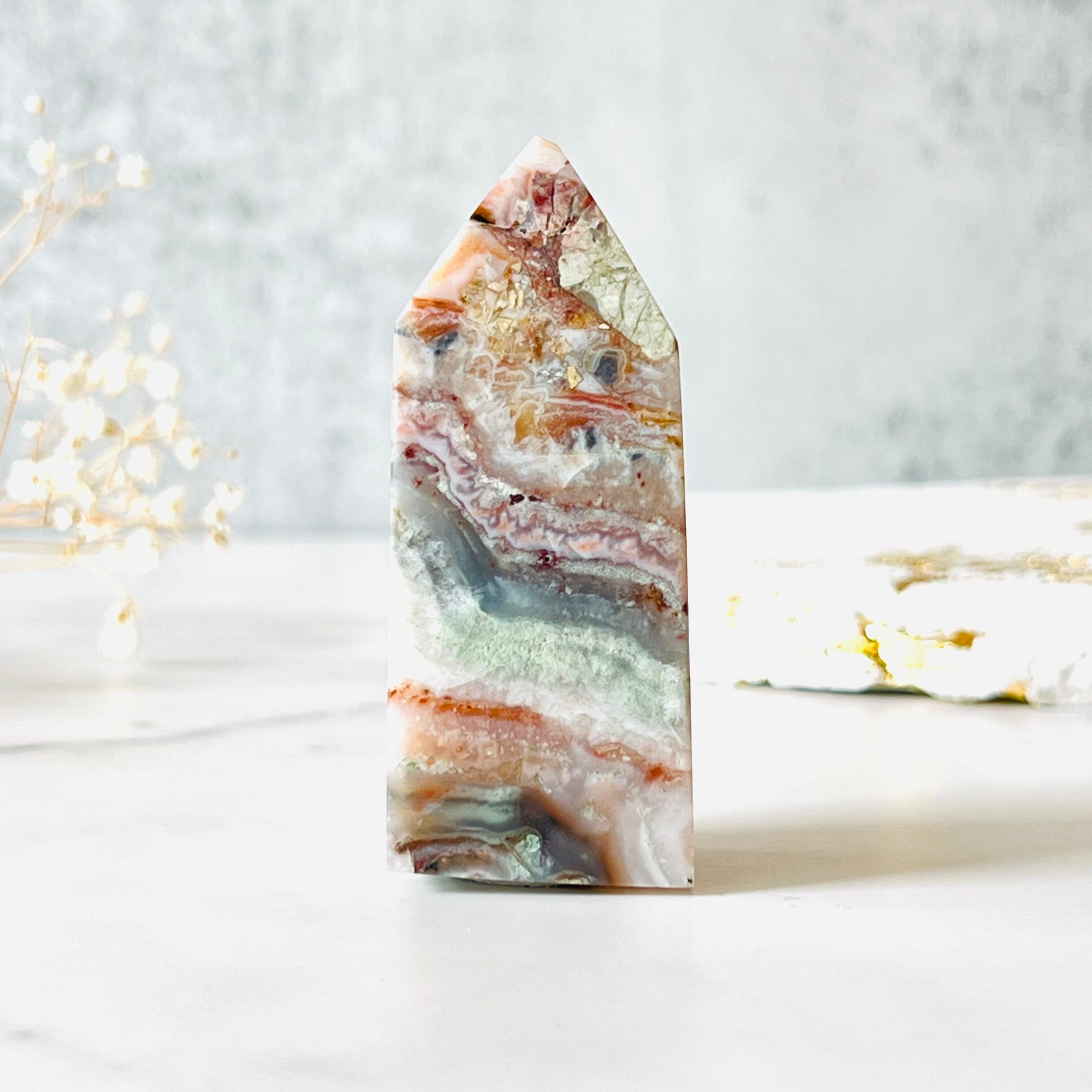 美しいパターンを持つシルキーアゲート。さまざまな素材と共生するアゲートは、ひとつひとつが複雑でアートな模様を描き出し、唯一無二の美しさを持ちます。