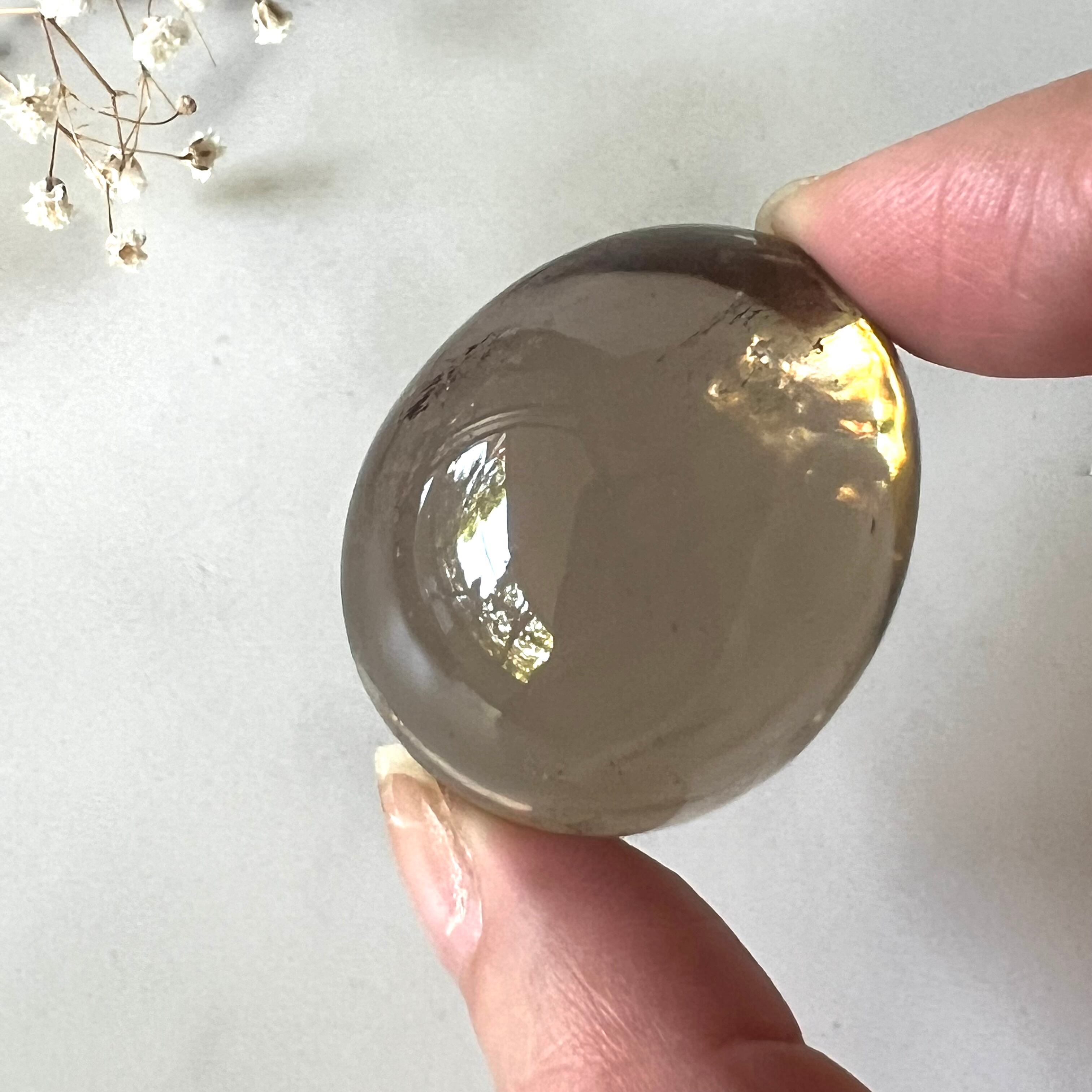 スモーキークォーツのエッグ型ストーンです。透明度が高く、クラックや内包物が少なくクリアですっきりとしたアイテムです。小さく虹も入ります。