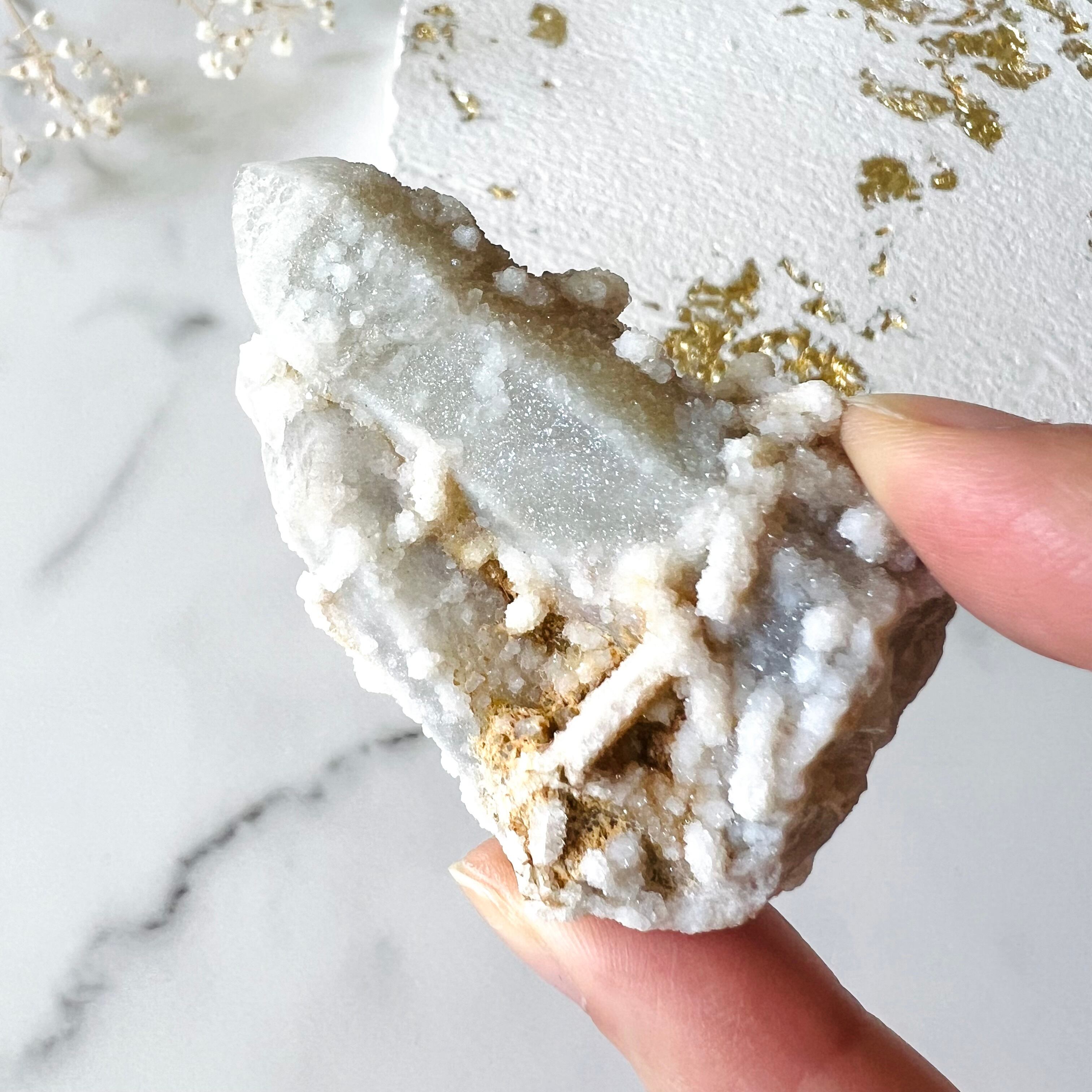 ユニークな外見をしていることで知られるスピリットクォーツで、アメジストの変種です。一般的には結晶柱の周りに細かな結晶が生えてサボテンのような姿をしていますが、このアイテムのような種類もあります。サボテン水晶、カクタスクォーツとも呼ばれます。