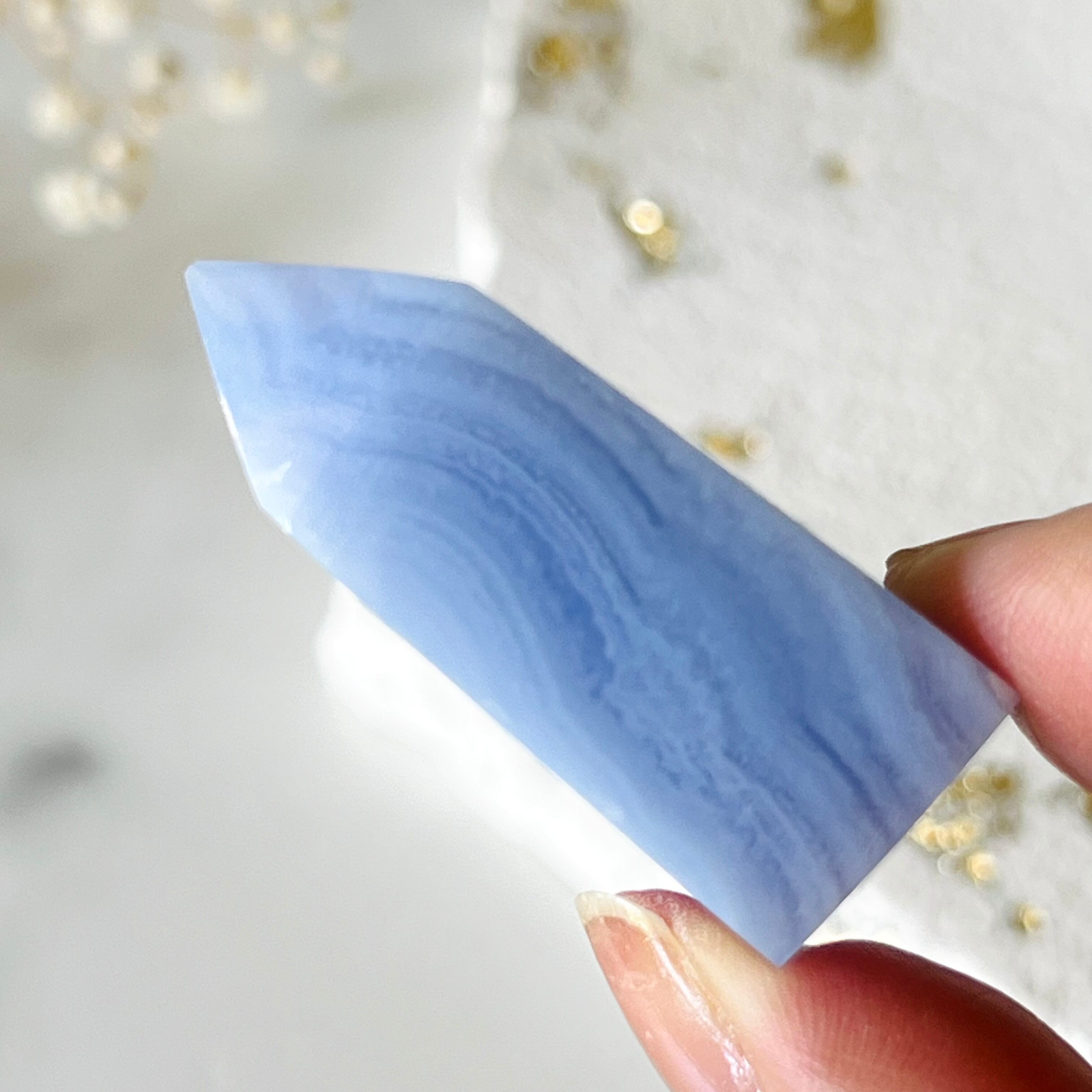 淡いサックスブルーが上品な印象のブルーレースアゲートのミニタワーです。