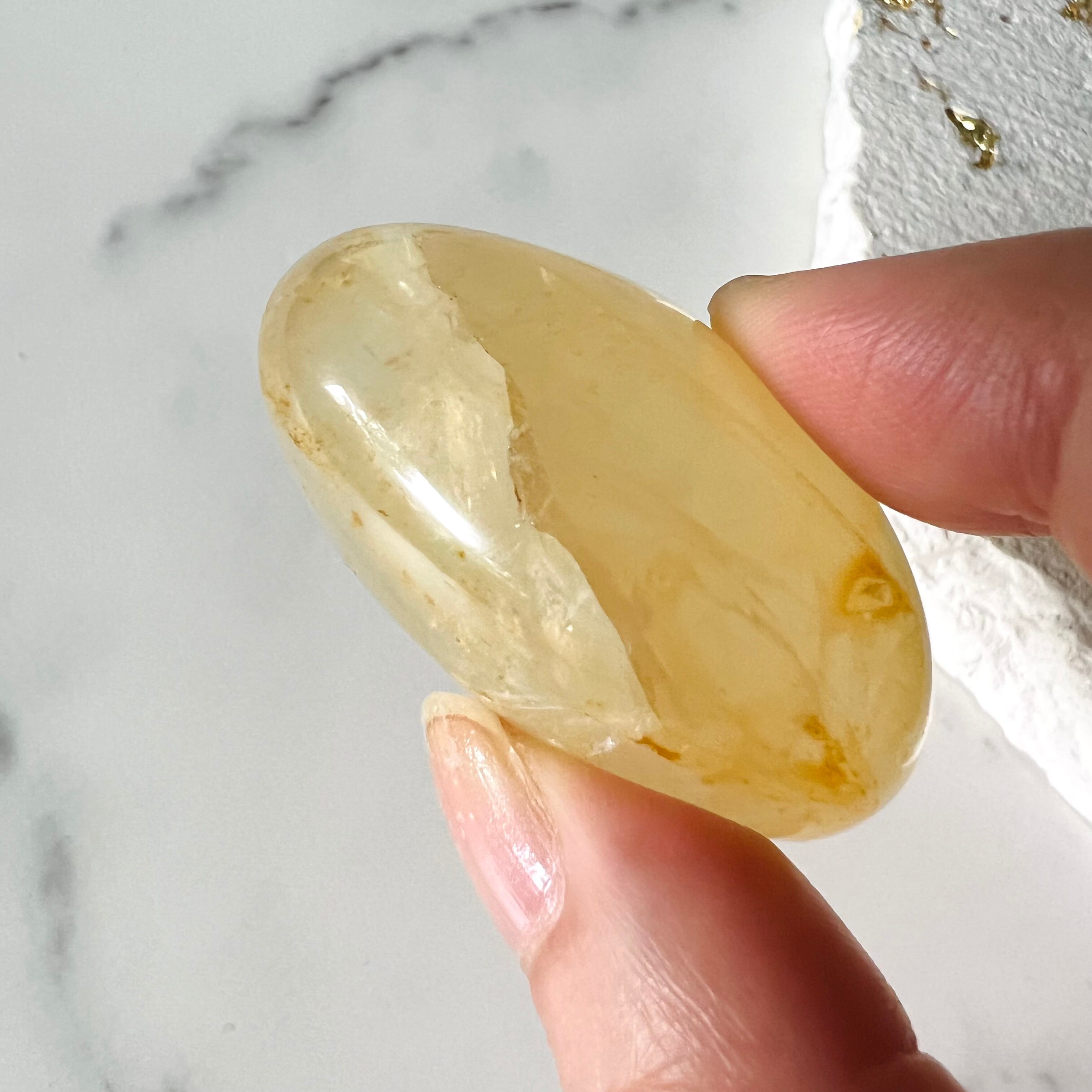 ミルキークォーツのような優しい光で、コロンとした形が愛らしく、虹もたっぷりと入ります。