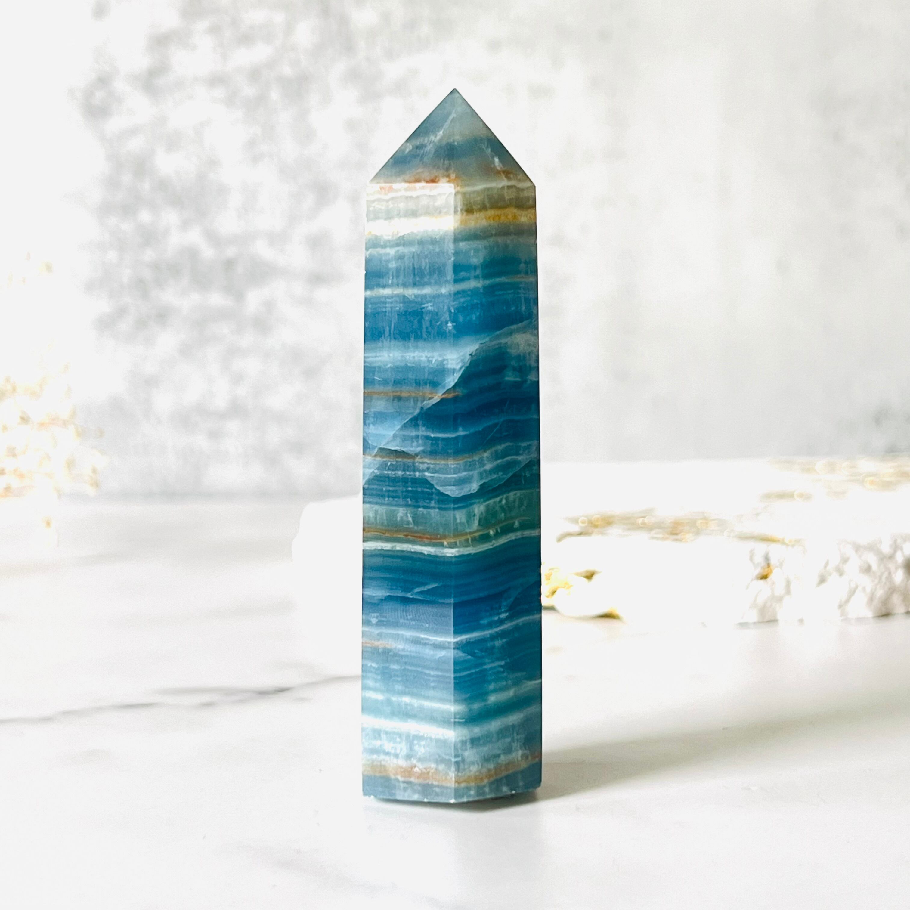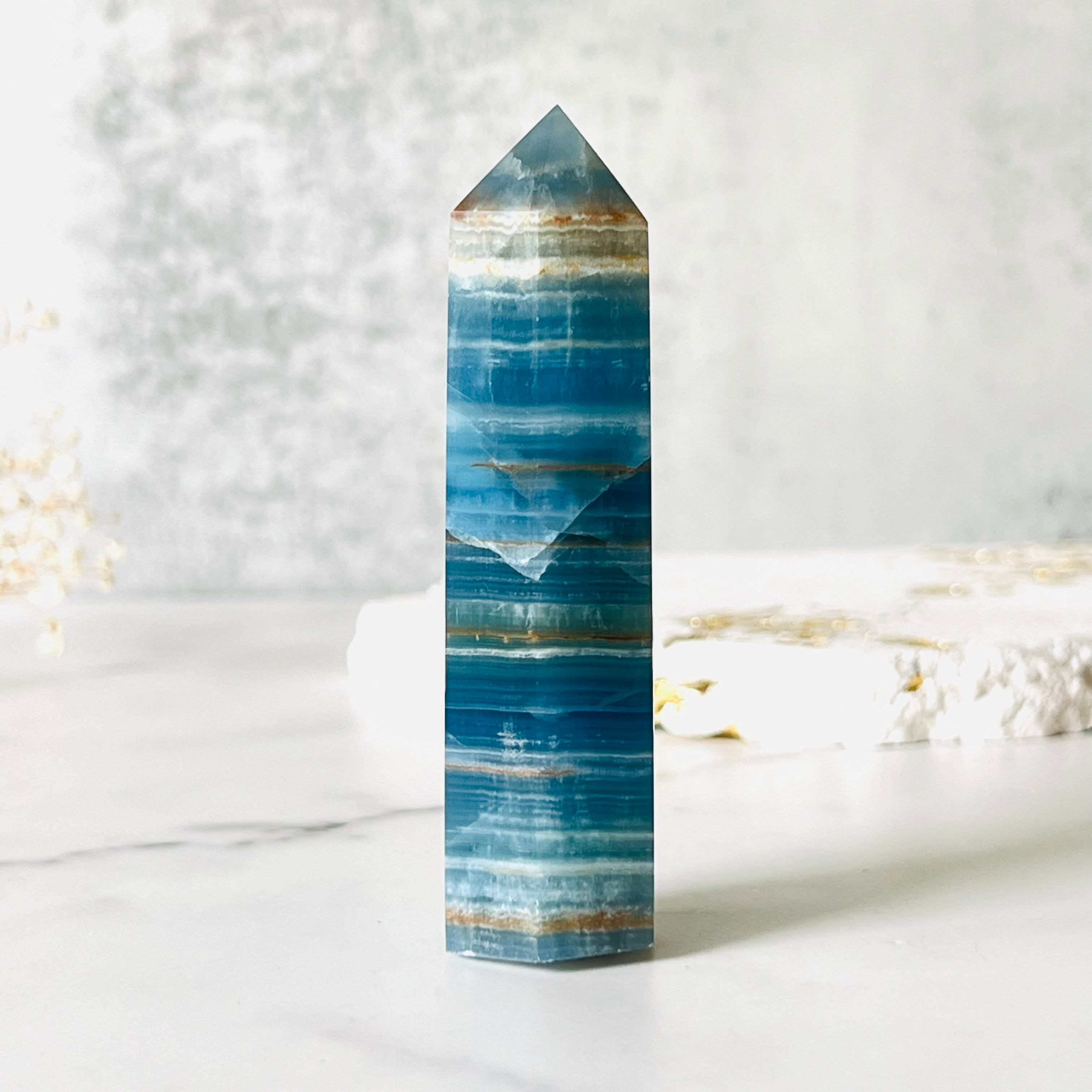 何層にも重なり合ったブルーとブラウンの縞模様が美しい色と模様を作り出しています。艶もありとても綺麗なタワーです。