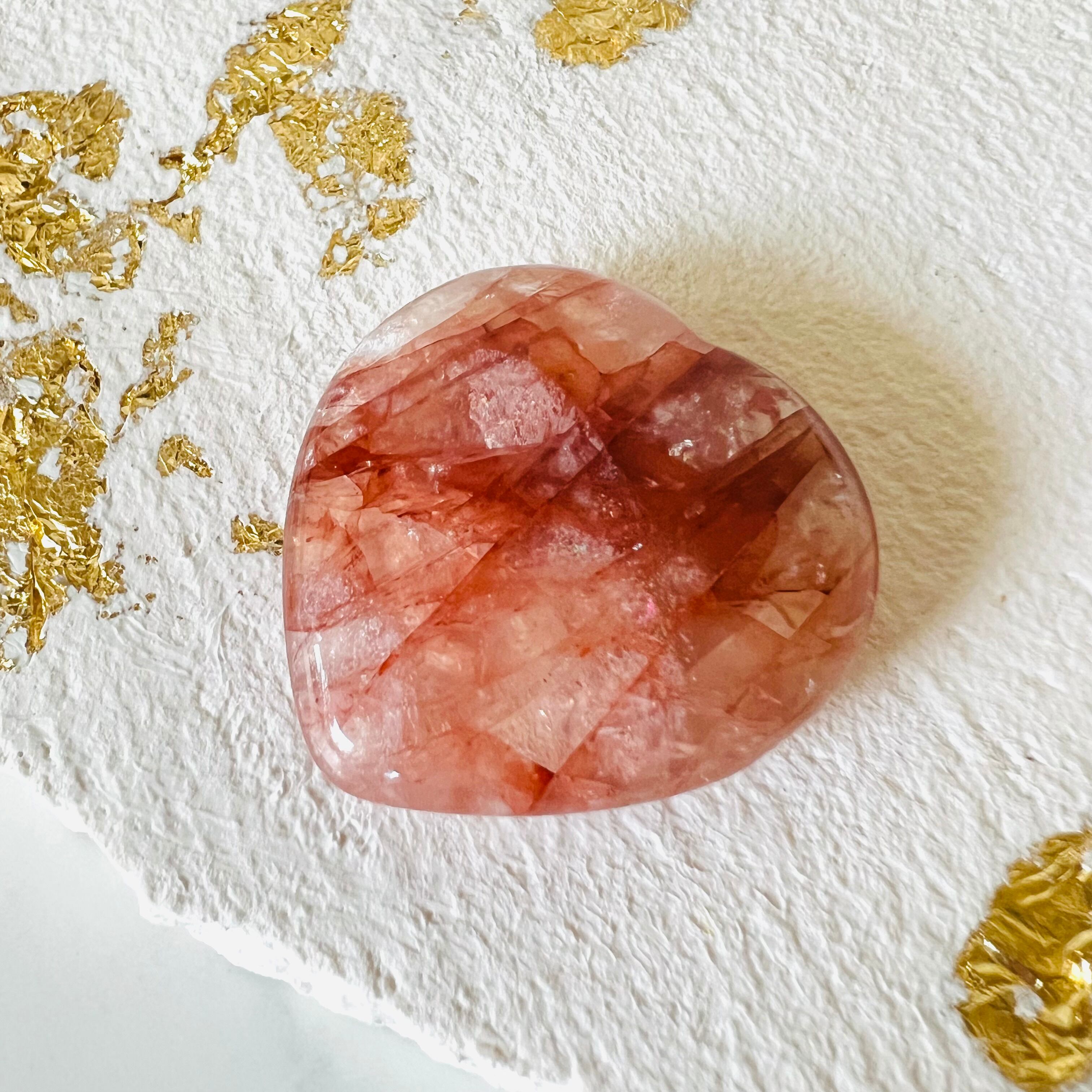 その色と形からは、地球の心臓や血液を連想させます。赤と透明なクォーツが混ざり合った美しい色合いで、虹が無数に煌めきます。愛と情熱、エネルギーを分け与えてくれる力強いアイテムです。胸の近くに忍ばせて持ち歩くのも良いでしょう。