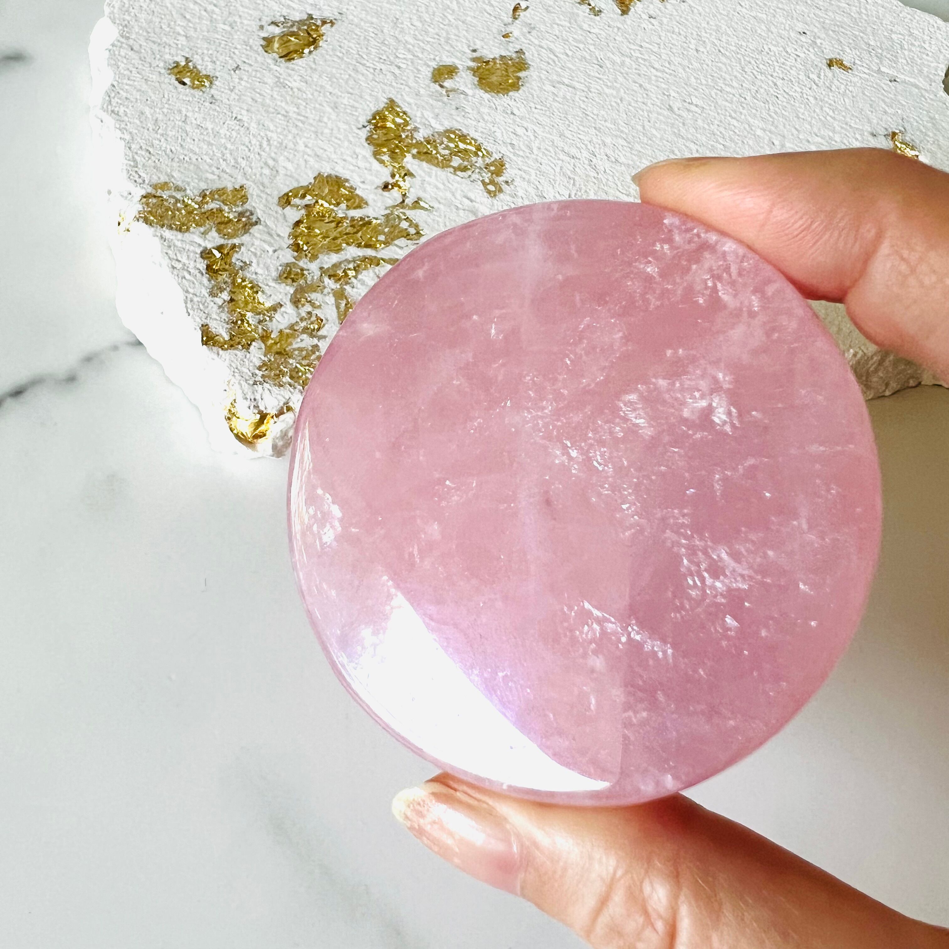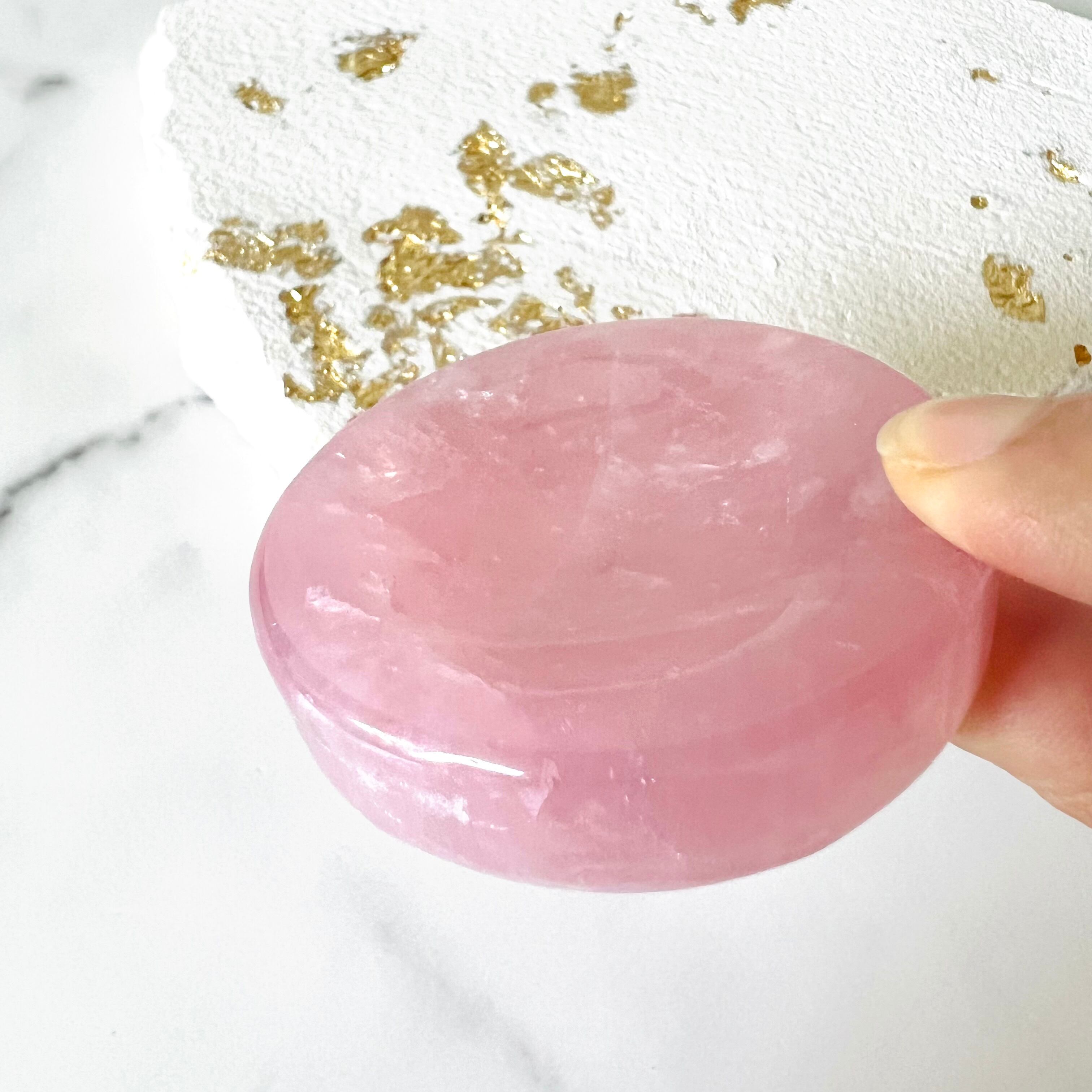ピュアでみずみずしいピンク色が綺麗なローズクォーツの円形トレイです。