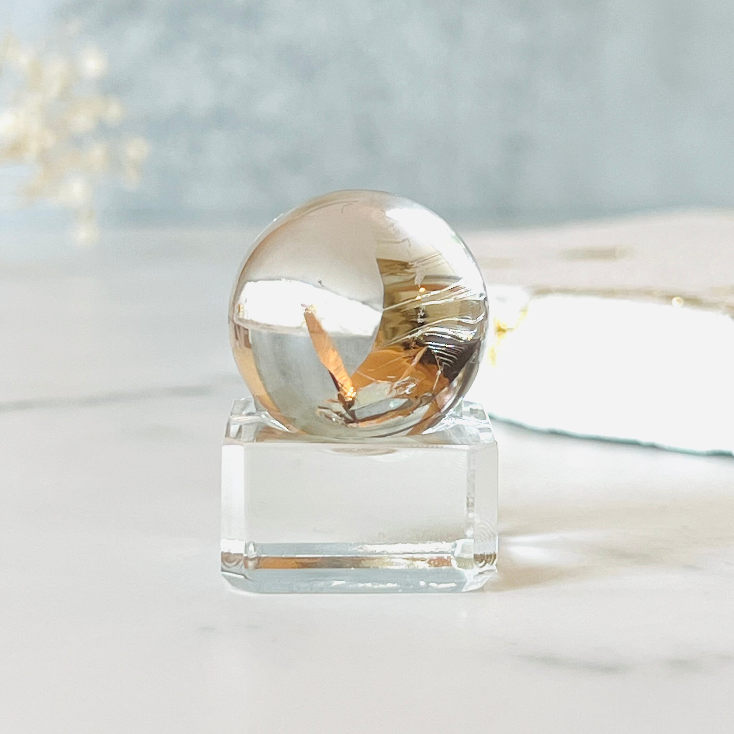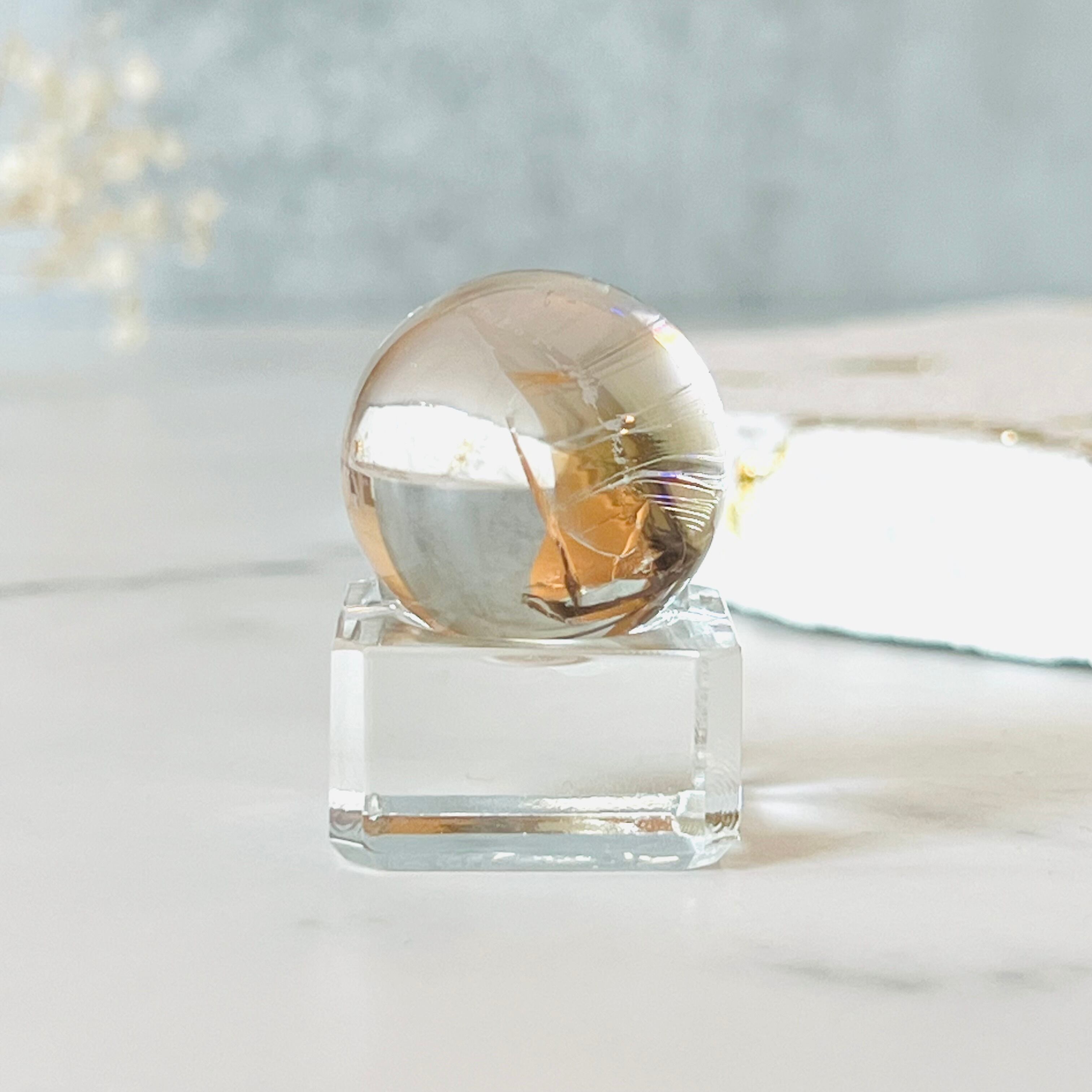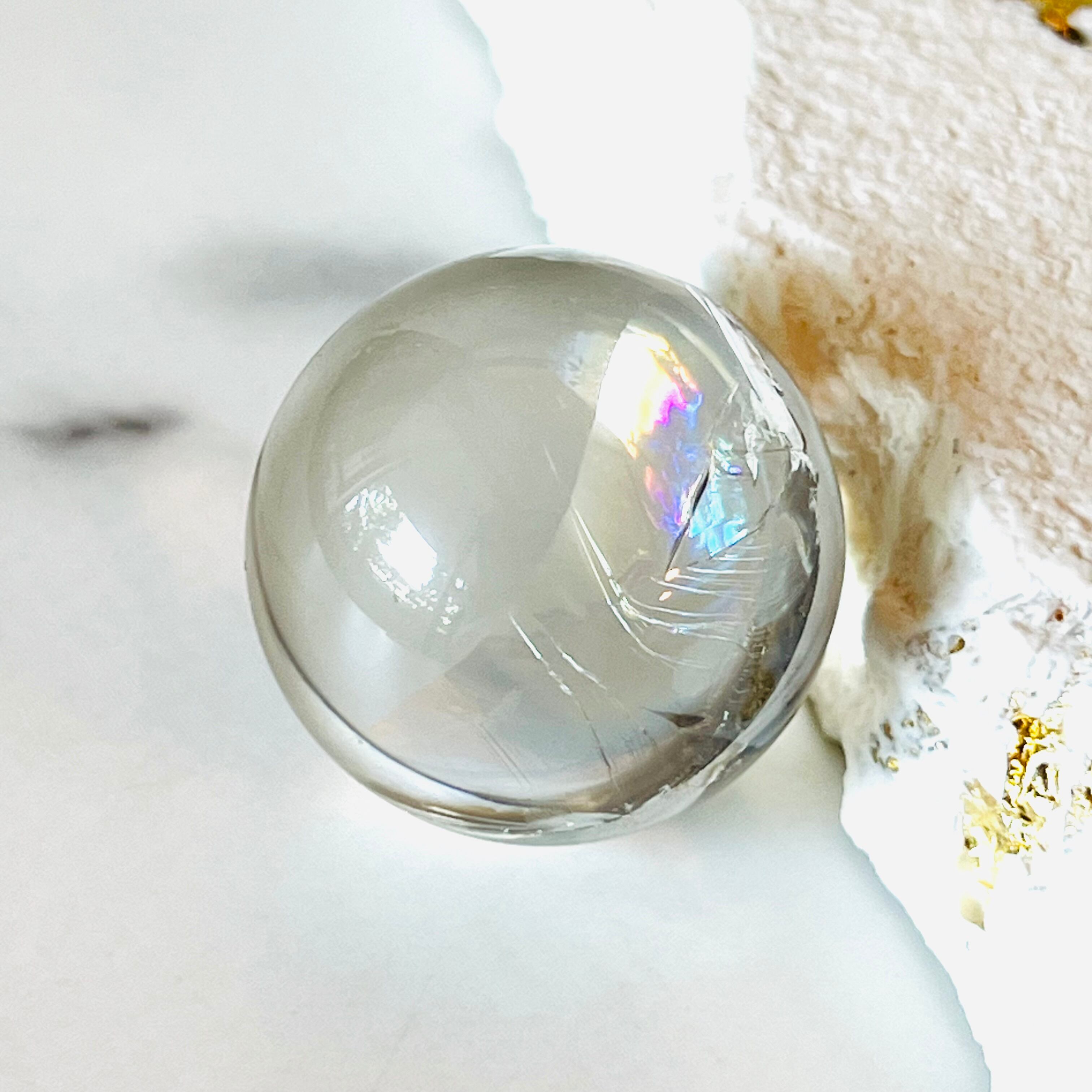 高い透明度と美しい虹の輝きが特徴です。小さく透き通った球体の内部に映し出された美しい虹は、静寂なひとときと深い癒しをもたらします。