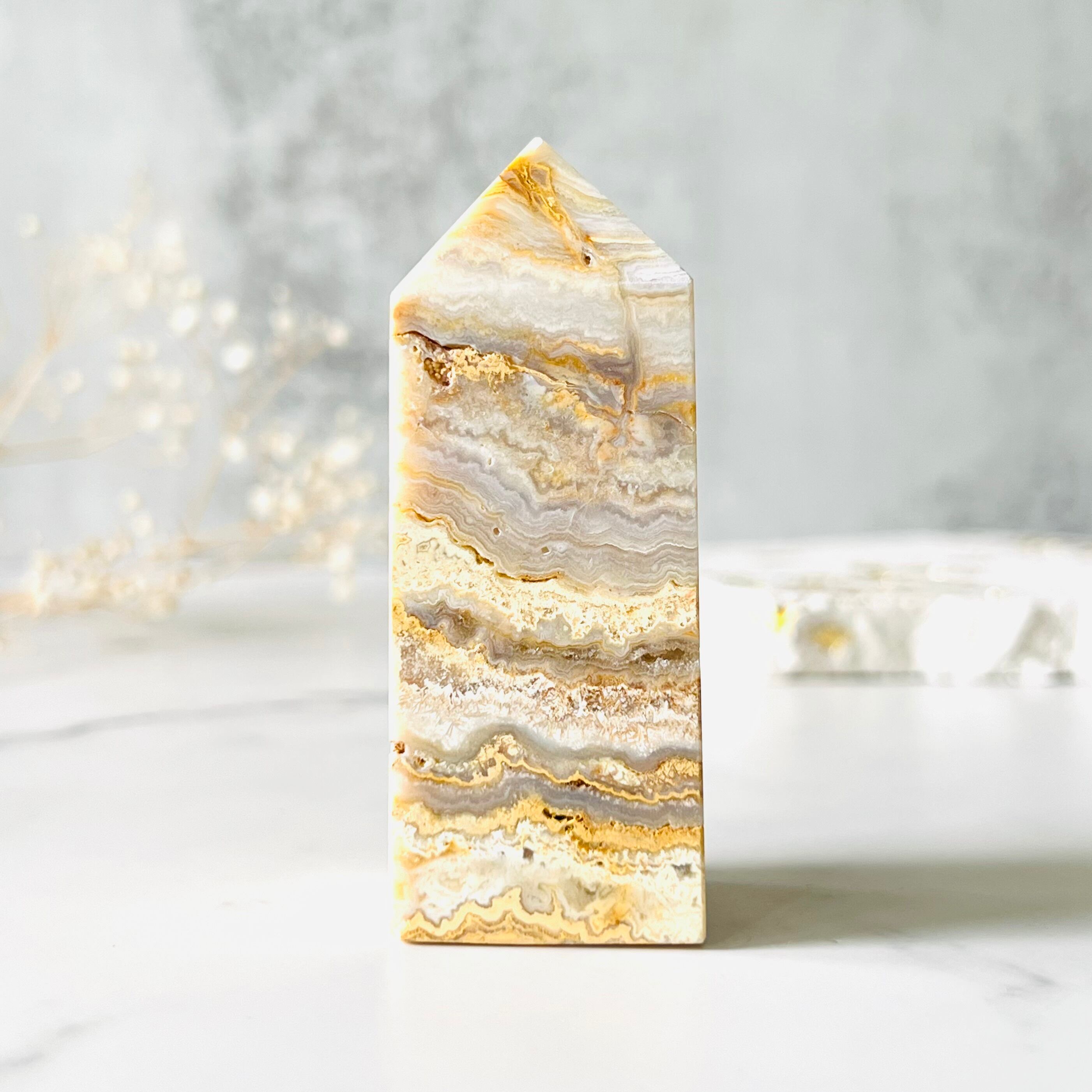 優しいピュアホワイトと温かみのあるイエローベージュの層が幾重にも重なり、繊細で美しいパターンを描き出します。この石が見つめてきた長い長い時間を刻んでいます。