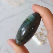 艶々の石肌がひんやりと心地よく手のひらに馴染みます。光にかざすと美しいブルーやライムグリーンのラブラドレッセンス、虹色の光を放つラメが浮かび上がります。