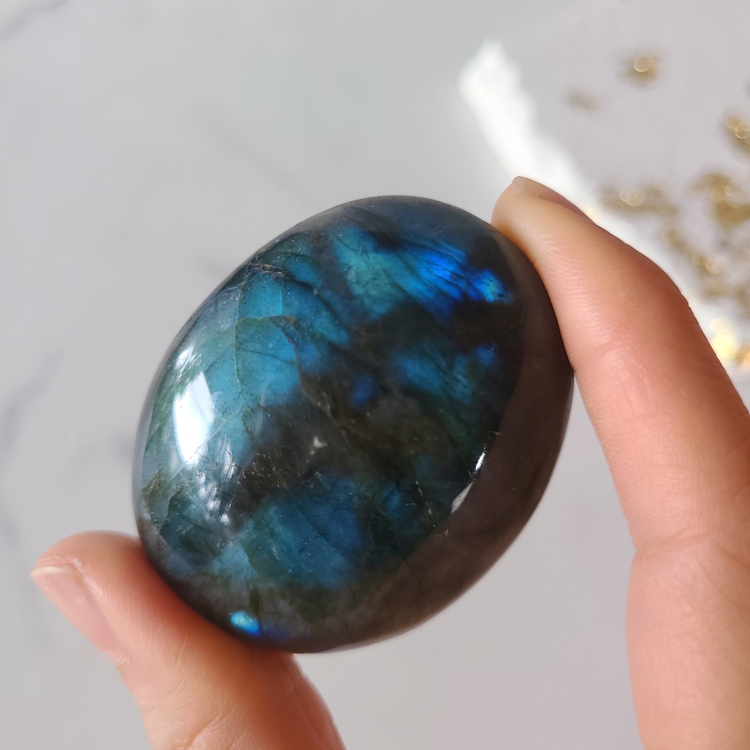 艶々の石肌がひんやりと心地よく手のひらに馴染みます。光にかざすと美しいブルーやライムグリーンのラブラドレッセンス、虹色の光を放つラメが浮かび上がります。