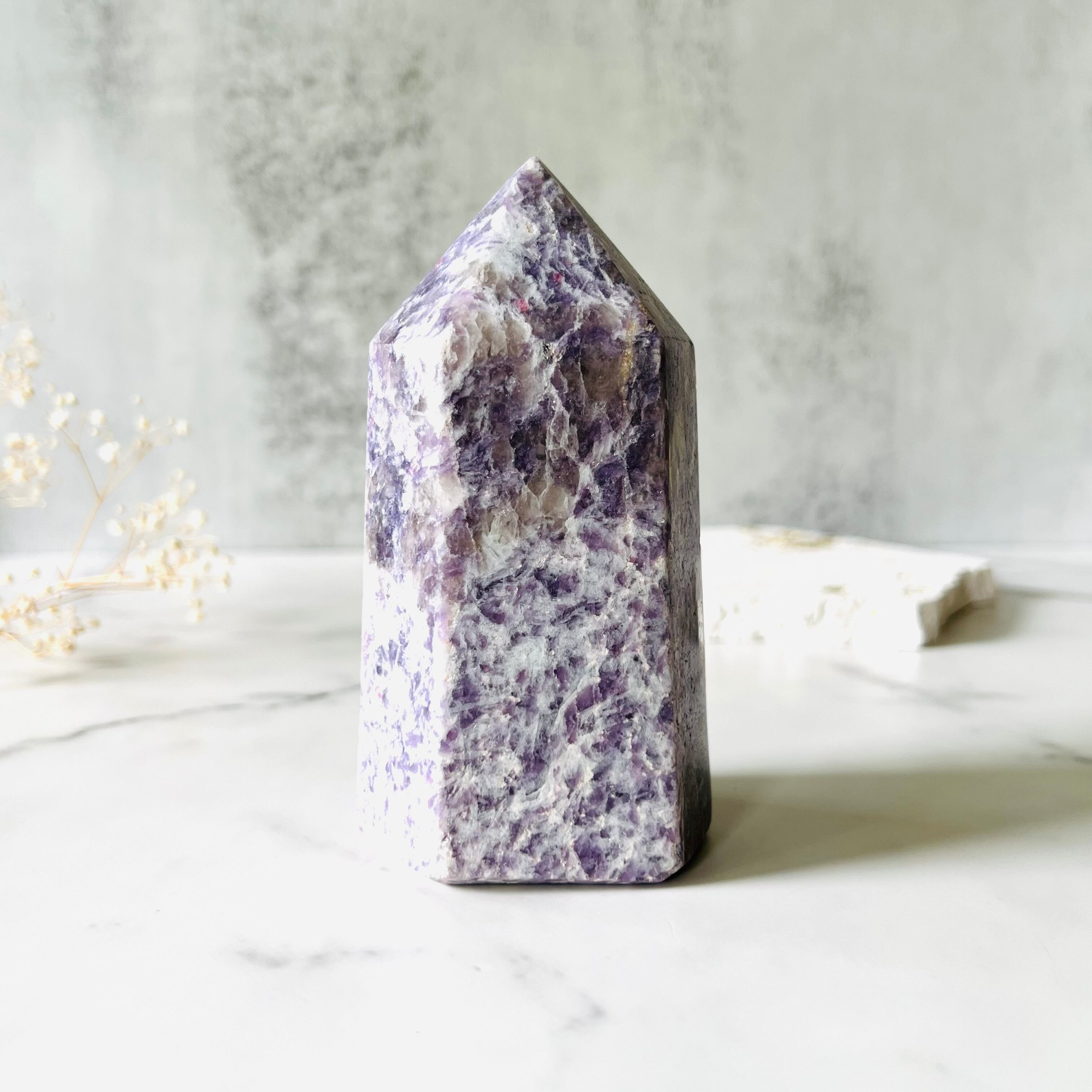 レピドライトは雲母の一種でトルマリンなど他の石を共生して産出されることが多く、リチウムの含有量によって、ピンクや紫、白など多彩に変化します。こちらのタワーは紫・白・ピンク・グレーのミックスカラーです。