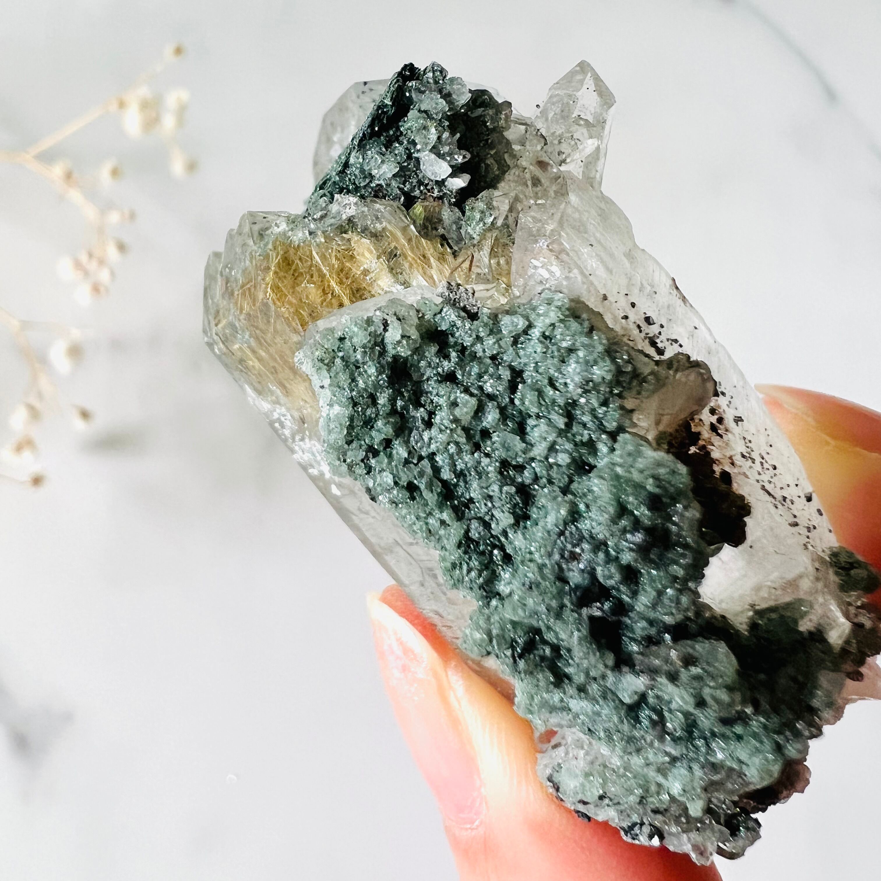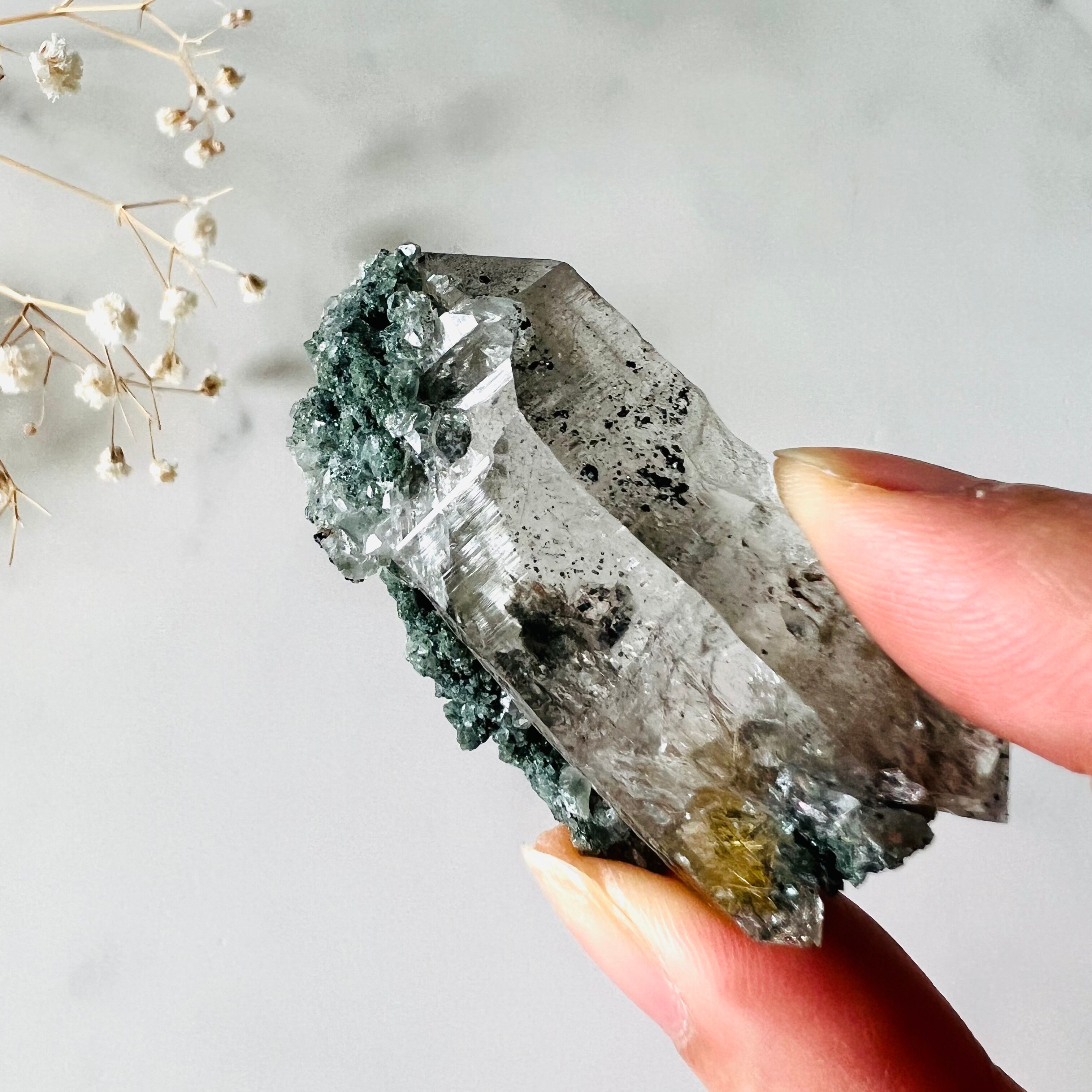 たっぷりのクローライトがキラキラと朝露を宿した苔のように美しくきらめきます。柱面にはアナテース(ヘマタイト)の付着が見られます。足元にはたっぷりのルチル、ところどころに虹も宿します。