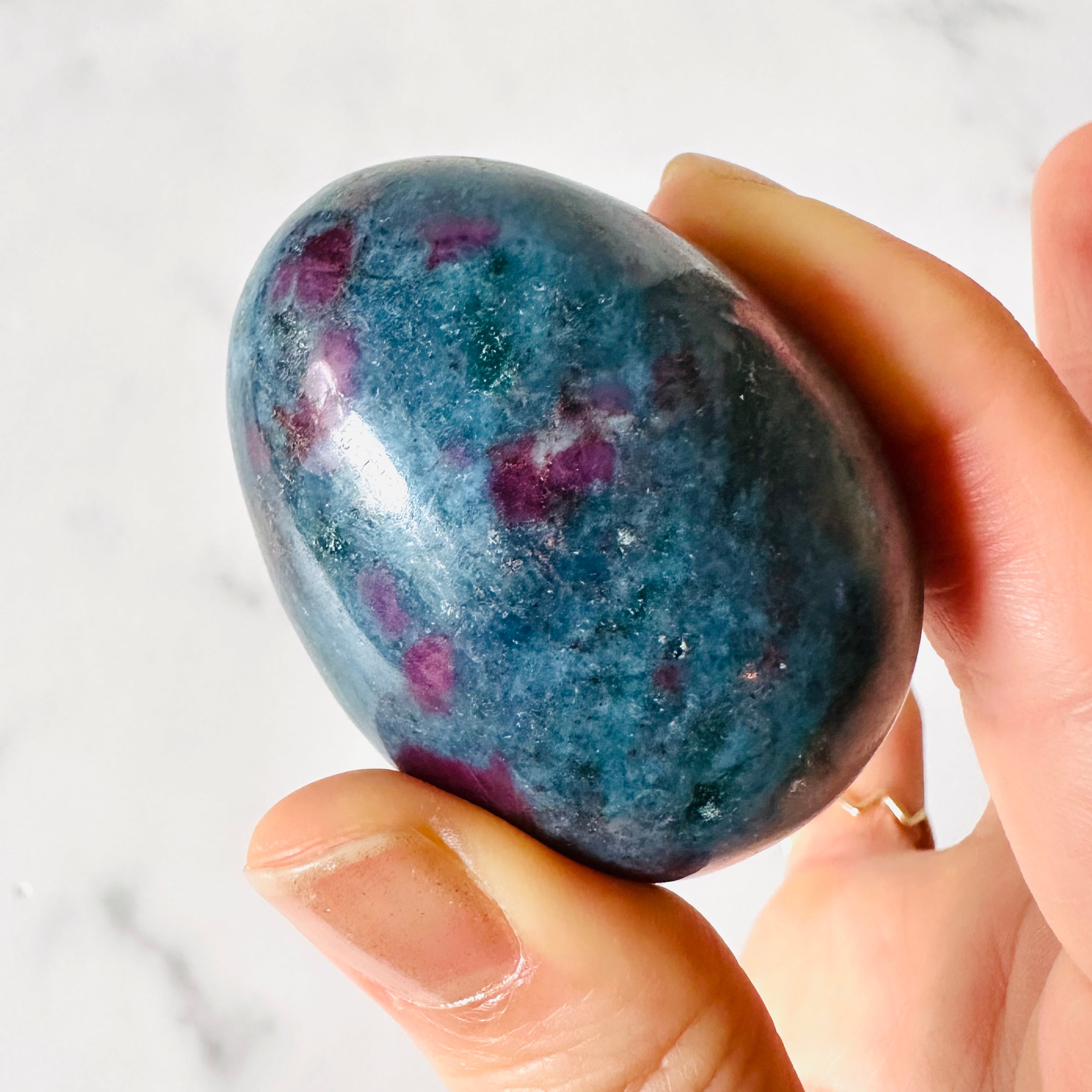 深い青のカイヤナイトと、ルビーが共生した珍しいエッグです。深い青の中に青緑がかったブルーも流れ込み、キラキラとした輝きもみられます。