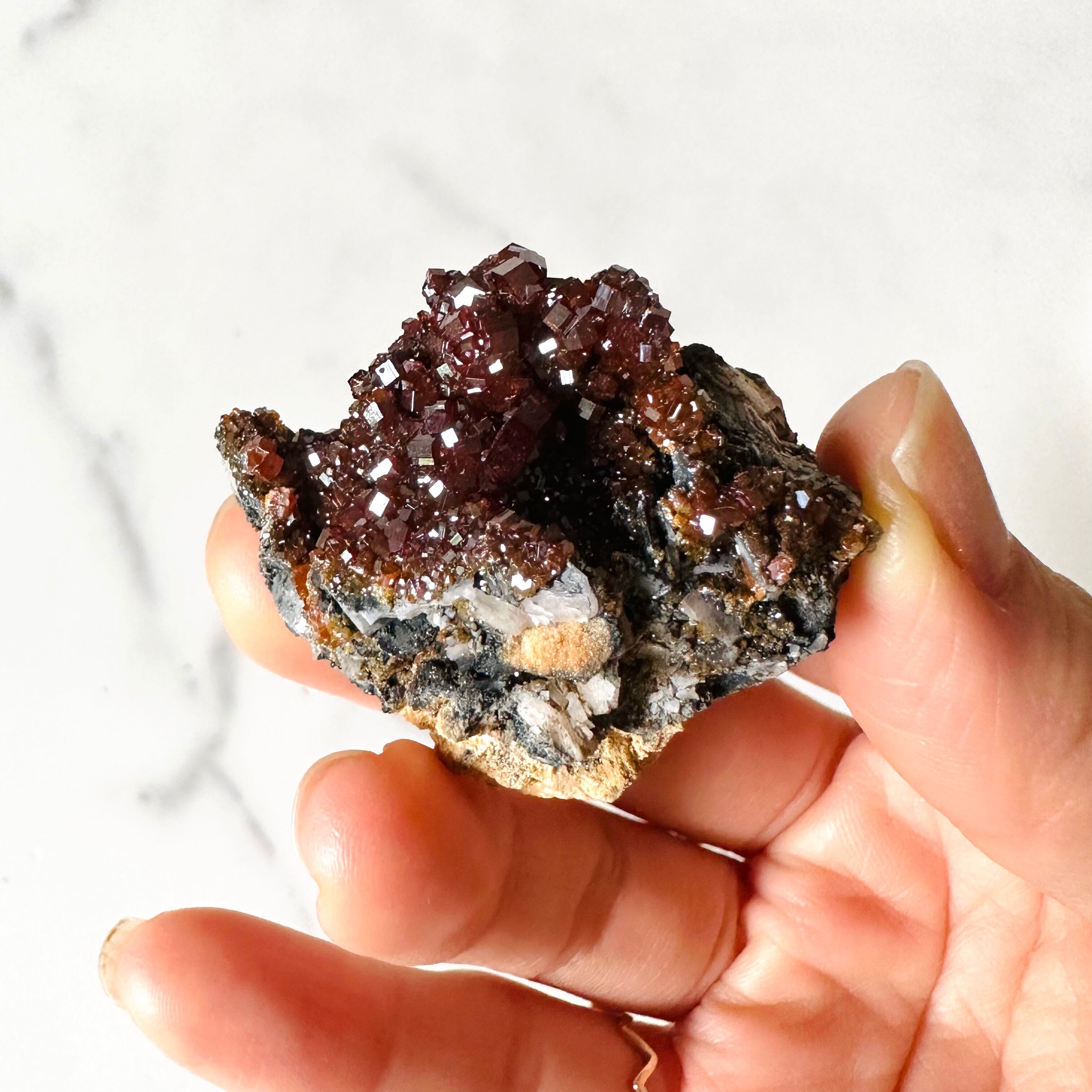 深い赤の結晶は立方体が並んだような特徴的な形をしており、ザクザクと輝いています。