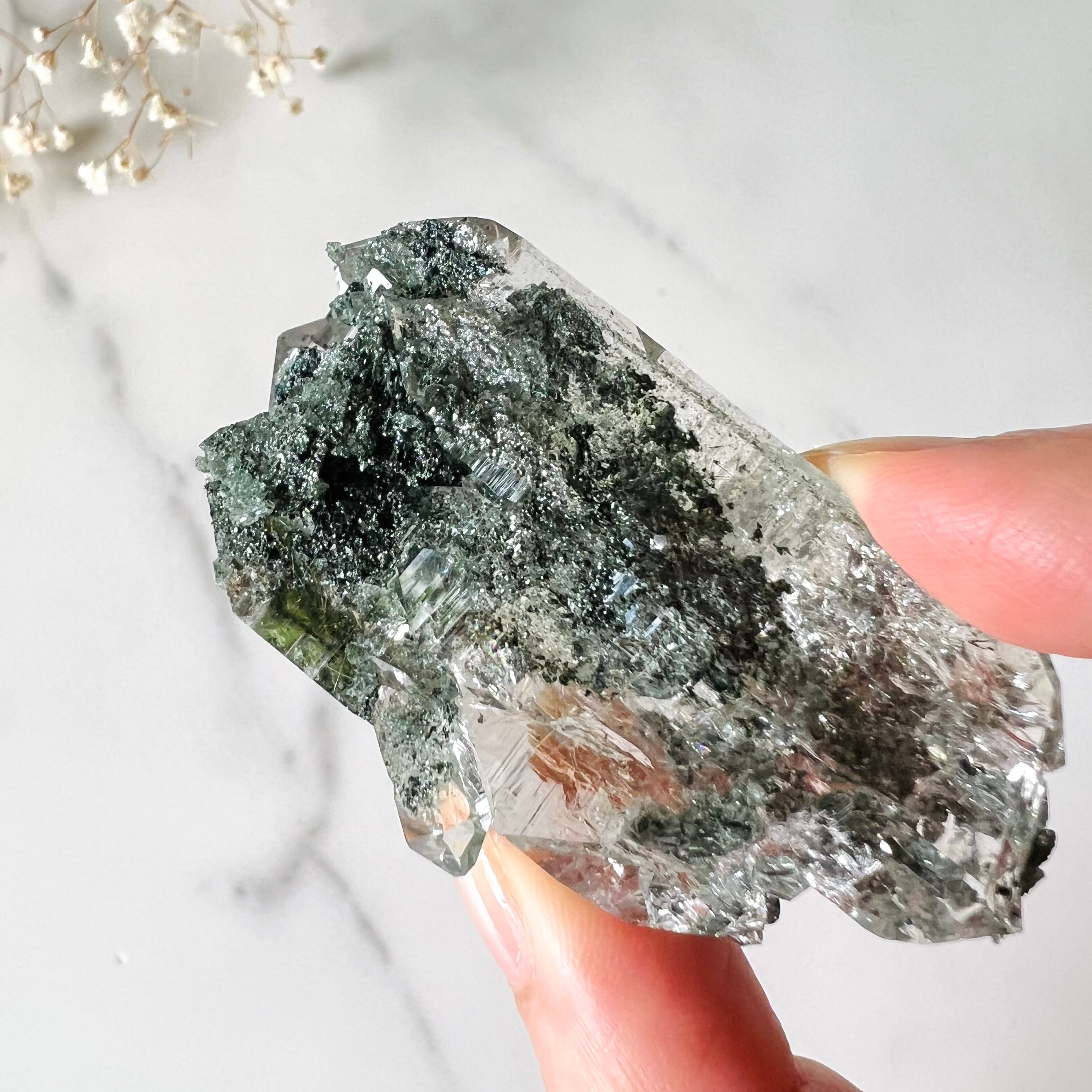 たっぷりのクローライトがキラキラと朝露を宿した苔のように美しくきらめきます。柱面にはアナテース(ヘマタイト)の付着が見られます。内部には繊細なルチルと、ところどころに虹も宿します。落ち着かない心を静謐にみたし、神聖な気持ちにさせてくれる特別なクリスタルです。