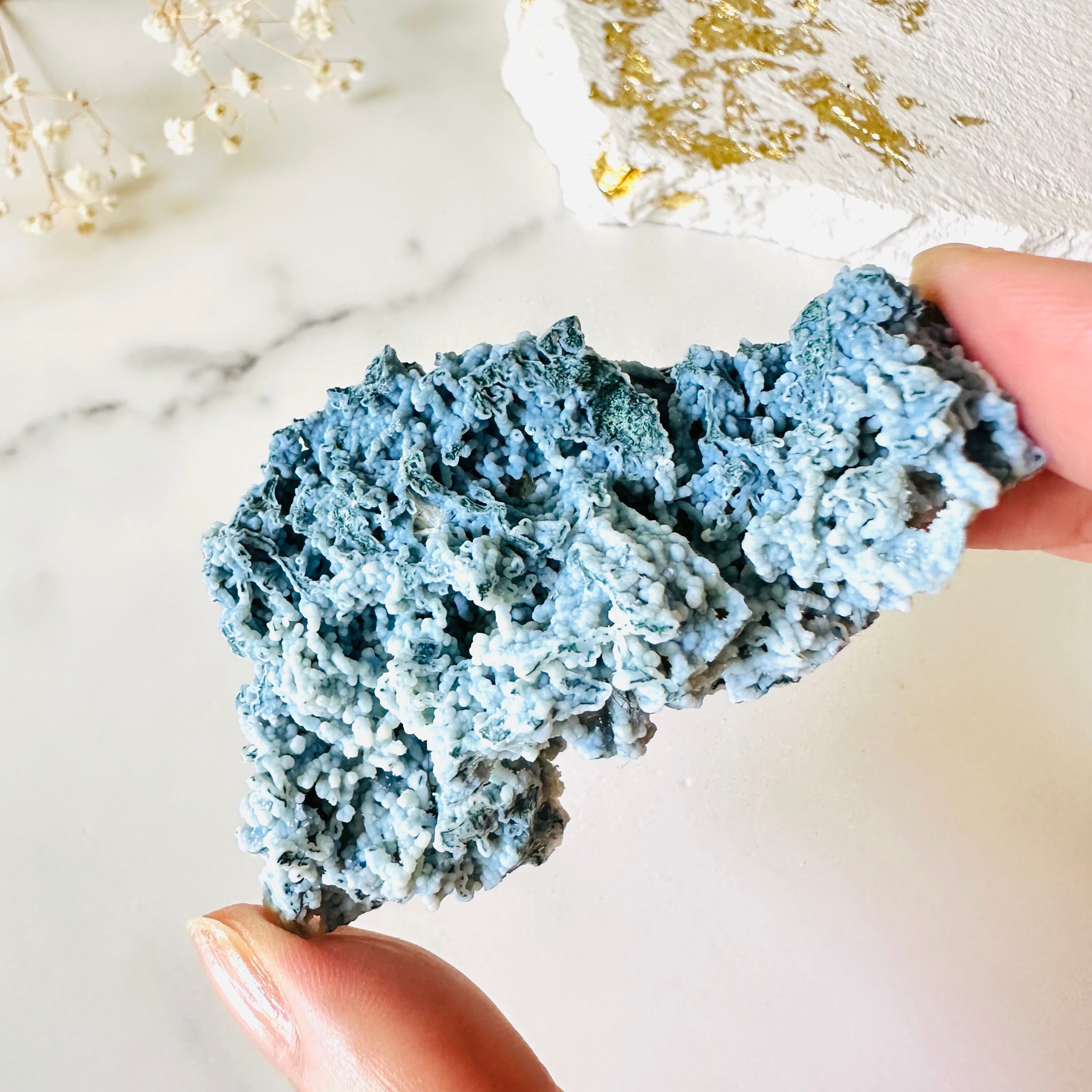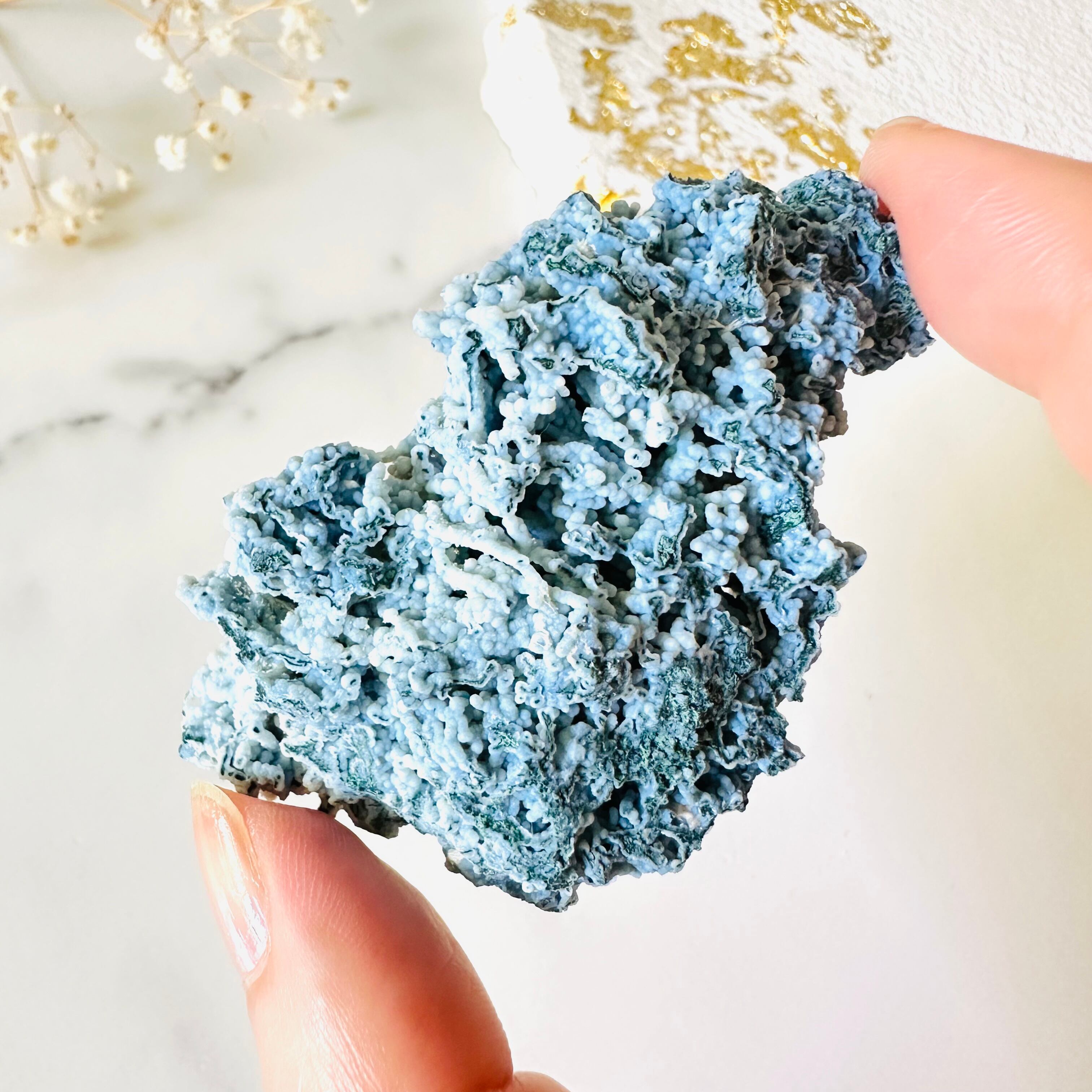 淡く優しいブルーのグラデーションが美しいブルーカルセドニー。穏やかなさざ波のように優しい色合いです。