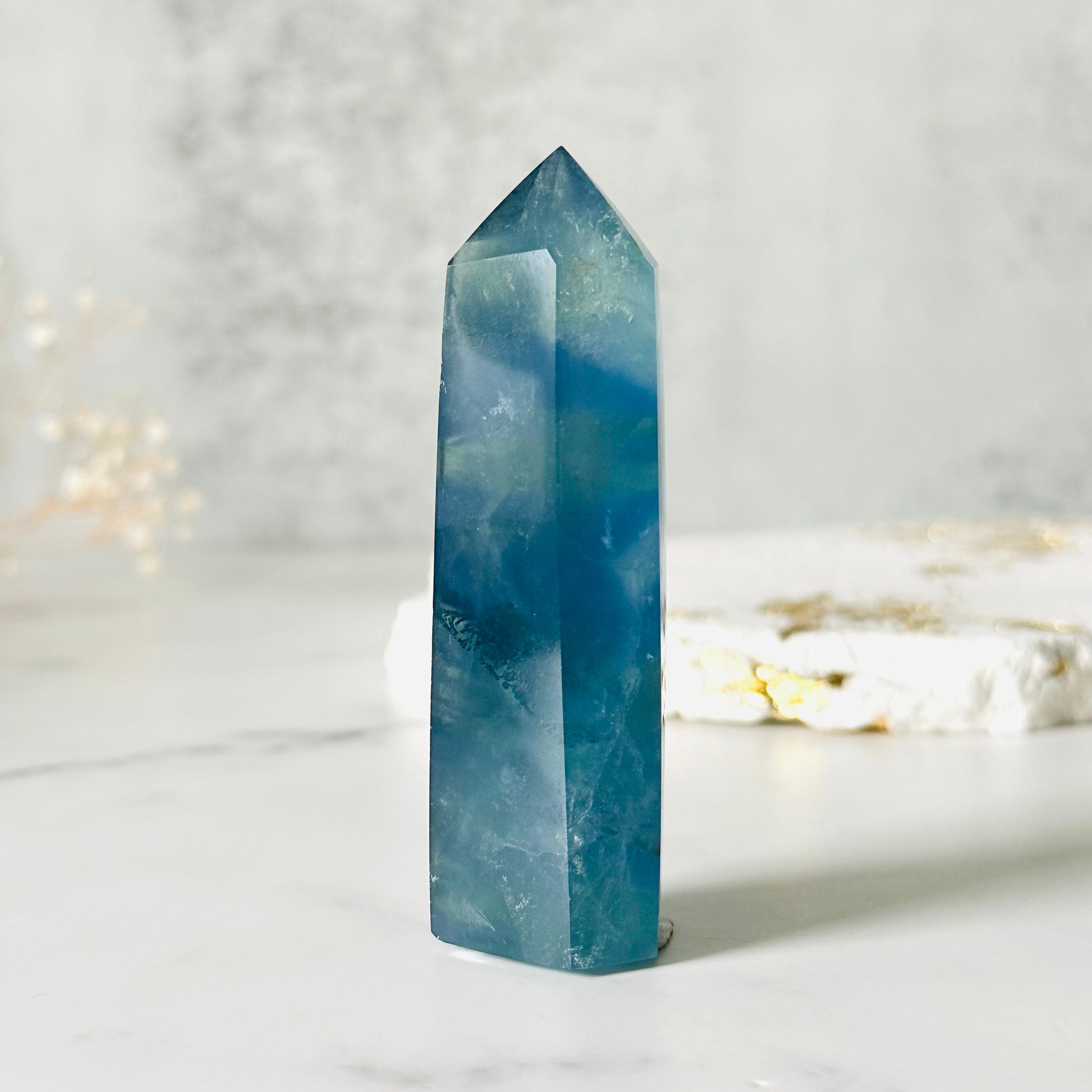 ブルーの陰影がきれいなブルーフローライトのタワーです。トップには霧のようにふんわりとしたインクルージョンが幻想的で、まるで音のない静謐な深海の世界のようです。