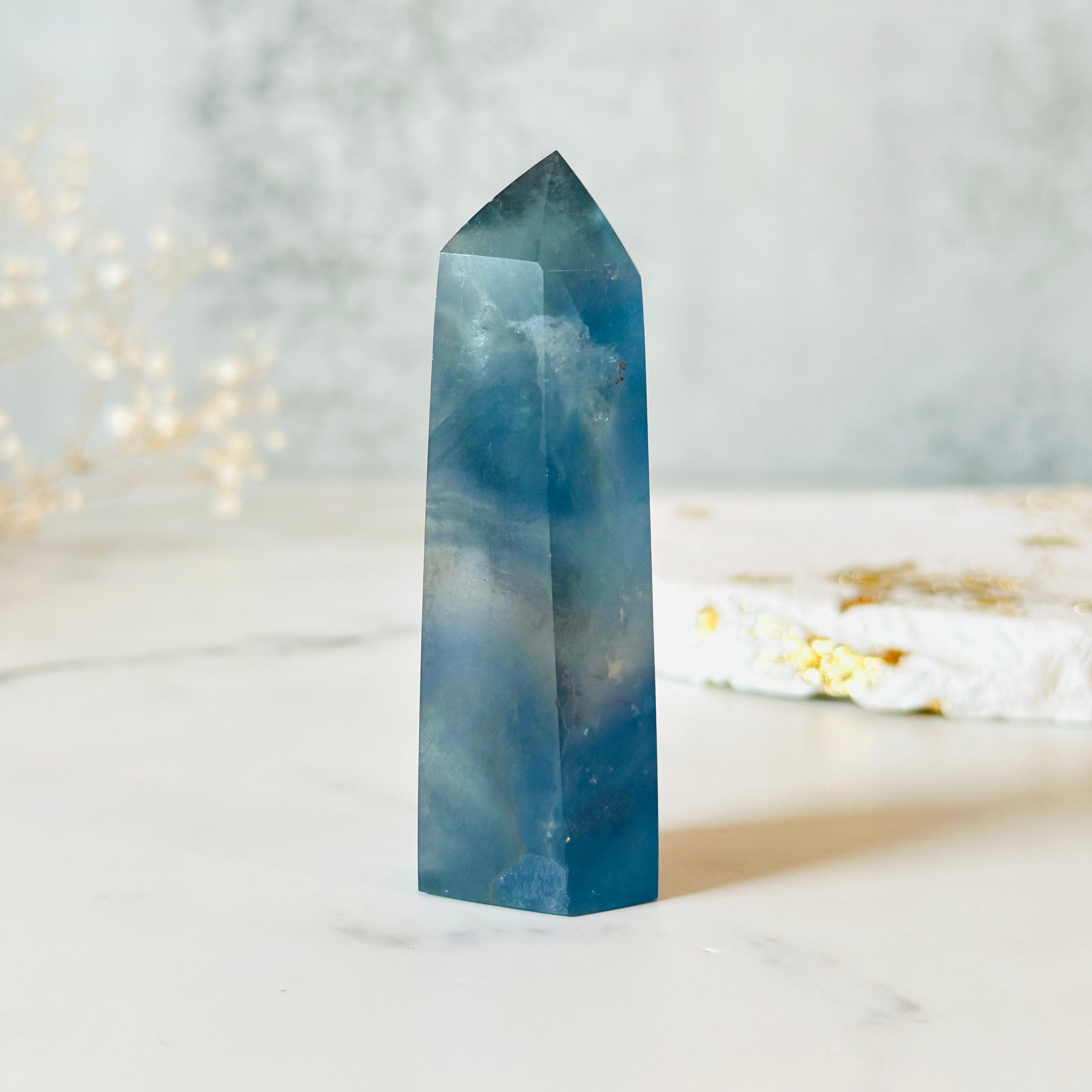 ブルーの陰影がきれいなブルーフローライトのタワーです。斜めに入った白い流れるようなラインが夜空に浮かぶ流星群のようです。幻想的で美しい夜の空をお楽しみください。