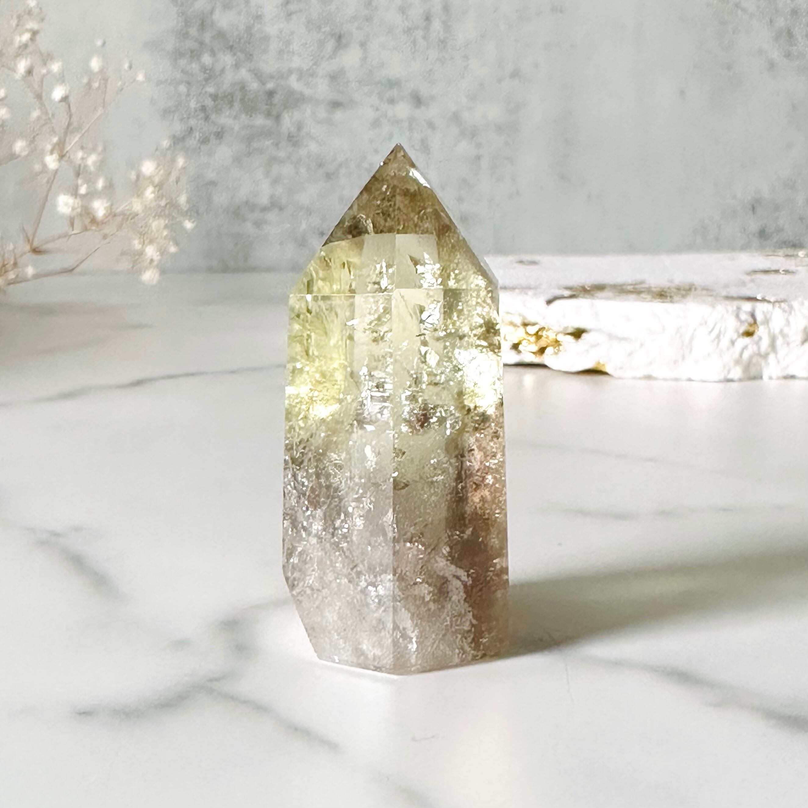 ややスモーキーがかったクォーツには無数のクラックがあり、光の反射でトップからボトムまでたくさんの虹を描き出します。