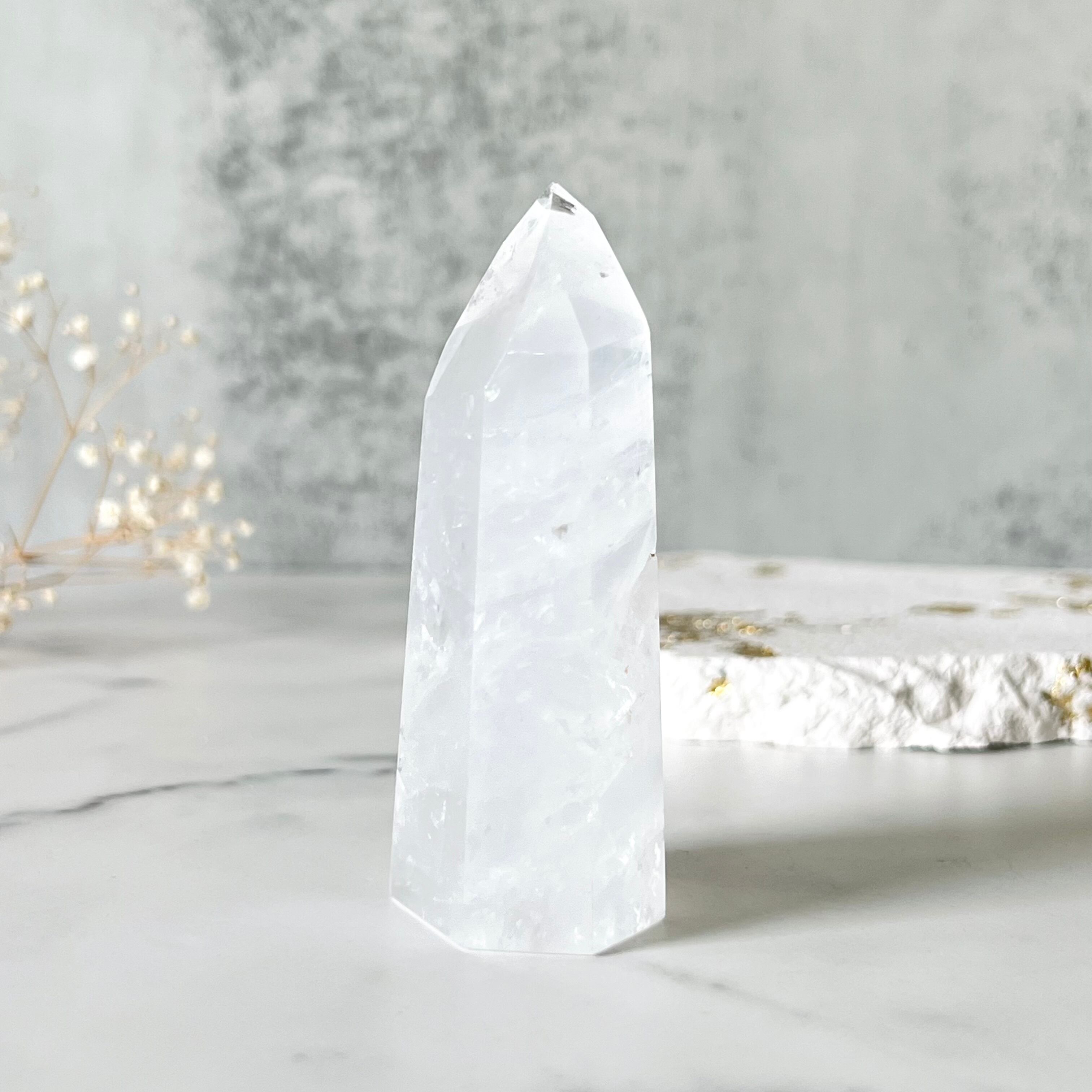 淡く美しいミルキーカラーが印象的なミルキークォーツのタワーです。