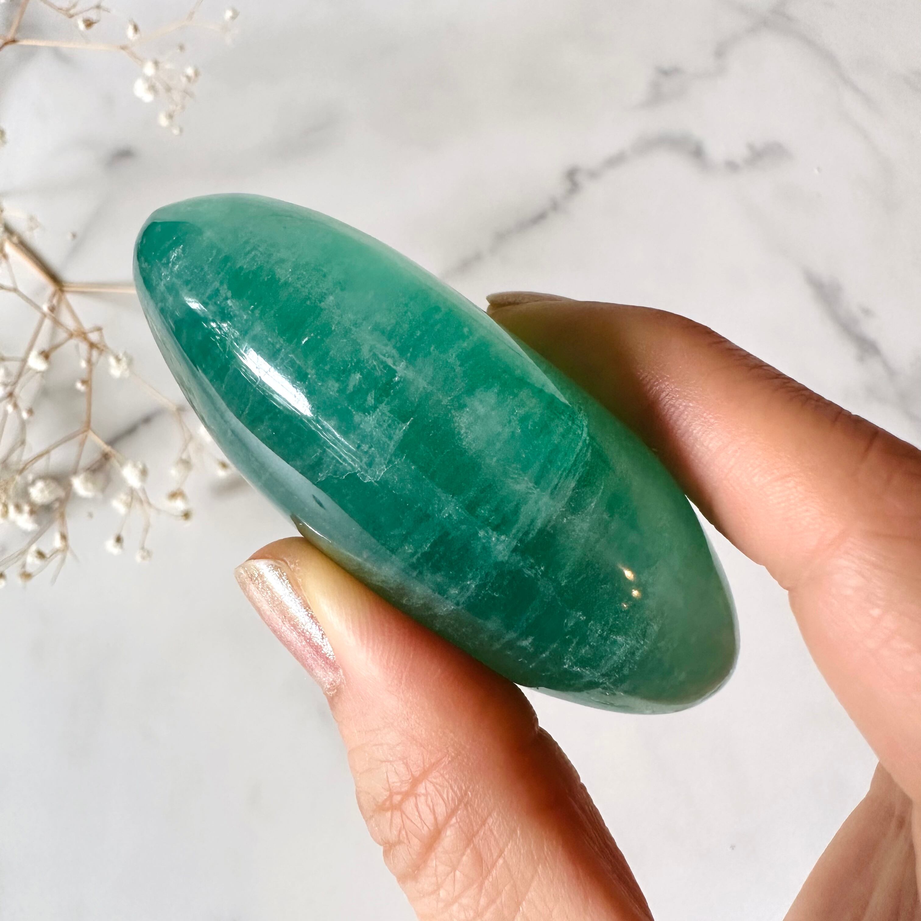 明るい色合いが軽やかなグリーンフローライトのパームです。透き通ったグリーンの中に、白い雲を吹き流したような模様が多く入っていて、見応えのある美しい握り石です。
