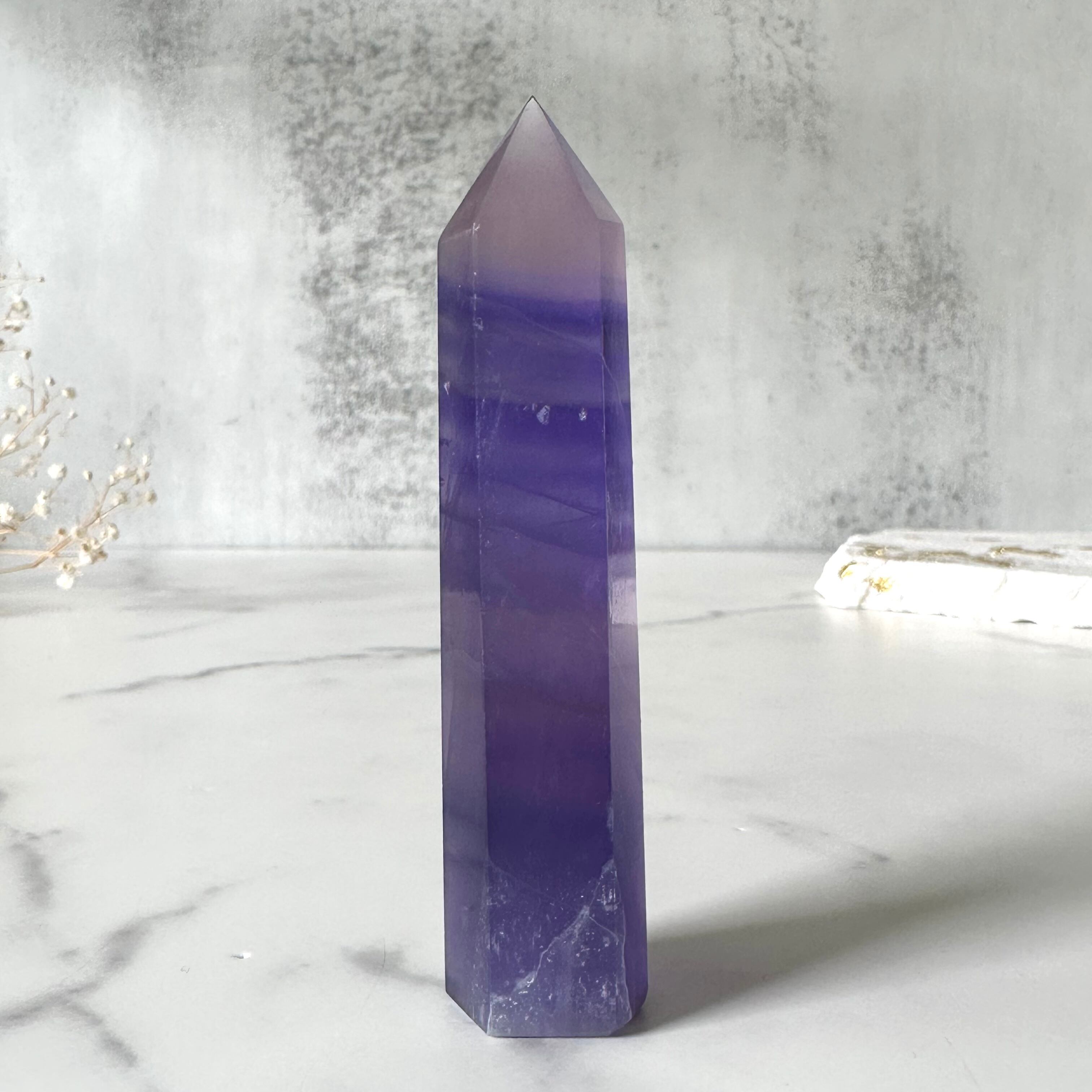 澄んだパープルカラーが美しいフローライトのタワー。
