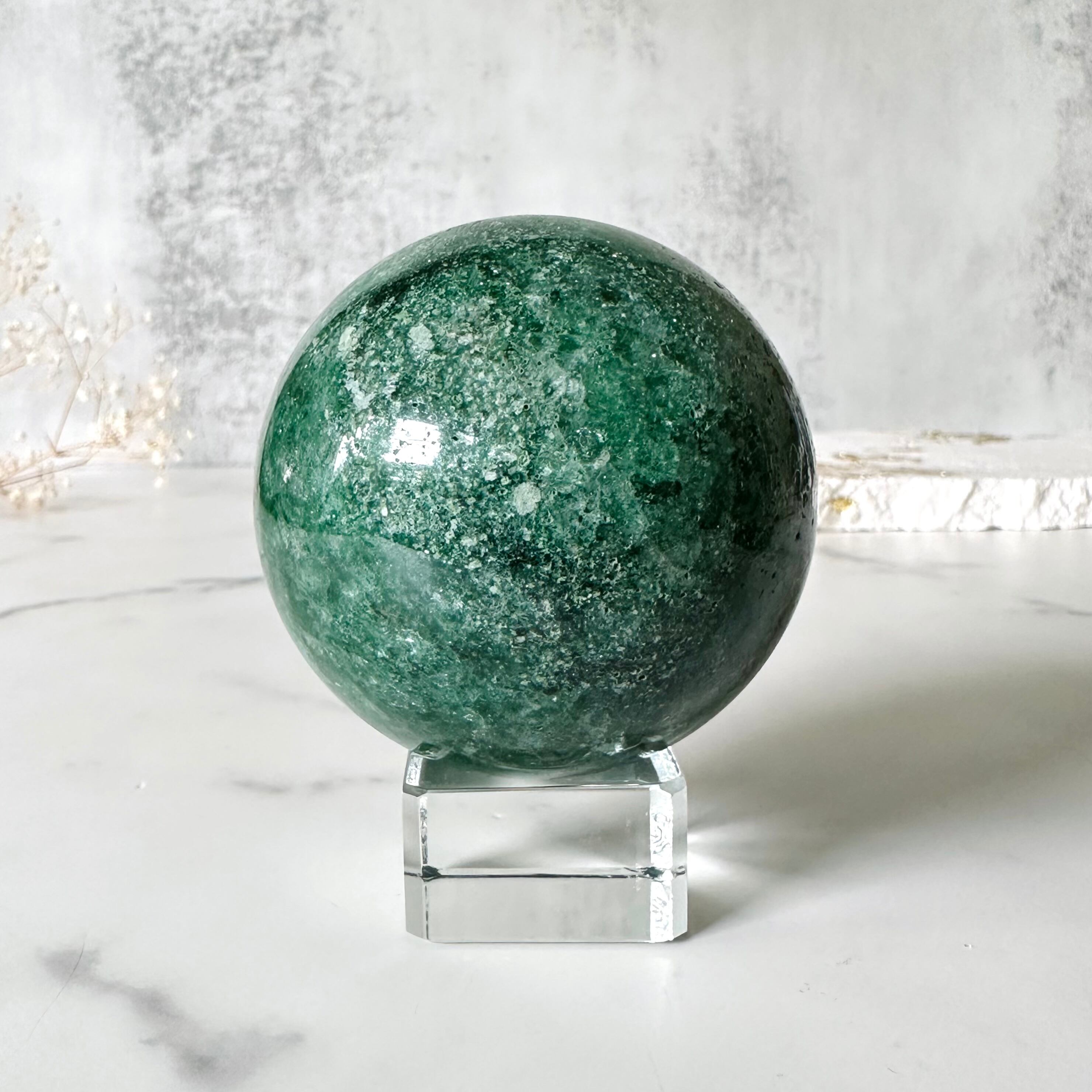 グリーンの発色が綺麗なグリーンストロベリーのスフィアです。「モテ」の石として大変人気があるパワーストーン。ストロベリークォーツの効果に加えて、グリーンは人間関係を穏やかにしてくれる効果もあります。小さな虹、無数のキラキラがあらゆる角度から楽しめるスフィアです。