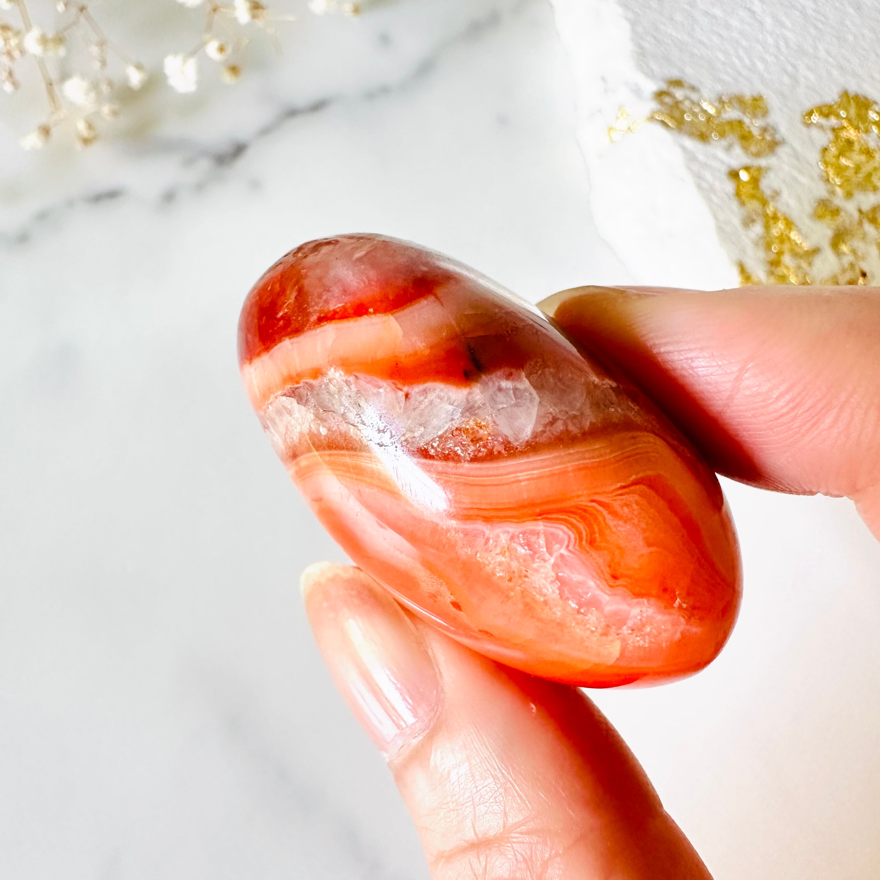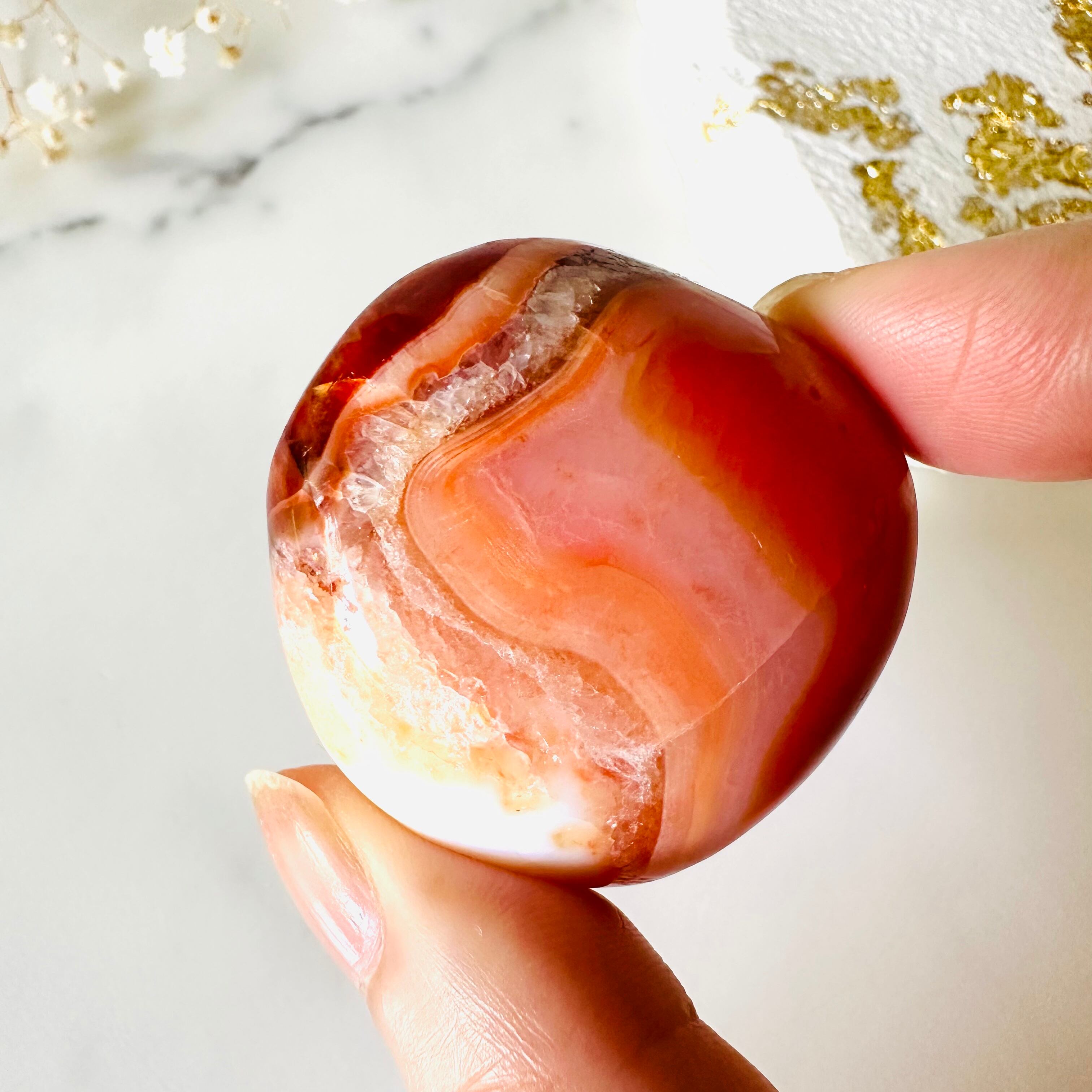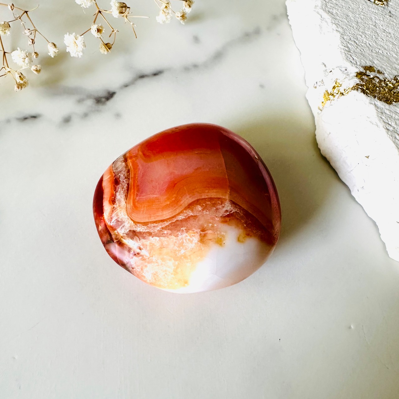 赤とオレンジの綺麗なパターンを持つカーネリアンのパームストーンです。