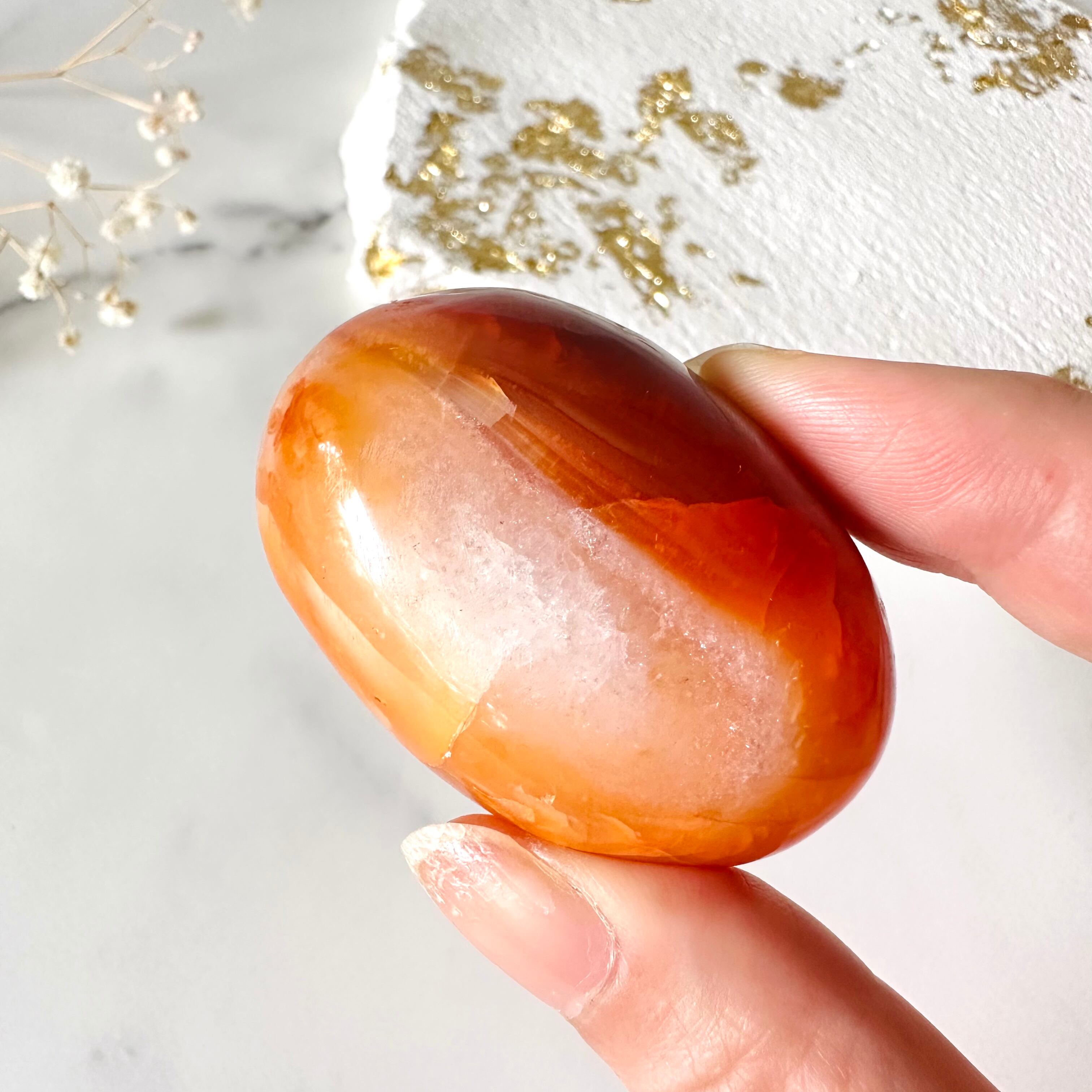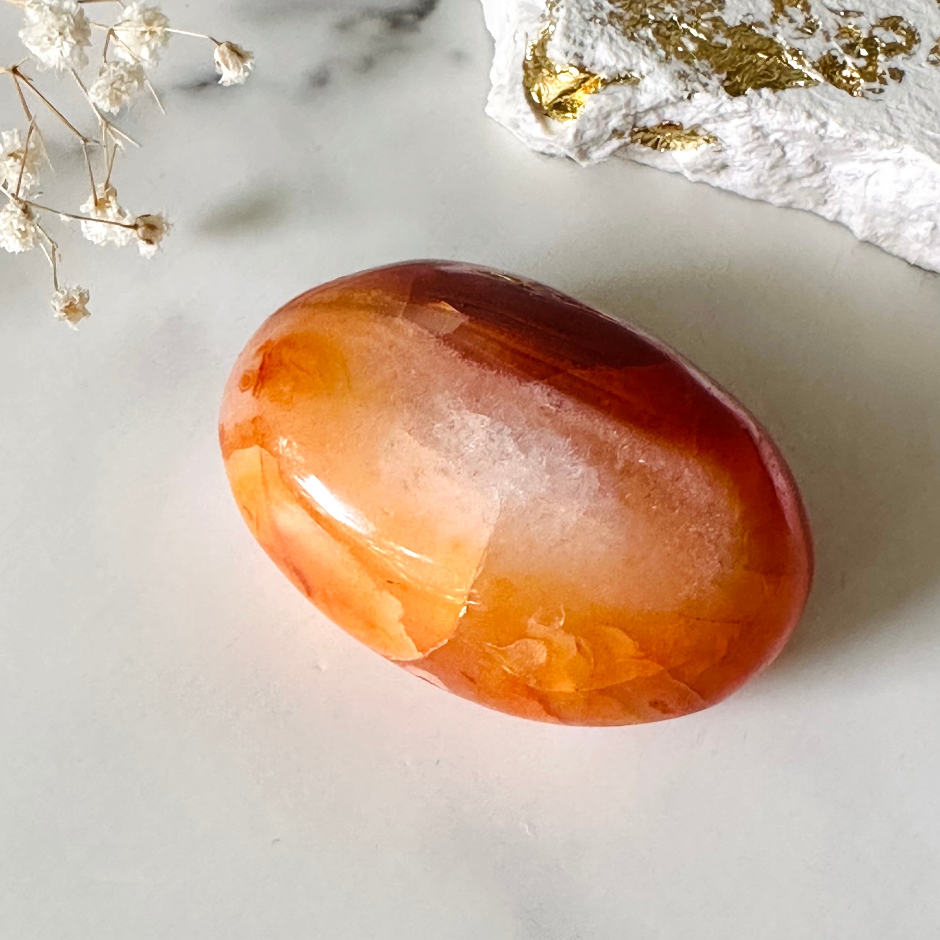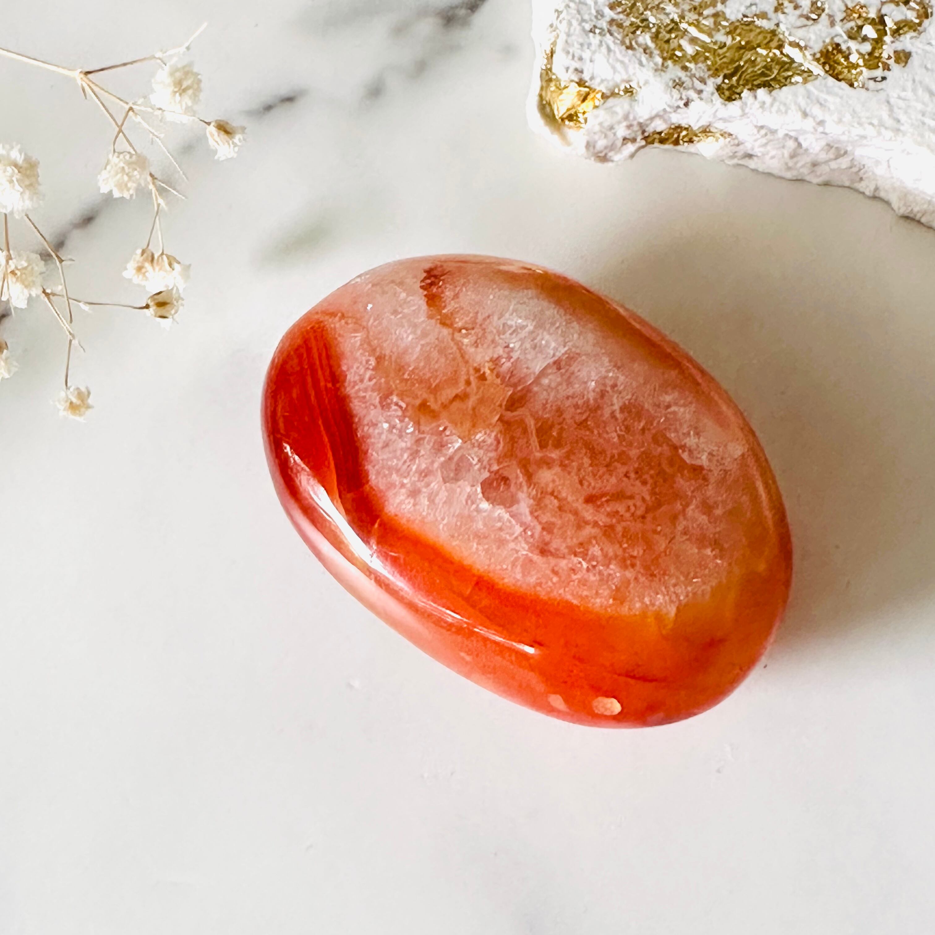 赤とオレンジの綺麗なパターンを持つカーネリアンのパームストーンです。