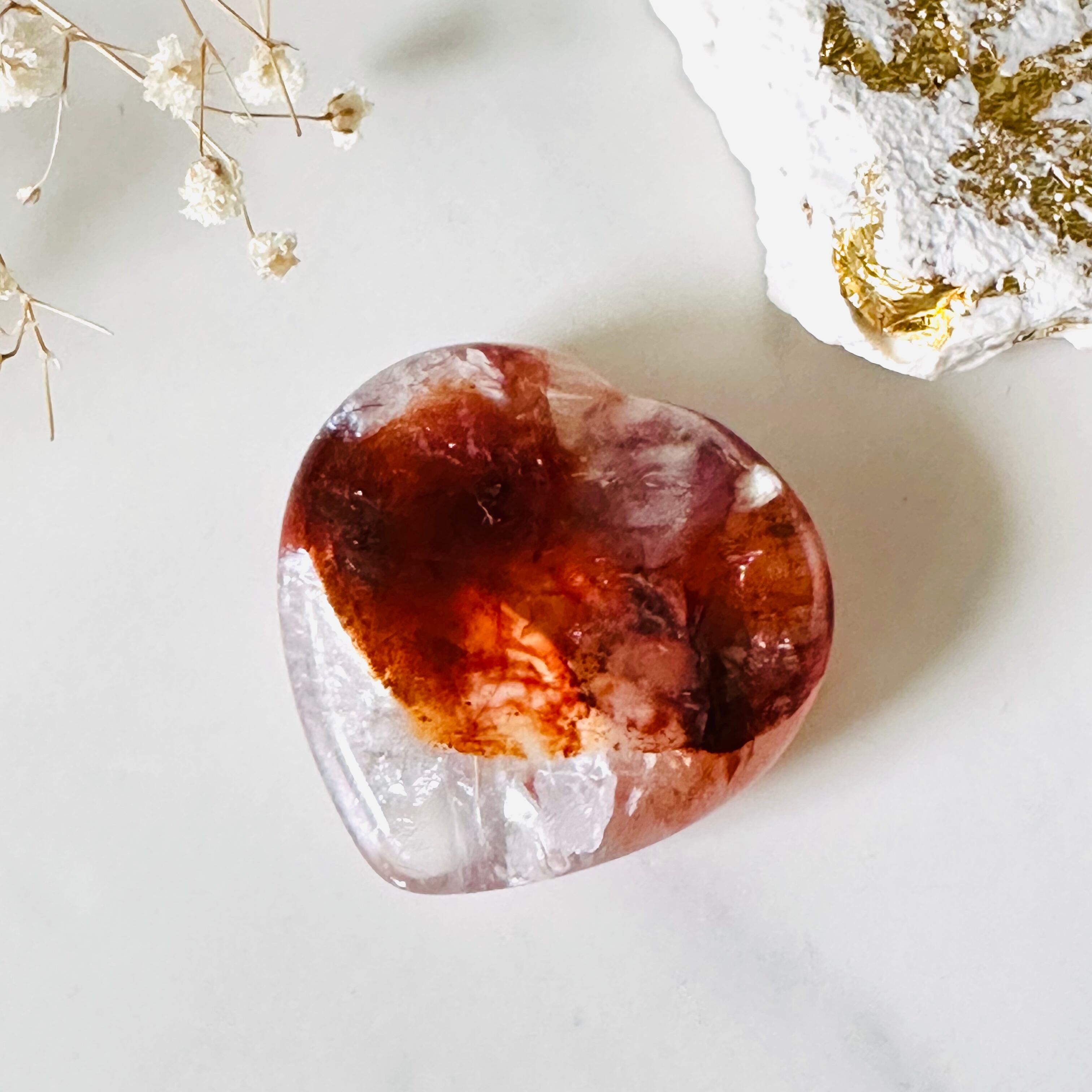 その色と形からは、地球の心臓や血液を連想させます。赤と透明なクォーツが混ざり合った美しい色合いで、虹が無数に煌めきます。愛と情熱、エネルギーを分け与えてくれる力強いアイテムです。胸の近くに忍ばせて持ち歩くのも良いでしょう。