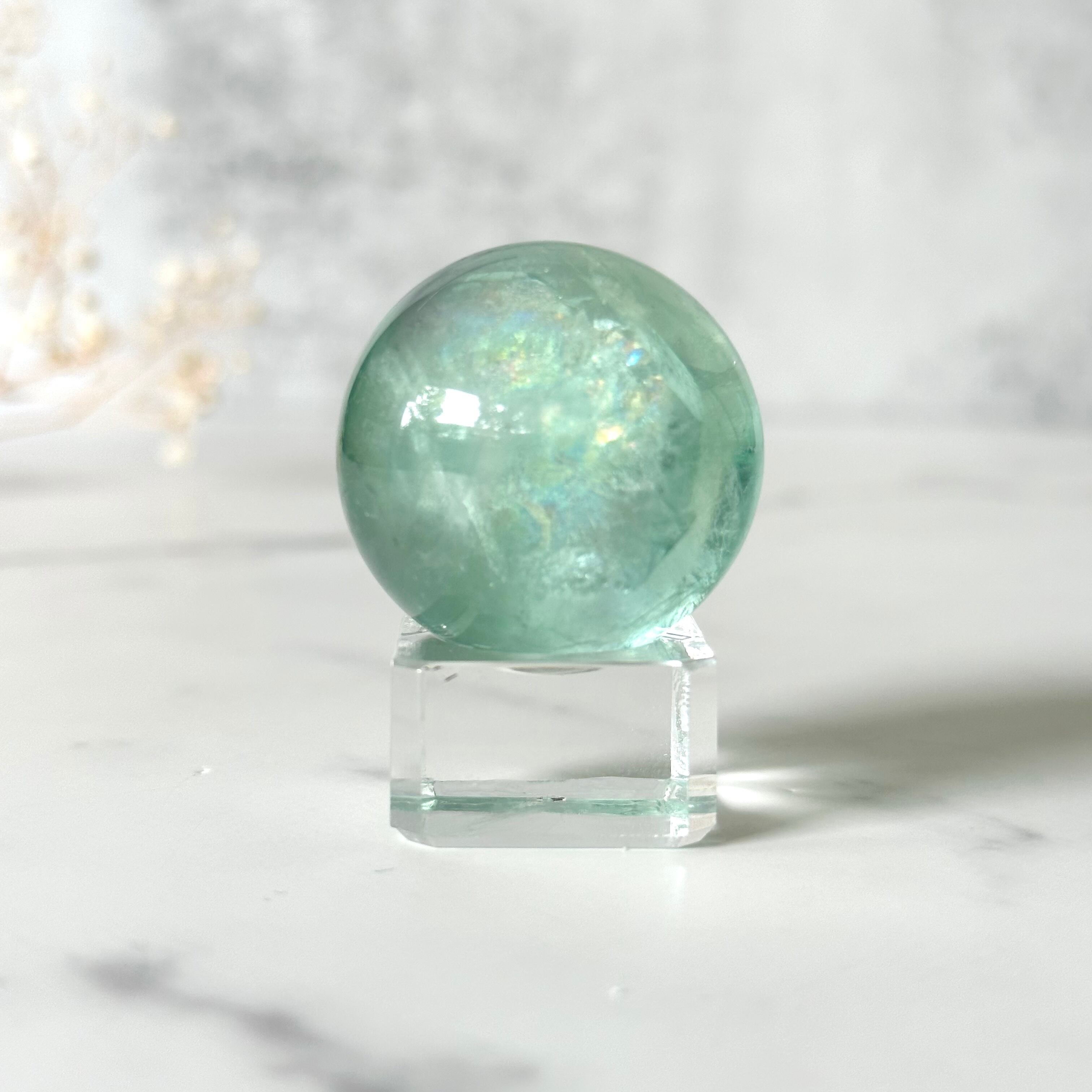 透き通った球体の内部には美しい虹がはっきりとみられ、角度によって魅惑的に変化します。緑色は見る人の心に深い癒しを与えてくれます。