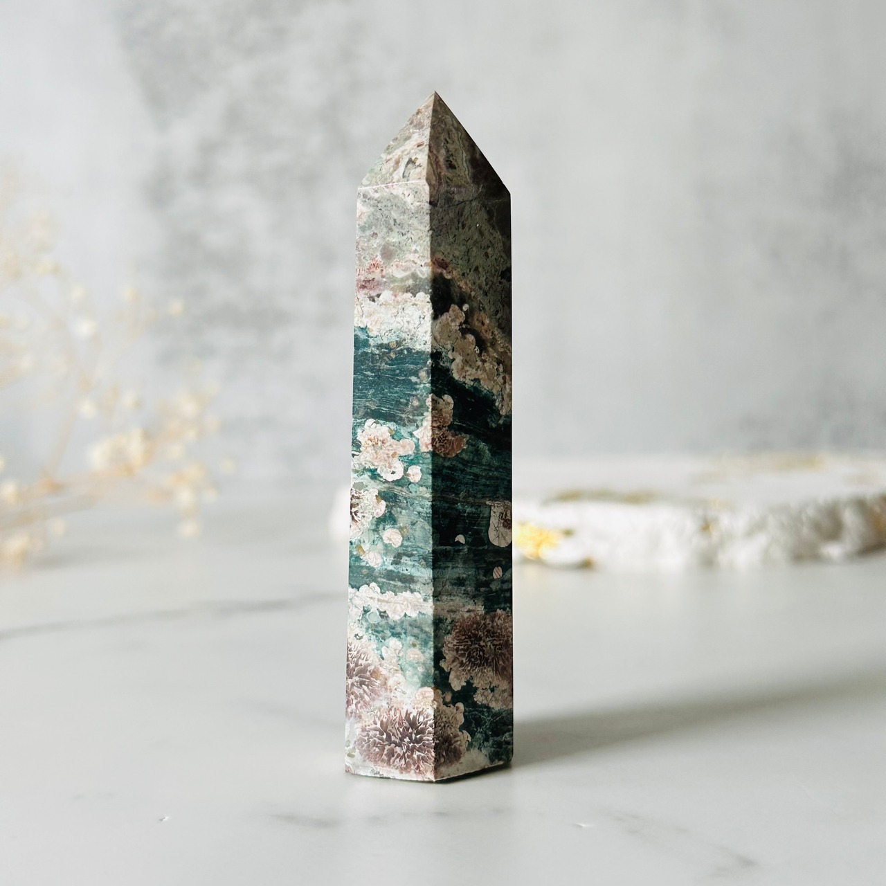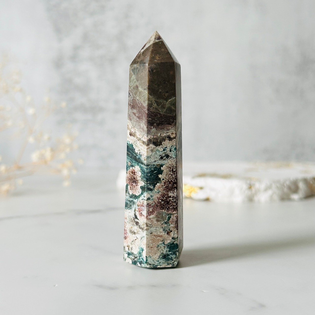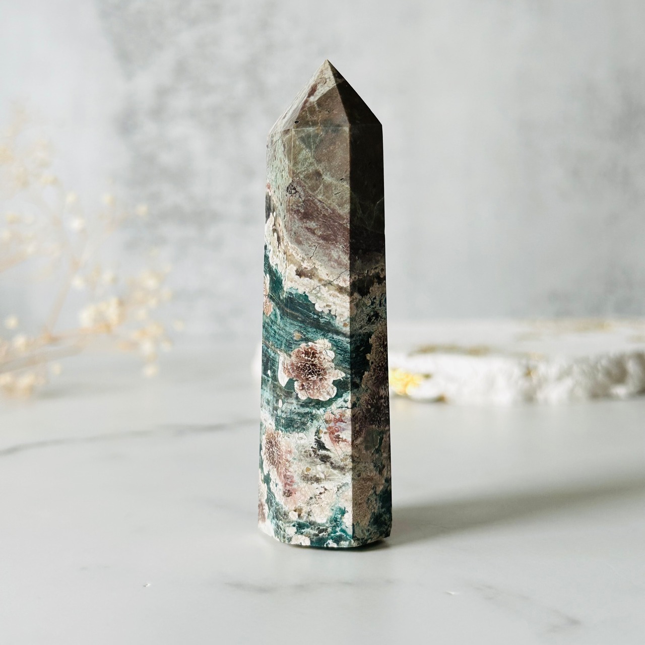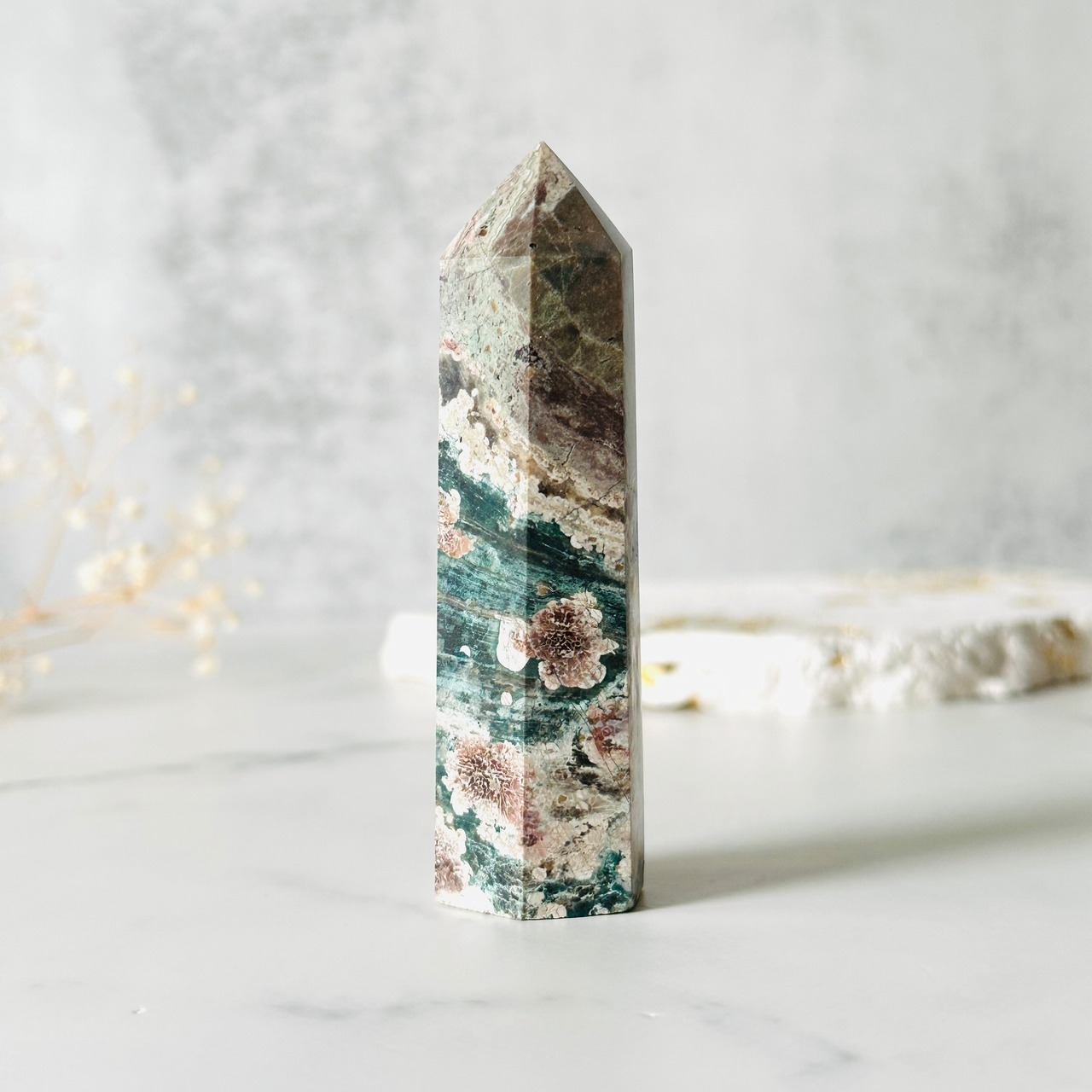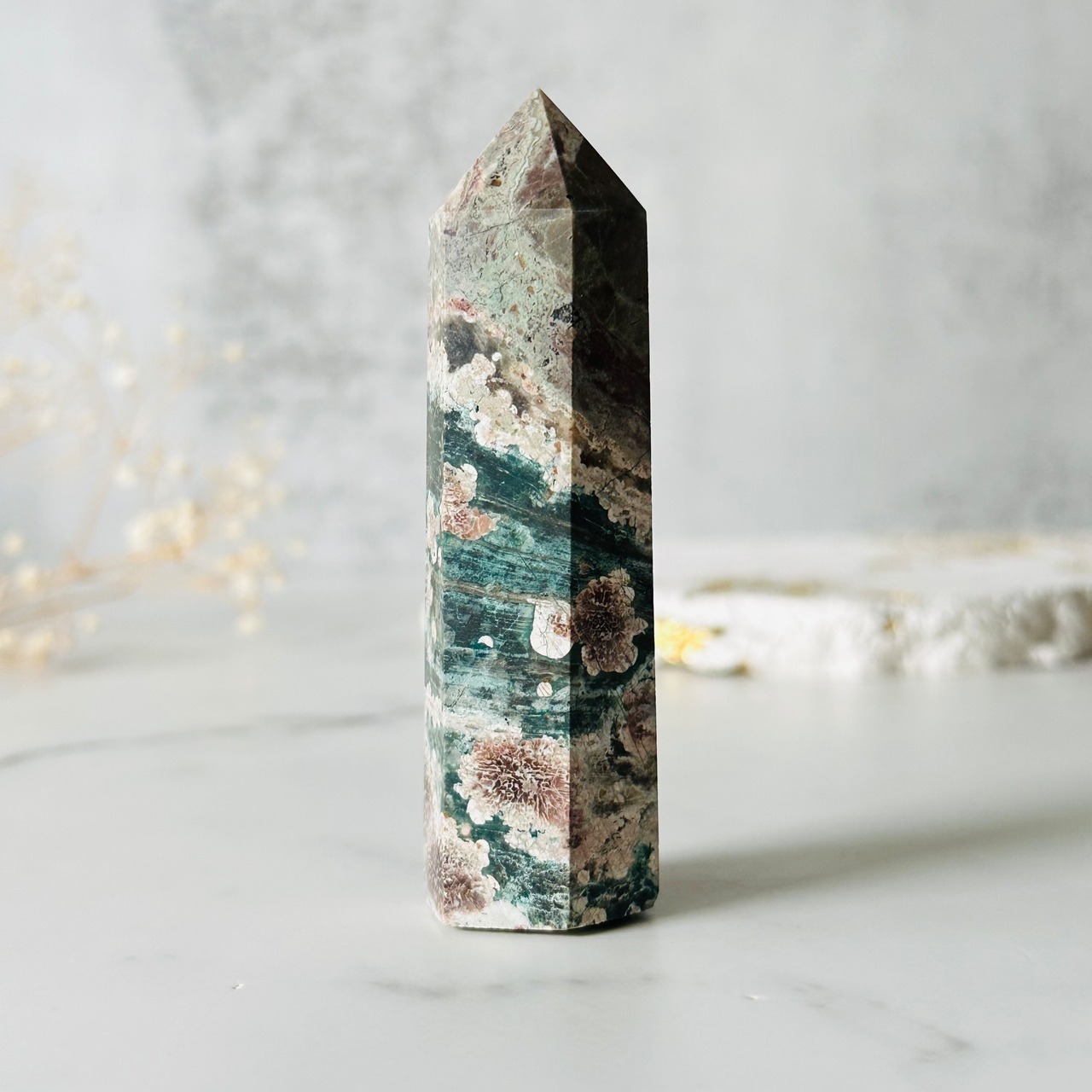 緑色のマテリアルに白やブラウンのお花が咲いたような模様が特徴の天然石で、ボタニカルでおしゃれな印象のある石です。