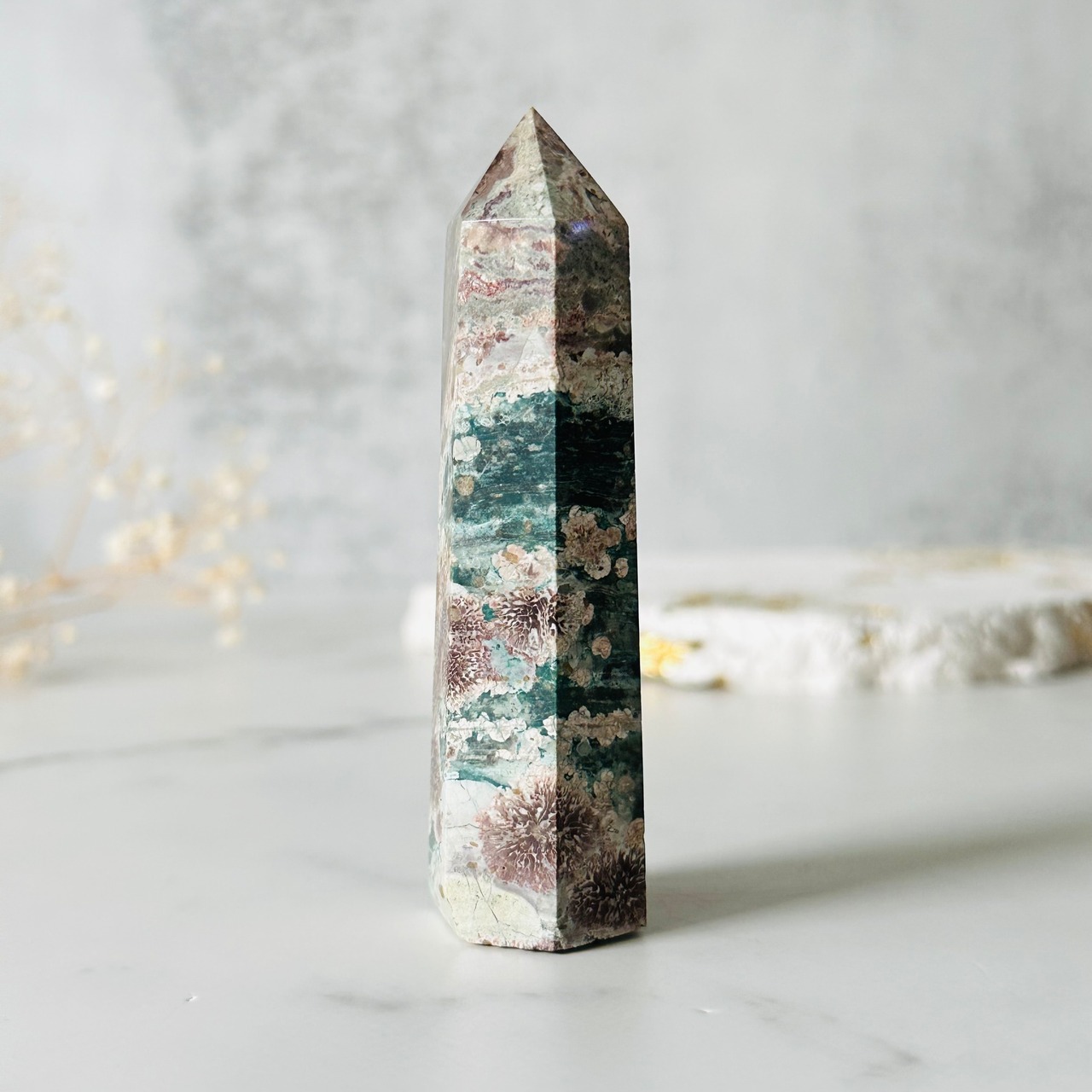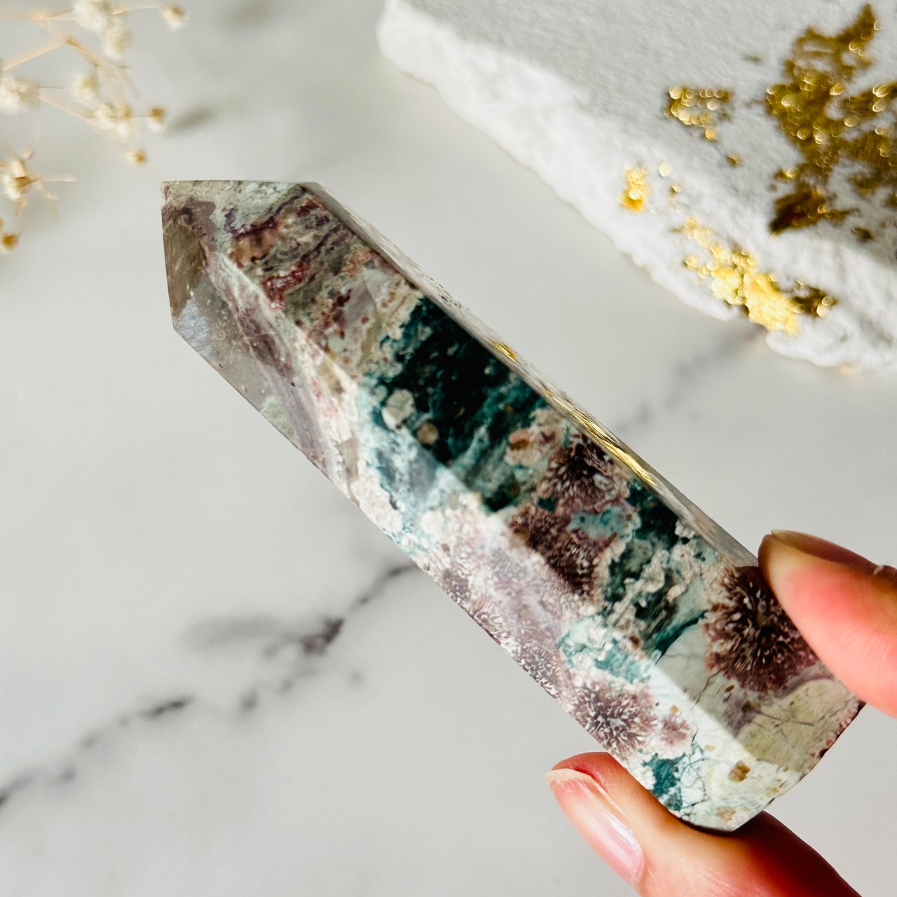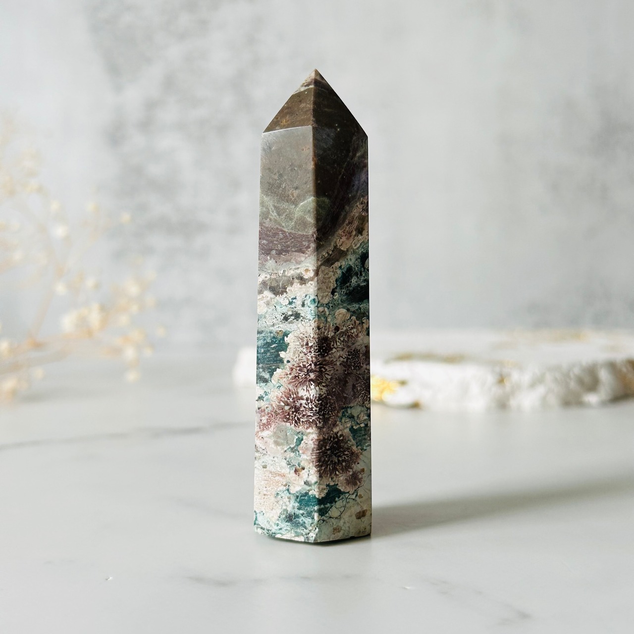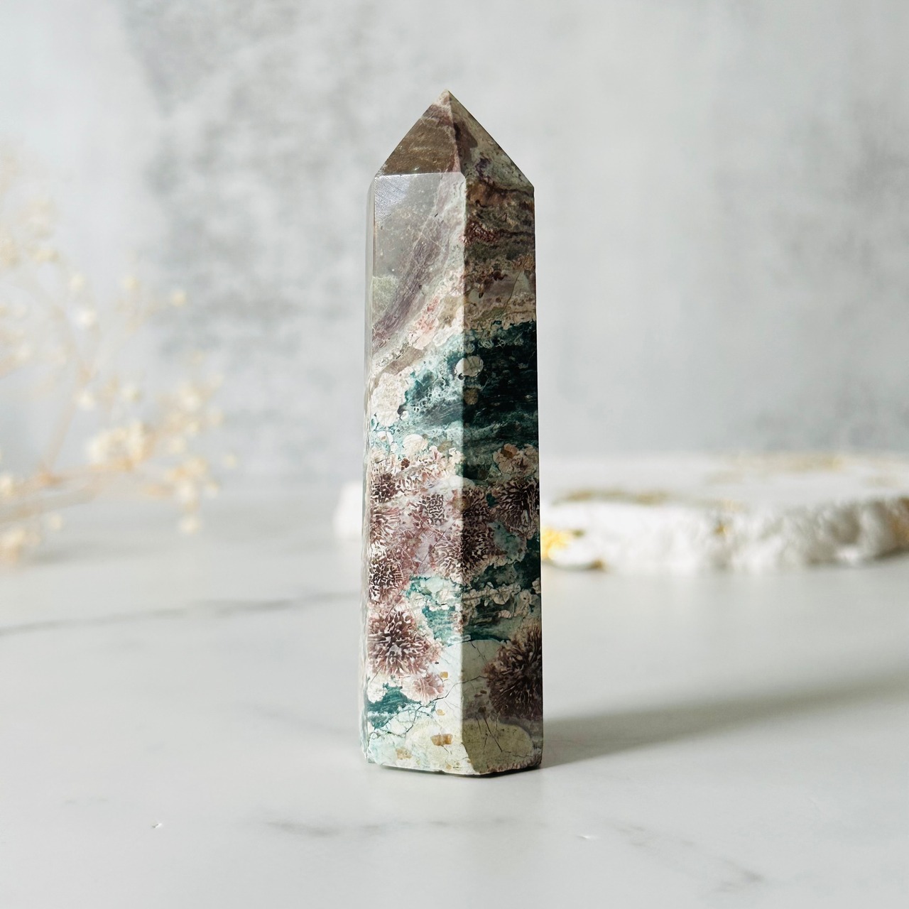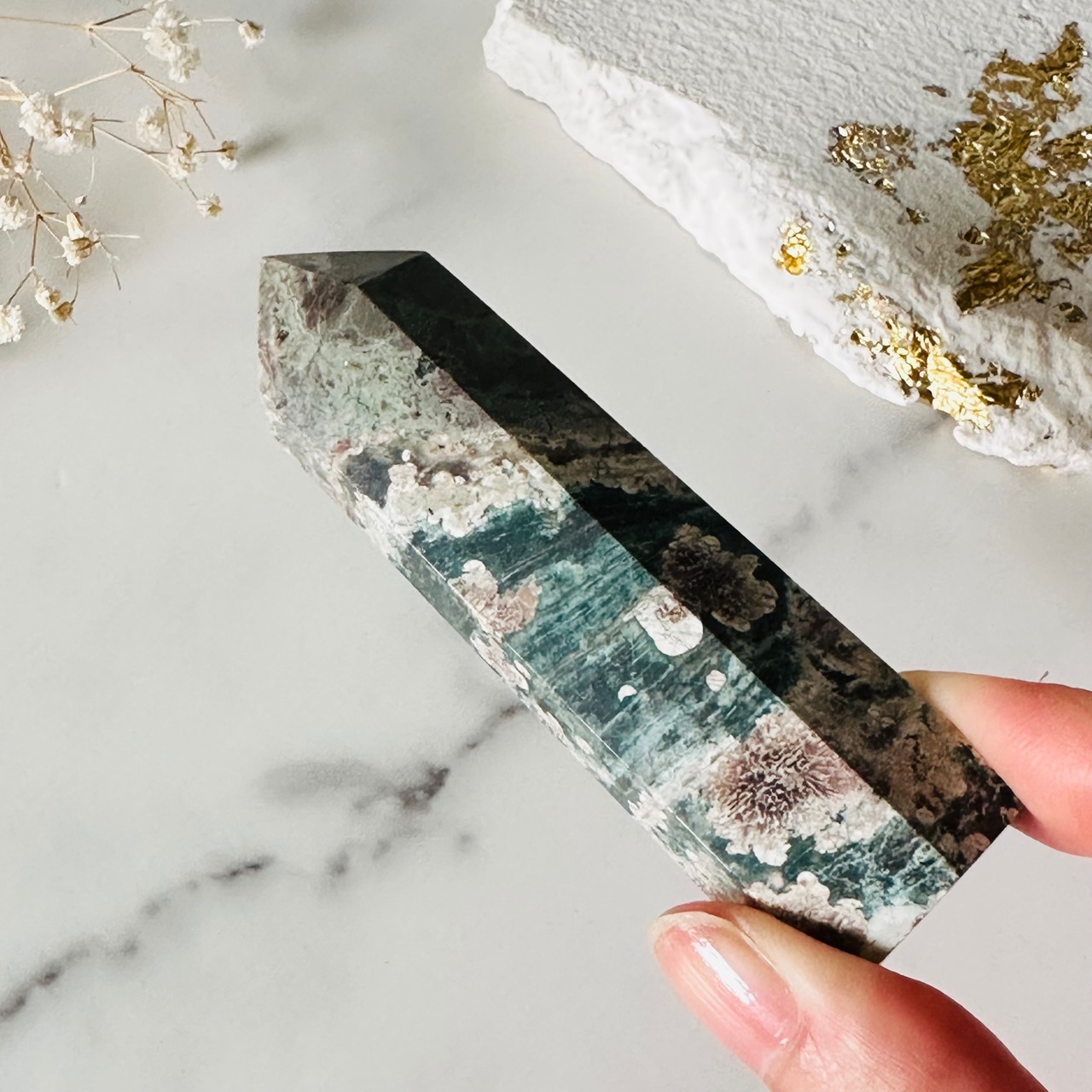 緑色のマテリアルに白やブラウンのお花が咲いたような模様が特徴の天然石で、ボタニカルでおしゃれな印象のある石です。