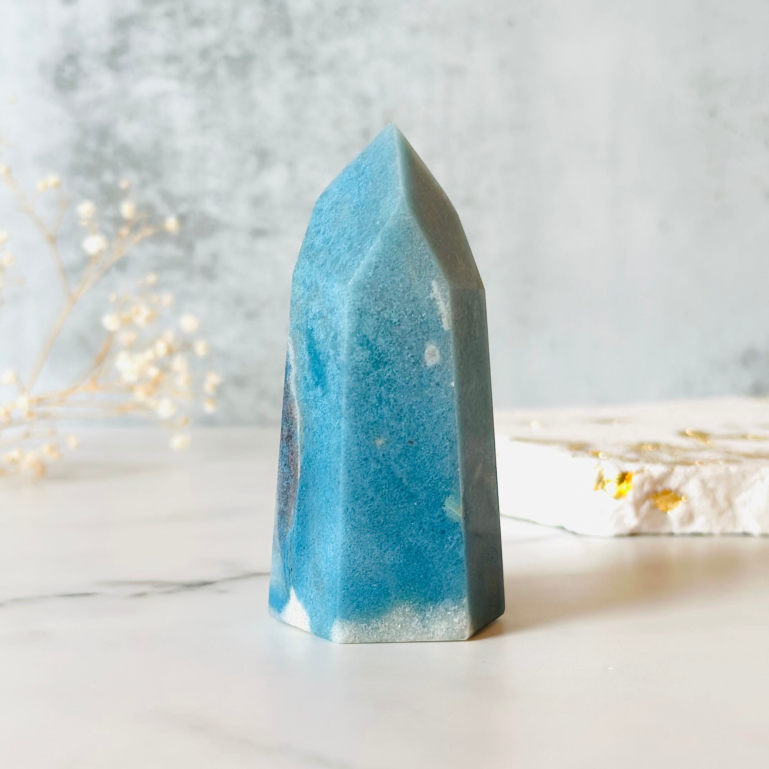 ブラジル産トロレアイトタワーです。ふんわりとした抽象的な印象のあるトロレアイト。絵本の中の世界のようにメルヘンで可愛らしく、どこか懐かしい気持ちにさせてくれる不思議な雰囲気を持つ石です。水色とグレーが混ざり合った美しい色合いが魅力です。