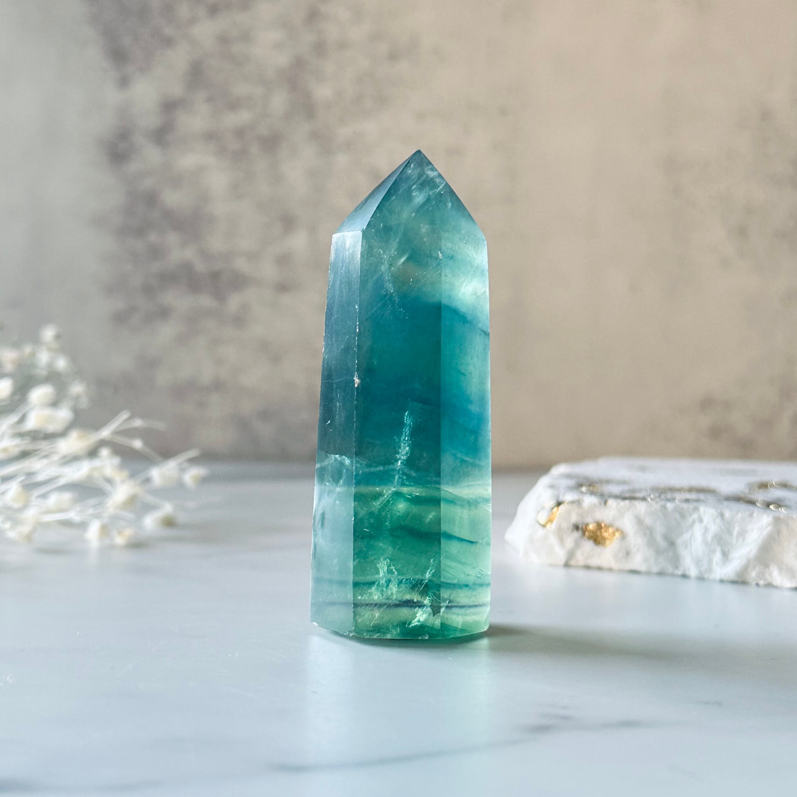 ブルーの陰影がきれいなブルーフローライトのタワーです。ブルーとグリーンの美しいグラデーションが楽しめます。美しい虹も入ります。