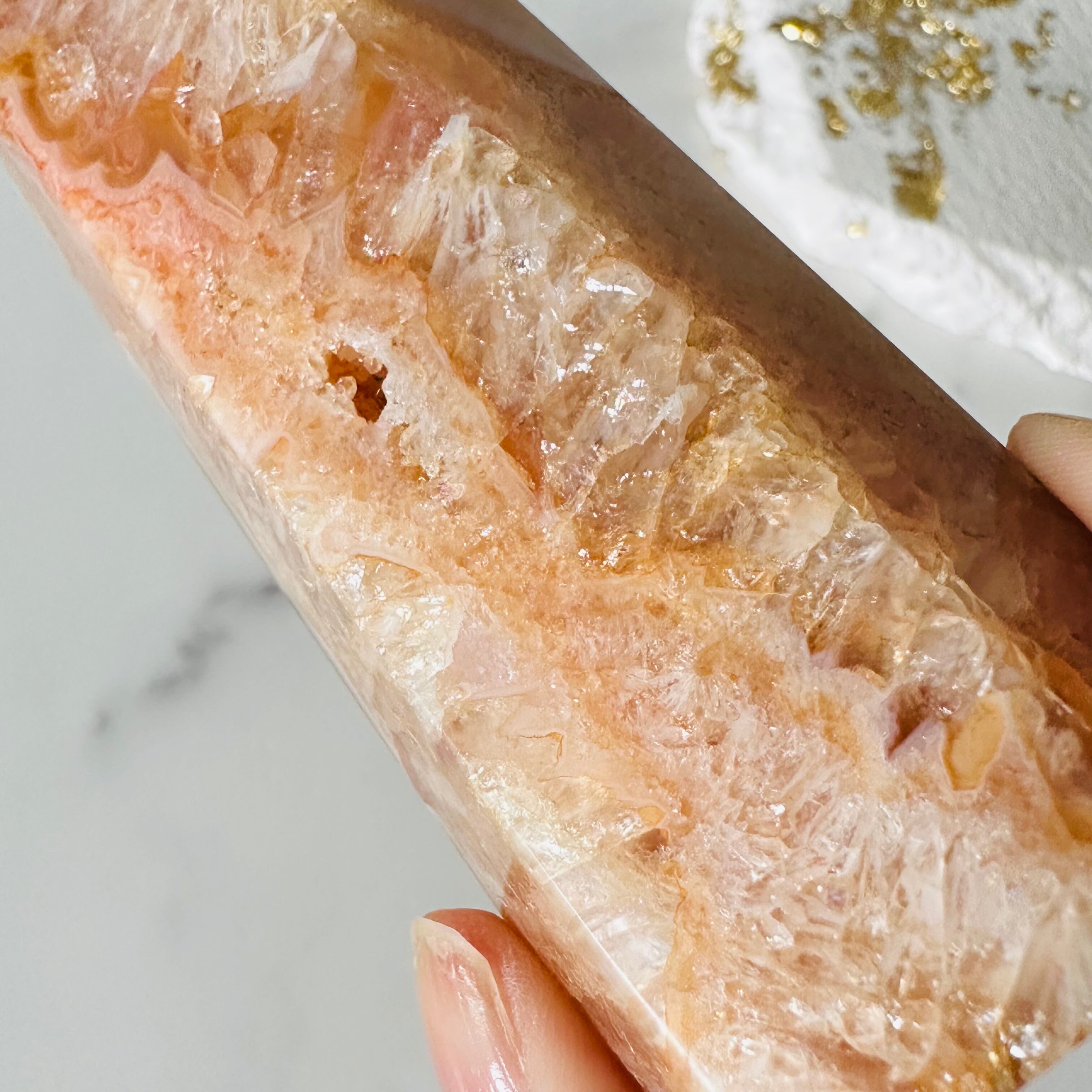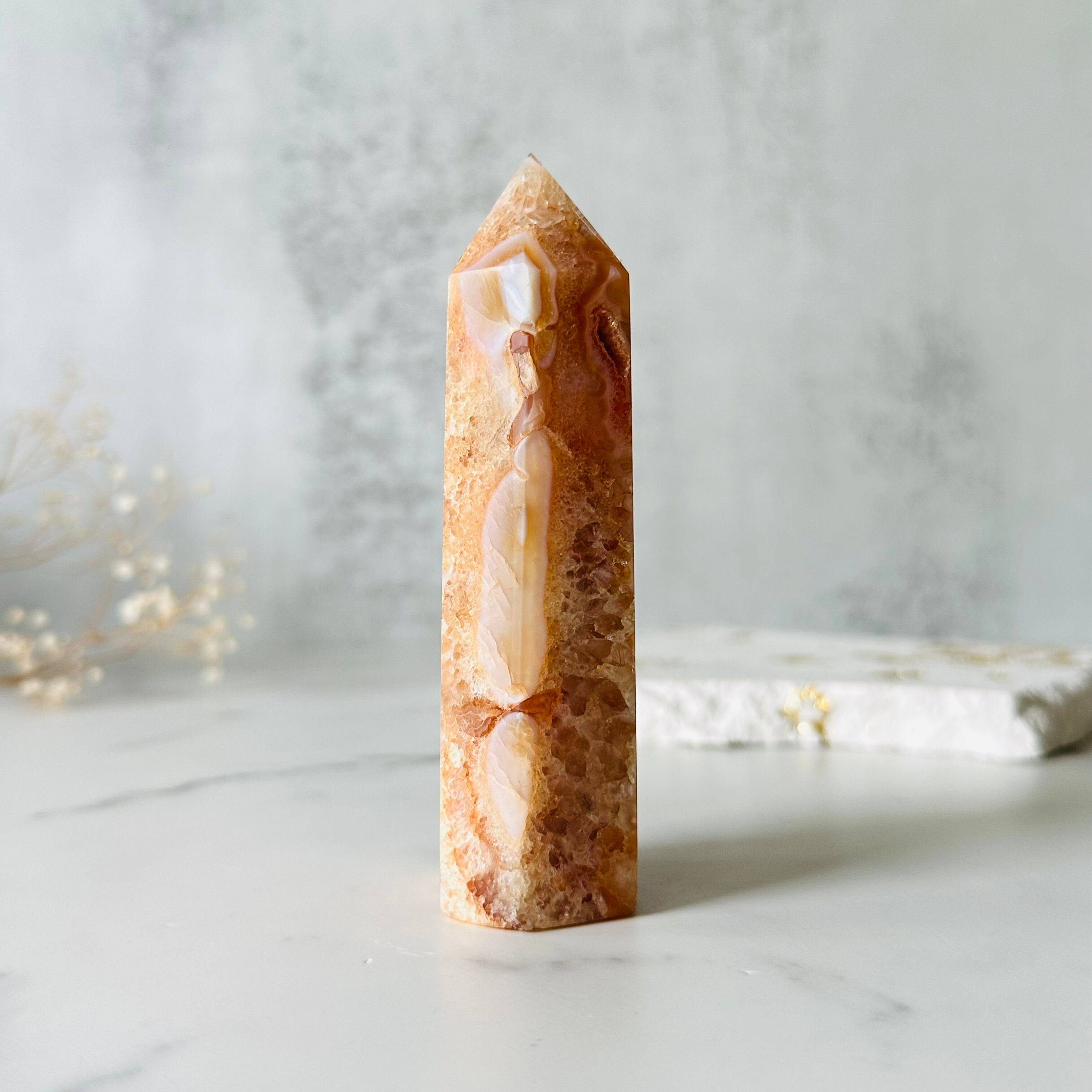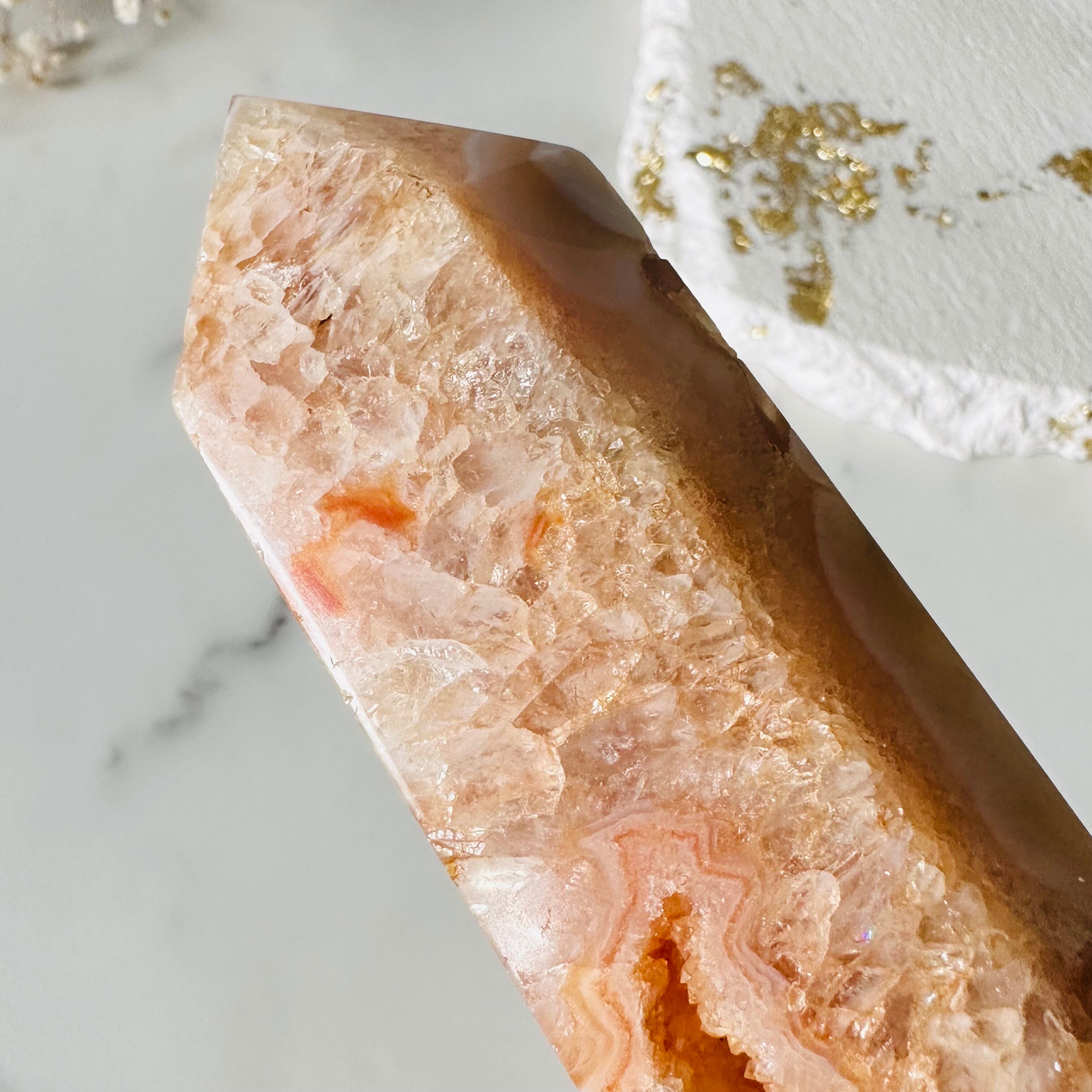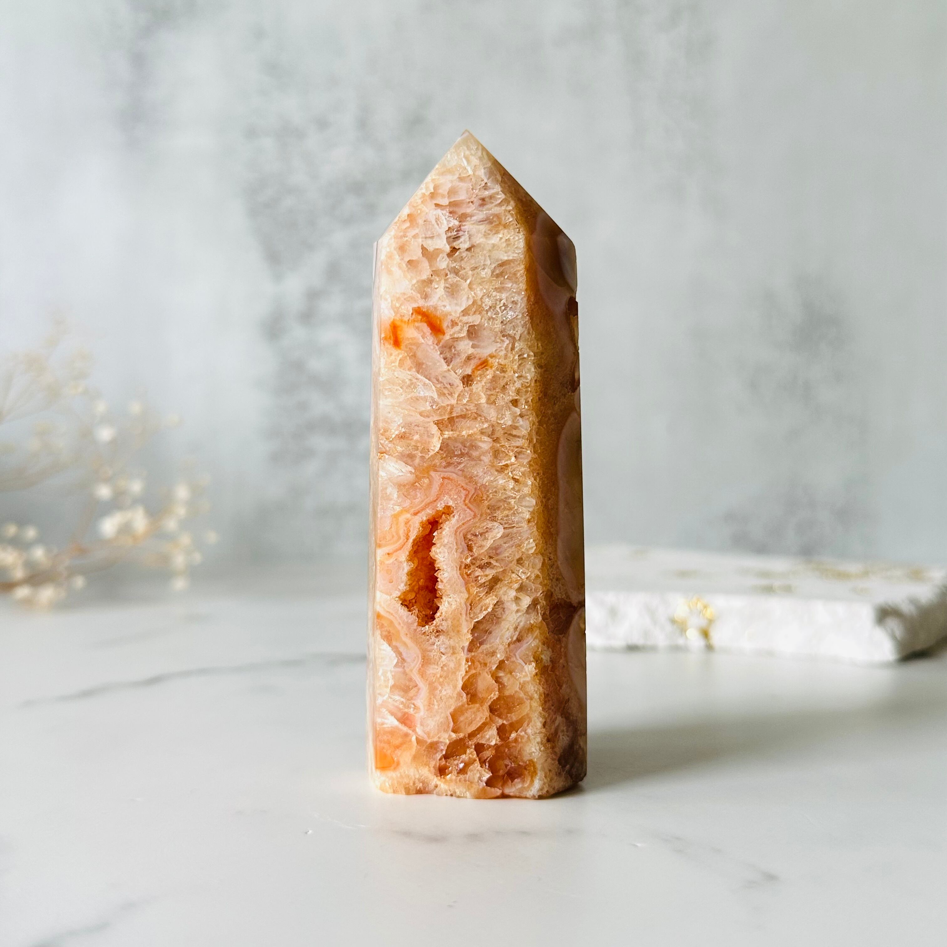 明るいオレンジ色の美しい結晶がザクザクと積み重なったカーネリアンタワーです。