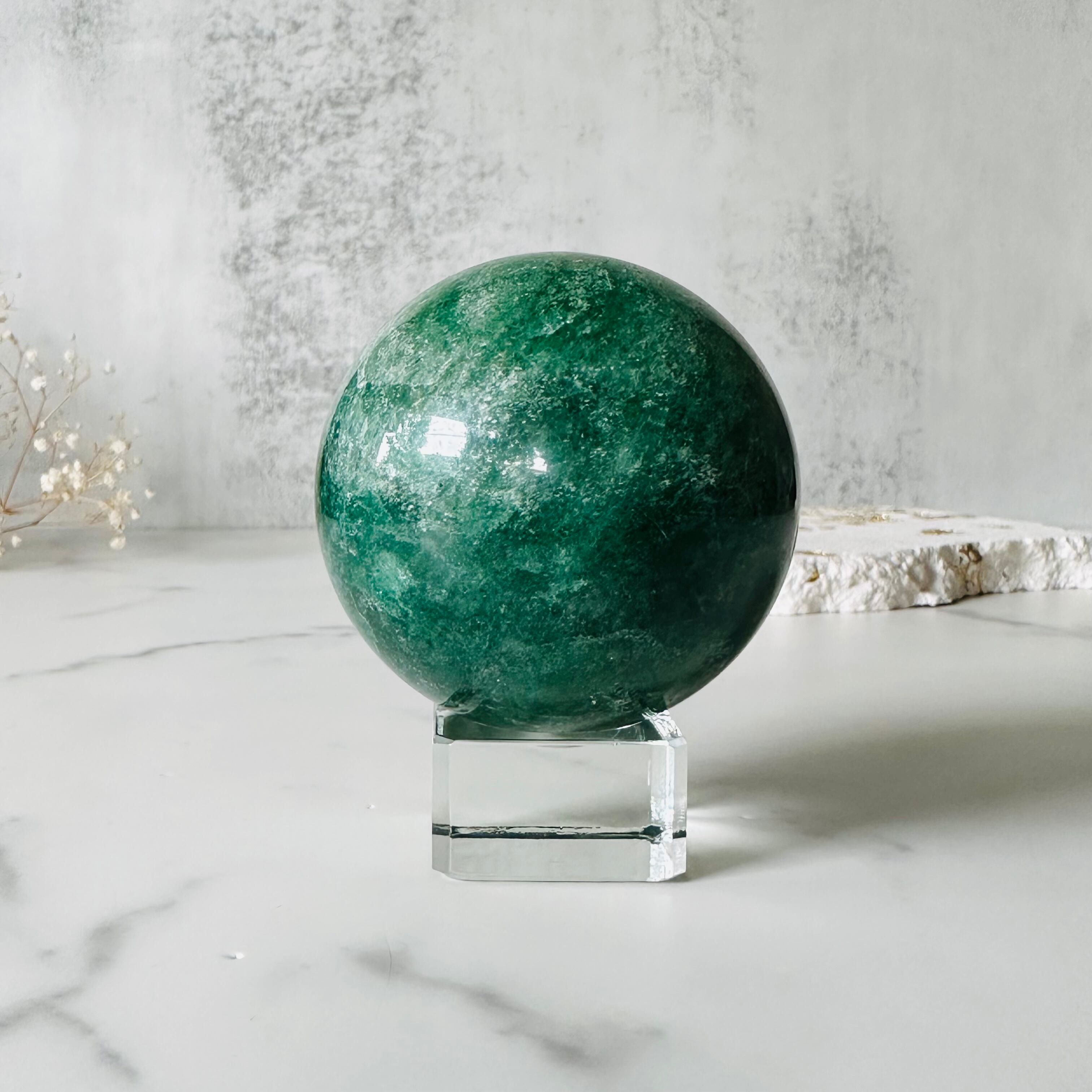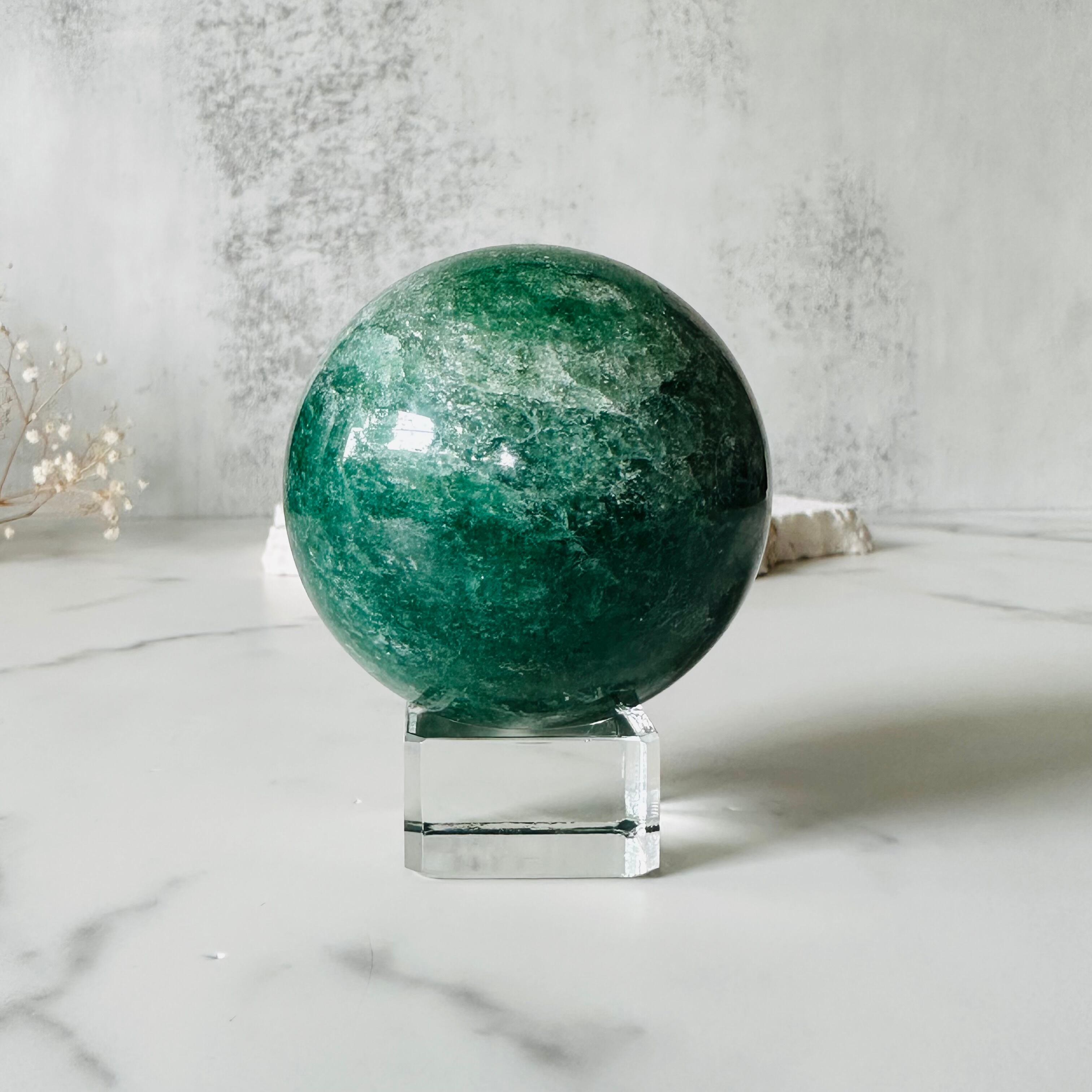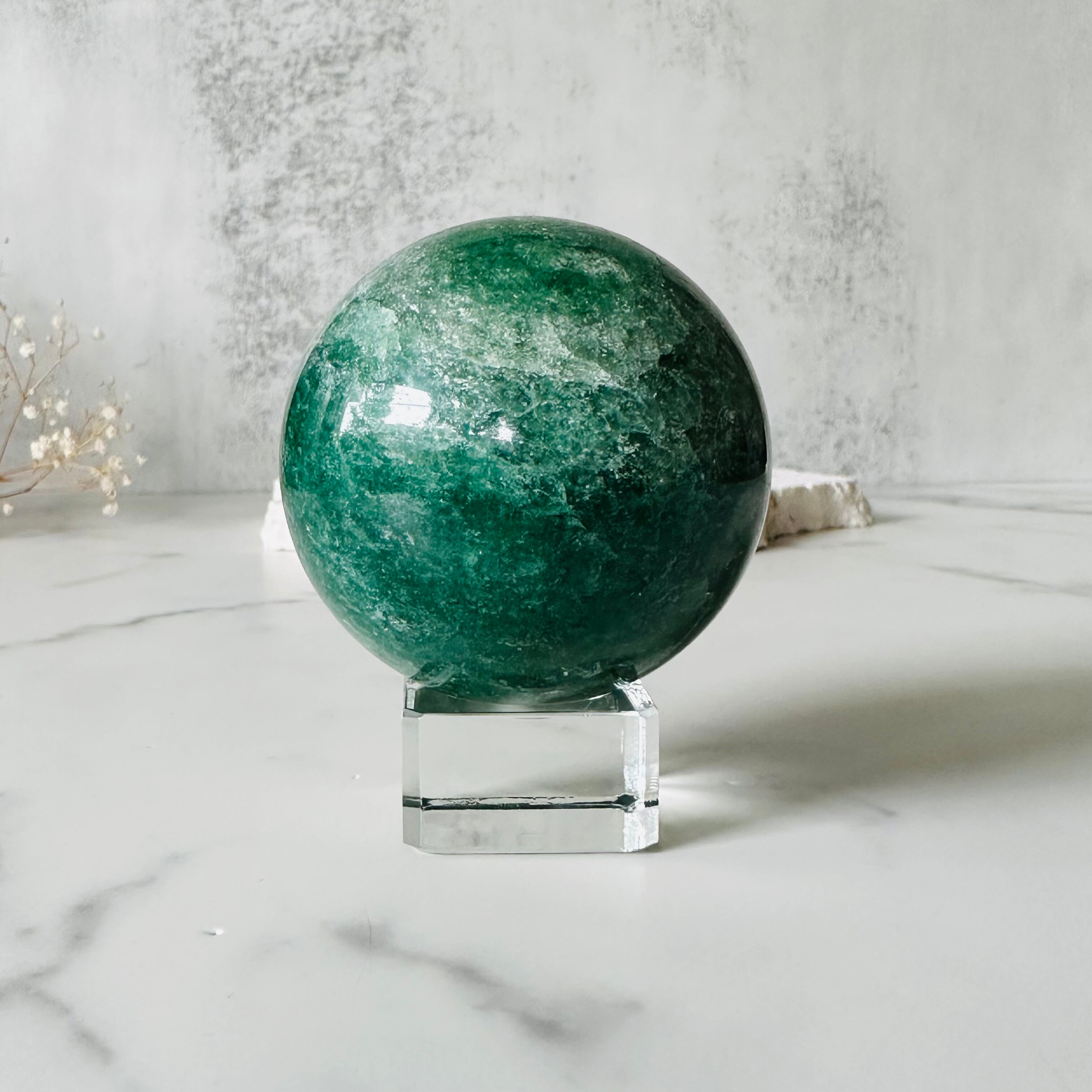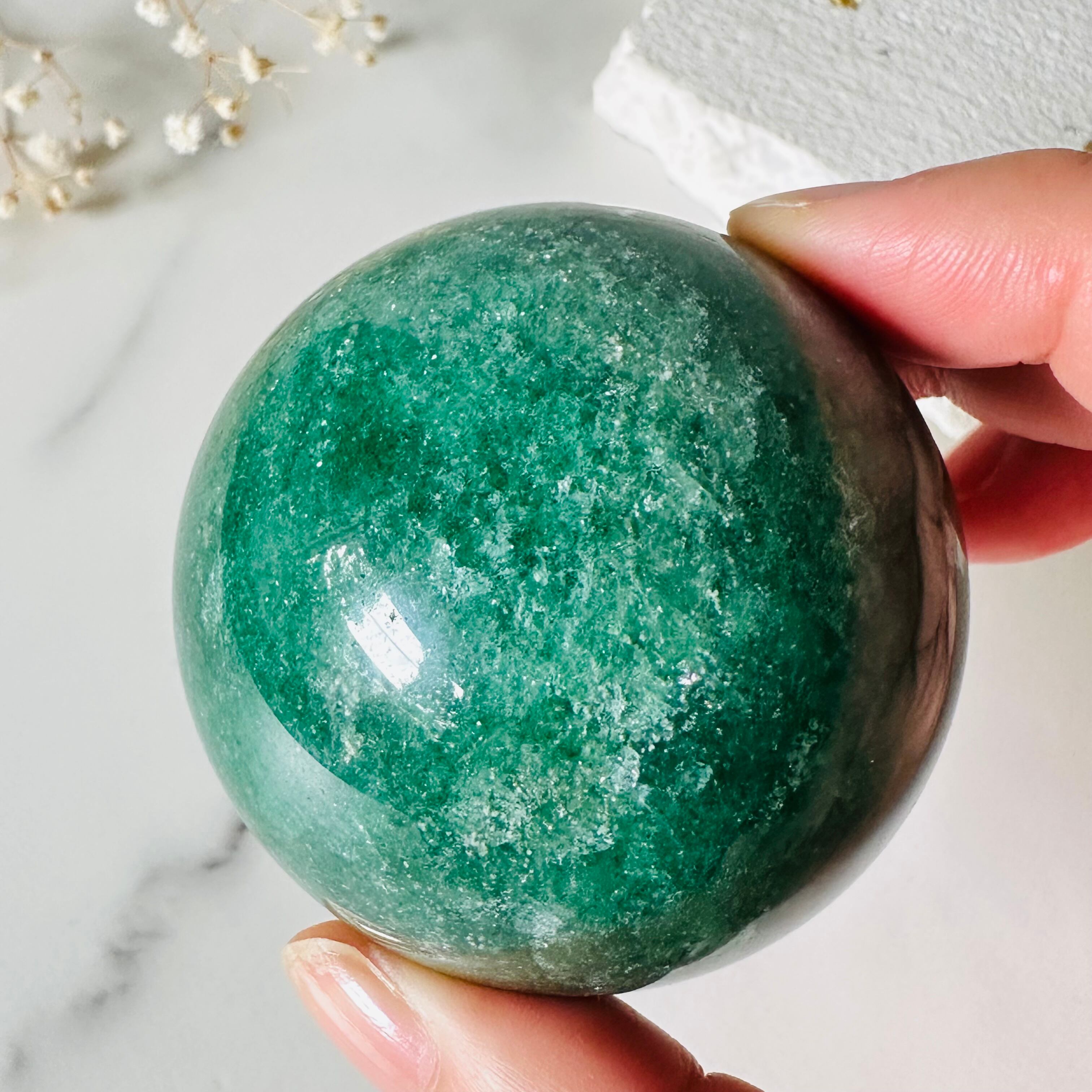 グリーンの発色が綺麗なグリーンストロベリーのスフィアです。「モテ」の石として大変人気があるパワーストーン。ストロベリークォーツの効果に加えて、グリーンは人間関係を穏やかにしてくれる効果もあります。小さな虹、無数のキラキラがあらゆる角度から楽しめるスフィアです。