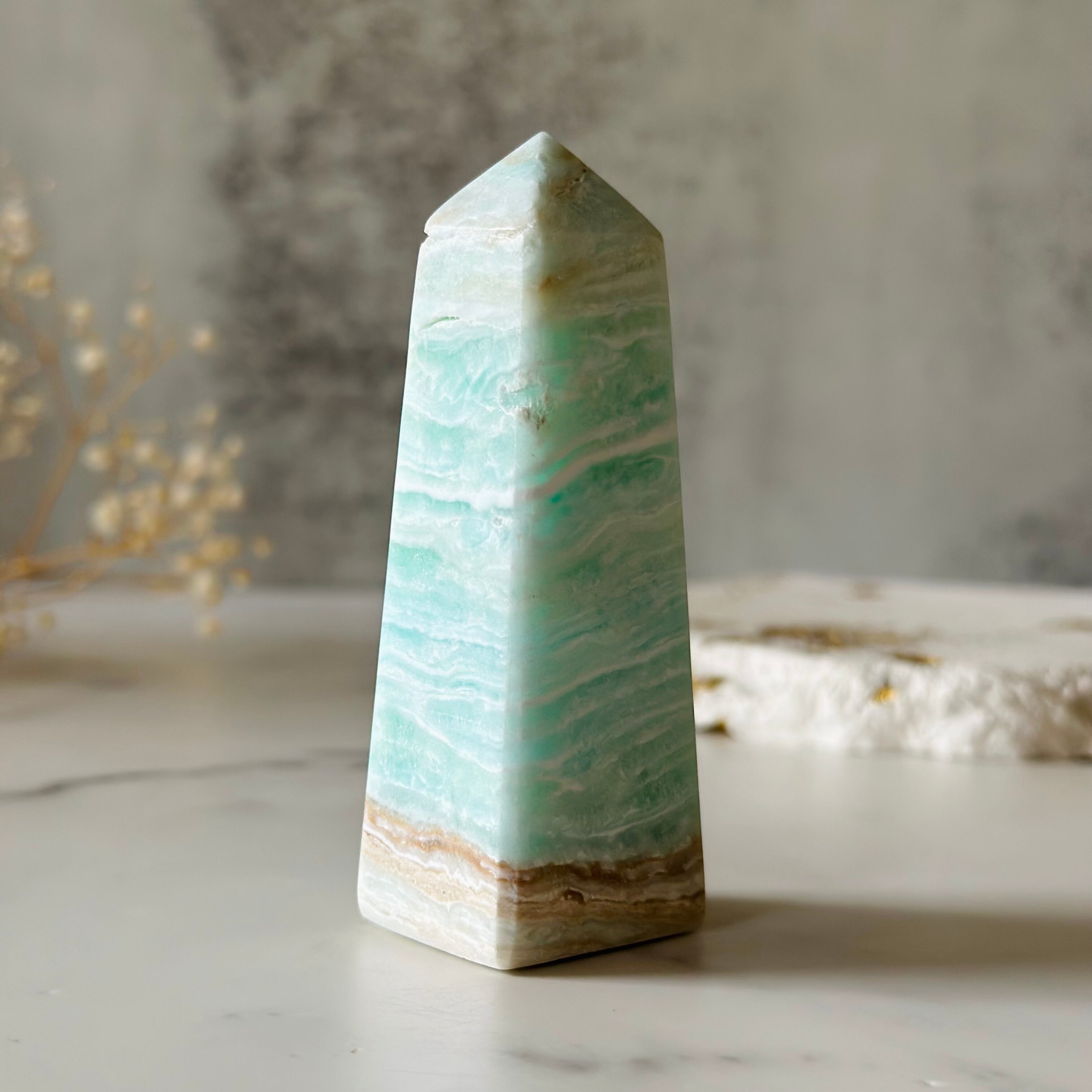 カリビアンブルーカルサイトは2019年にパキスタンで発見された新しい鉱石で、爽やかなオーシャンブルーと茶色の層がカリブの美しい海と砂浜を思わせる美しい天然石です。