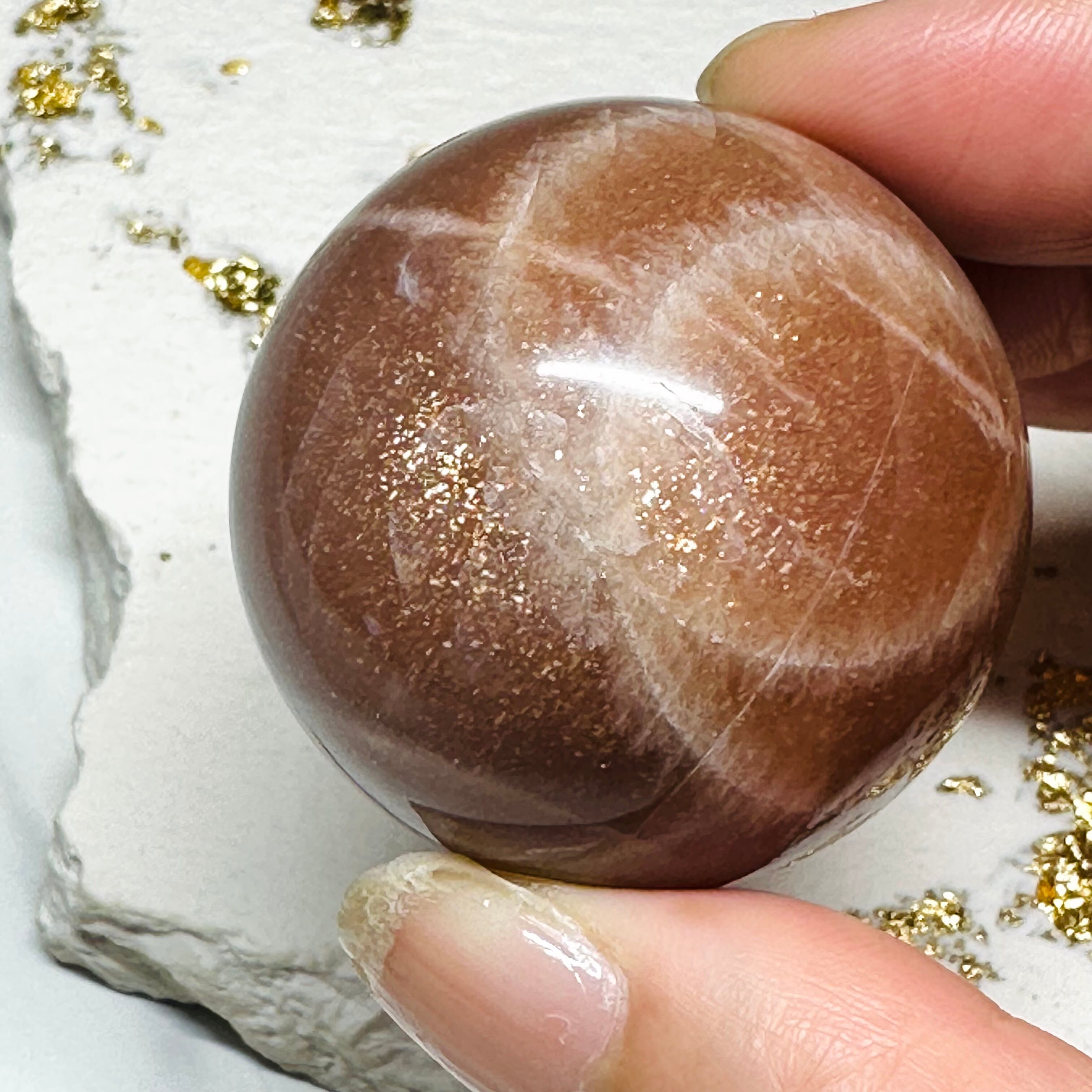 和名を月長石と言います。2種類のフェルドスパー(長石)の重なりによる干渉で、月のような幻想的な光(シラー)を放ちます。古くから月のエネルギーの宿る石としてお守りに用いられている石です。産地は様々で、その色合いも乳白色から、オレンジ、ピンク、緑がかった色、グレー、黒色など様々あります。